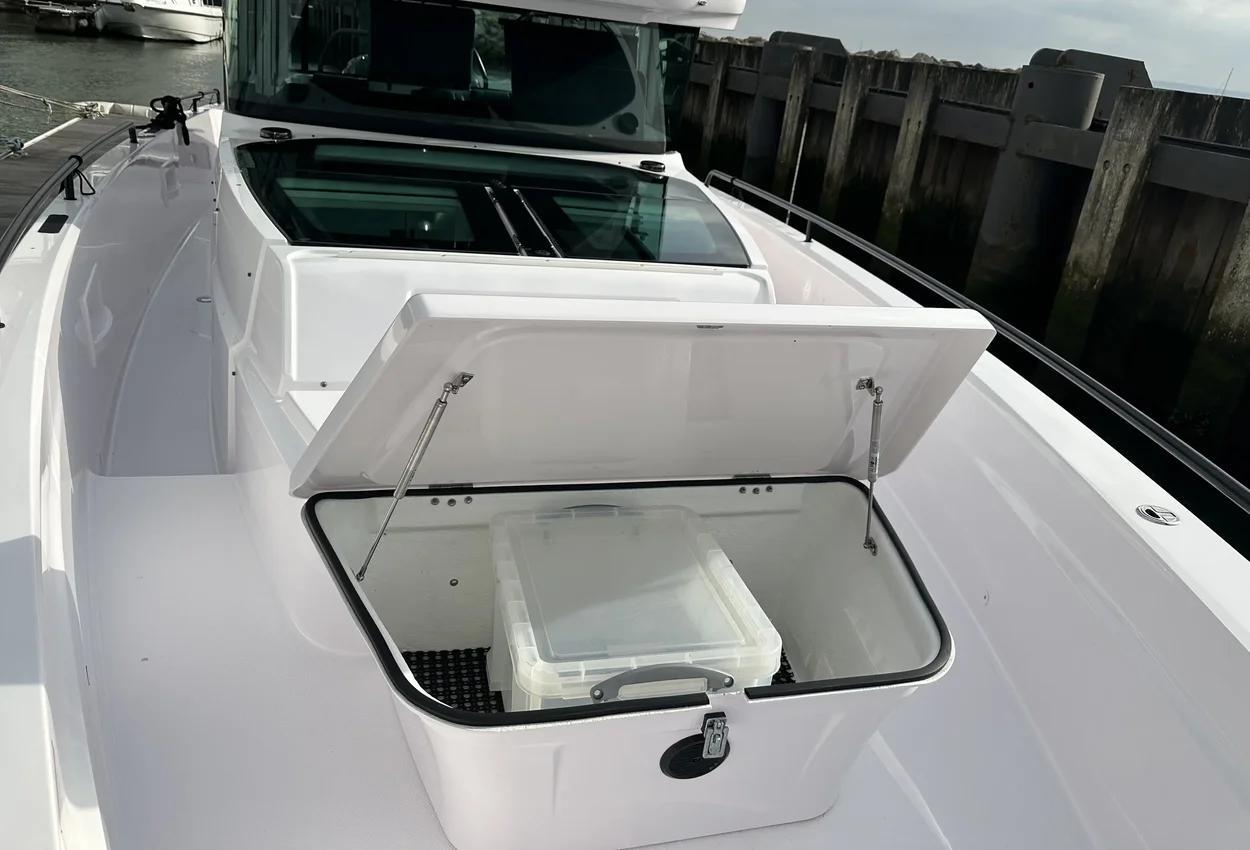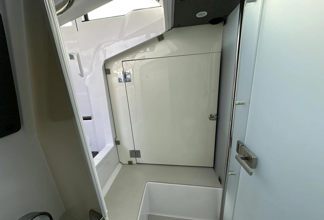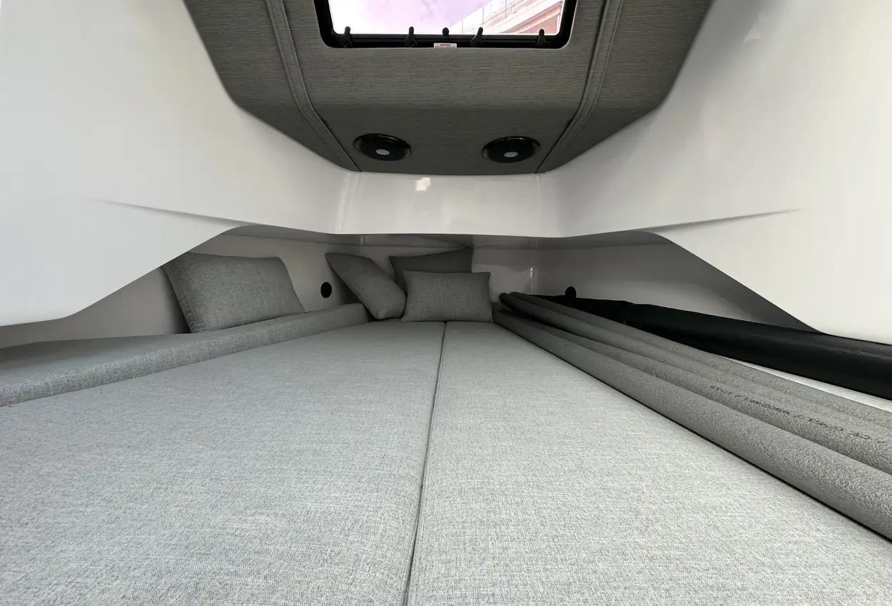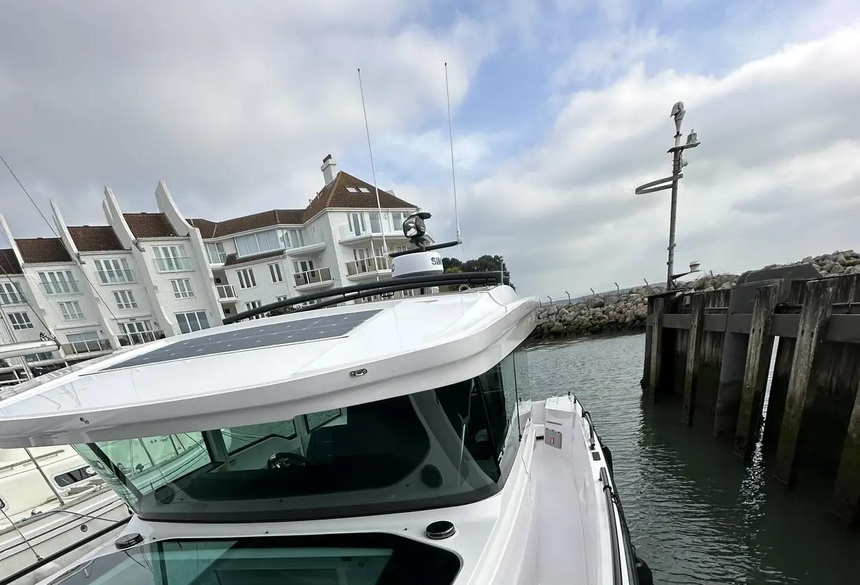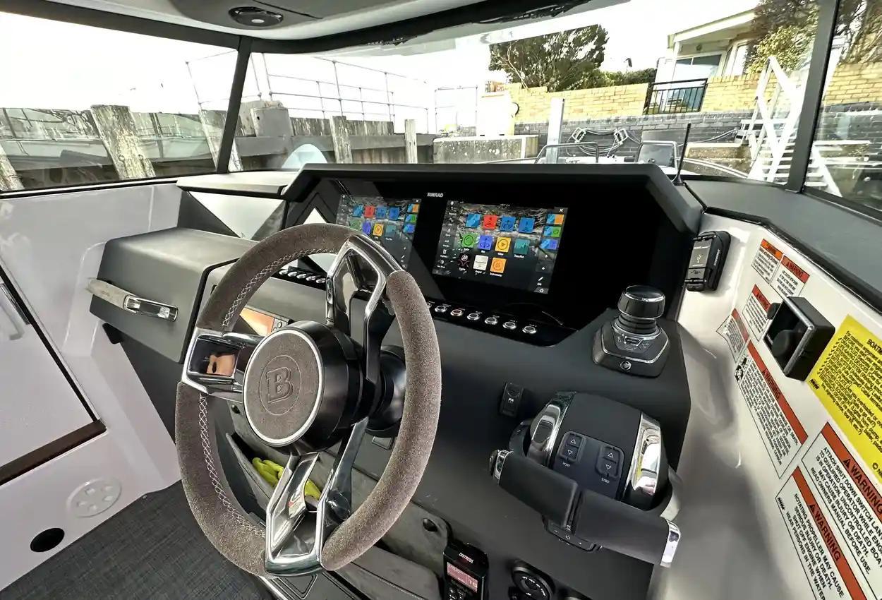 The Axopar 37 XC is designed to take on every season, offering a fully enclosed cabin to protect you from the elements. With twin Mercury Verado 330hp engines, it’s powerful yet comfortable, making it the perfect choice for year-round exploring. Whether it’s a crisp winter morning or a breezy summer evening, the Axopar 37 XC ensures you’re always ready to set sail.Incredible opportunity to purchase this Axopar 37XC Cross Cabin - Brabus Line! Experience power and comfort combined. Offering a huge spec, this is not a boat to be missed. View now in Poole 01202 679 421.Boat DescriptionHand laminated hull in Vinylester resin for the first coat for osmosis prevention of the hull in GRP materialTwin-stepped hull with “sharp entry bow”Integrated engine bracket in hull for outboard enginesFixed aluminium fuel tank 730l with overflow preventionFreshwater tank 100lHeavy-duty rub rail with rubber end caps in greyHeavy-duty rub rail around swim platformsAxopar 3D signature chrome logo on both sides of hullBow thruster tunnel preparation in hullWalk-around deck layout with open aft deckAnti-skid finishing on working deck areas and deck hatchesSelf-draining deck area with quick drain aft deckAll hardware, pulpits, locks, hinges, filler caps & cockpit grab rails in 316 stainless steel8 x cleats on aft, midships and fore deckAdditional hooking points for safety harness around side deck areasFore deck pulpits, shortLED navigation lights on fore deckSpacious anchor locker with drainage in bowRope holders in anchor locker on fore deck & fender storagesSofa with backrest on fore deck including harbor coverLarge skylight with harbor coverFlush mounted 2 x skylights including harbor coverCurved & toughened glass wrap-around windscreens and side windows in light green tint with illuminated 37 signatureFully enclosed cabin with extra wide & lockable sliding doorsRoof structure in white GRP with large opening canvas roofHarbour cover for opening canvas roof2 x integrated & interlinked windscreen wipersWindshield washer with separate reservoirGrab rail under coach roof on aft deckIntegrated boarding steps on both sides of helmFoldable light mast in white painted aluminium with anchor lightTwin large fender storages on aft deck with insulation/cooler boxesAft deck with large storage compartmentBattery/electrical compartment under aft deck storageFlagpoleSignal hornTwo electric bilge pumps with auto-functionManual bilge pump for aft deck sectionTrim-tabs with joystick controlSide railsIntegrated swim platforms and telescopic bathing ladderFront CabinFront cabin with L-shaped lounge sofa & seatingLarge queen size bed with soft side bolstersAll upholstery in Torres Grey fabricRoof panels in Vintage Steel fabricPortlight towards fore deck with openable hatchMirror in forward bulkhead2 x foldable wooden shelves beside the bedCabinet upholstered in Vintage Steel fabric with wenge topMirror above cabinet4 x pop up clothes hangersBuilt-in electric flush toilet under L-sofa with septic tank 70l and deck/hull outletsMain 12V fuse panel with automatic fuses12V & USB outlet in front cabinFire & CO2 alarms6 x LED roof spotlightsLED roof light strip between skylightsTwo manual “mushroom” roof ventsCarpet in blackBRABUS LineBRABUS Line Color Edition, Miami BlueBRABUS Line Color Edition, Platinum GreyBRABUS Performance LineAdditional FeaturesKitchen Module in cockpitToilet compartmentFixed sun bed on foredeck with coversX2 12" Glass helm Simrad information displayRoof barsNavigation OptionsChartplotter Simrad NSS 12Information display twin 12Twin Chartplotter Simrad NSS 12"Echo sounder, Activeimaging 3in1Echo sounder, thru hullSimrad VHFRadar Simrad Halo20+