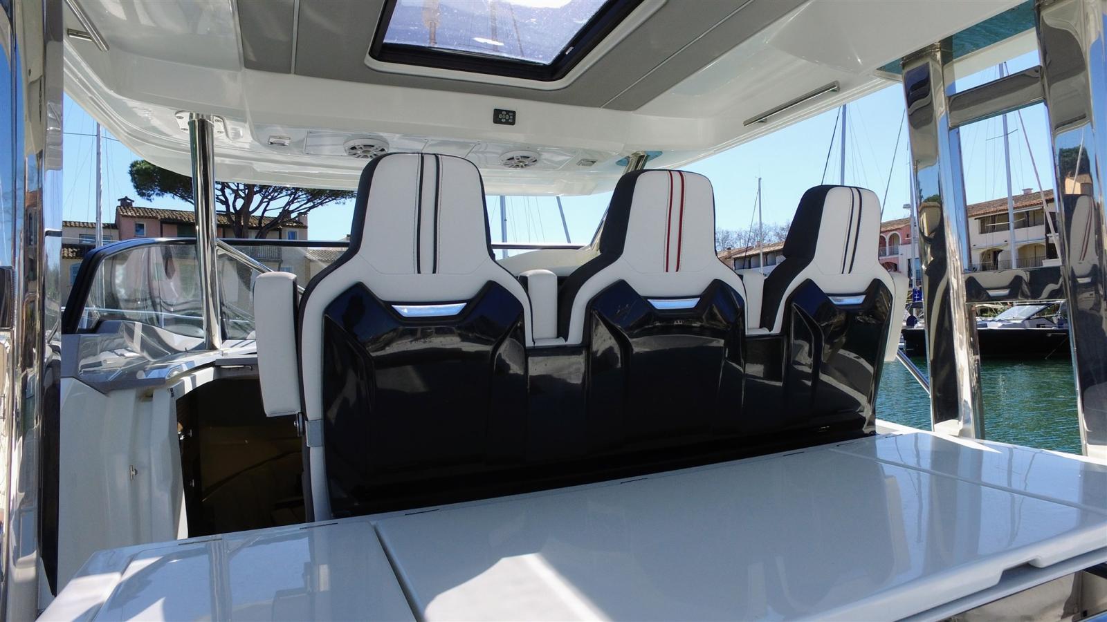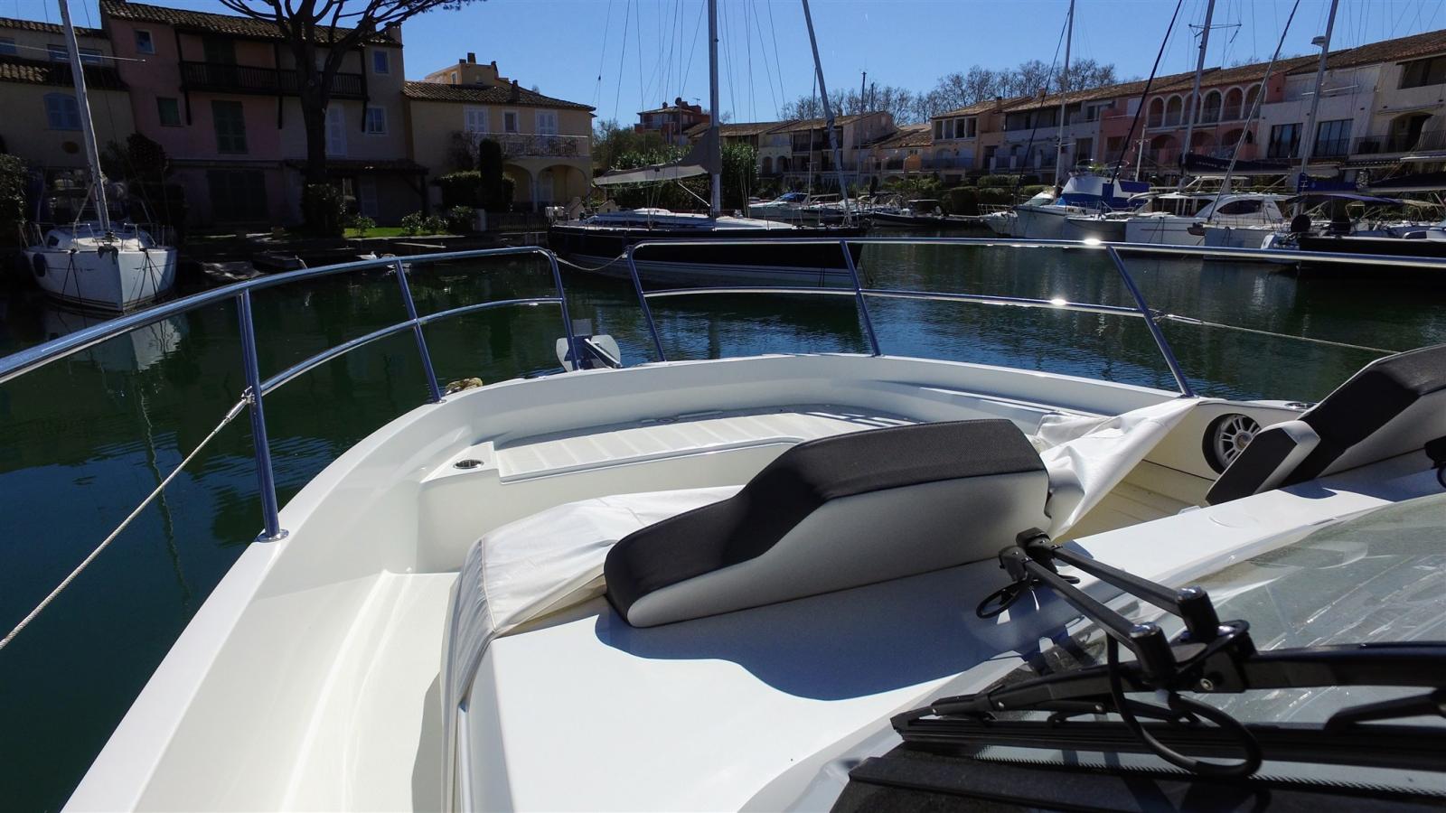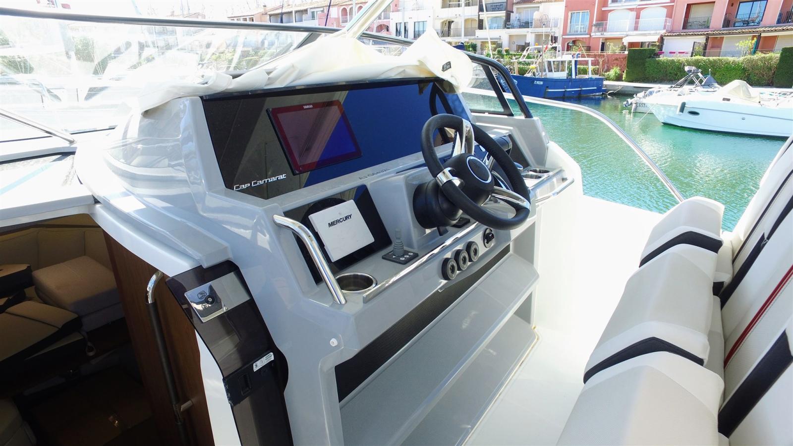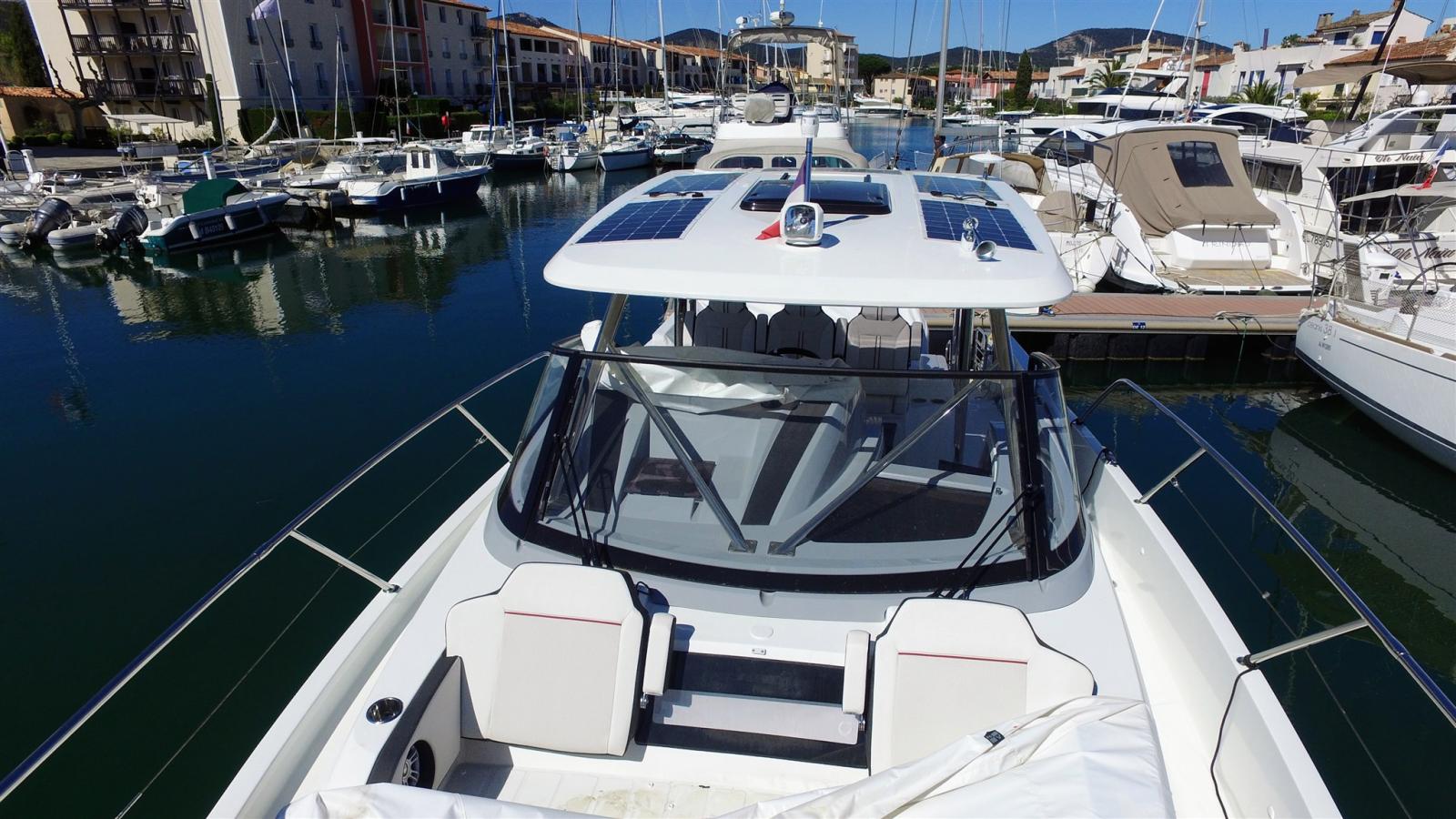 Engine Alarm, Anchor (16kg 28m de chaine de 10 et 40m de cablot - Ancre virtuelle), Water pressure pump, 4 Batteries (lithium), Deck Shower, Headlights fixed on the stem (et avant), Directional Spotlight, Electric Flaps (Lenco), Washbasin in the cockpit, Courtesy Lights (de cockpit et intérieur), Solar panels, Platform (et latérale amovible), Automatic Bilge Pump, Shorepower connector, Water harbor connector system, Electric Windlass, swimming ladder, cockpit table (avec bain de soleil et table avant), T-Top (rigide avec parbrise bas).