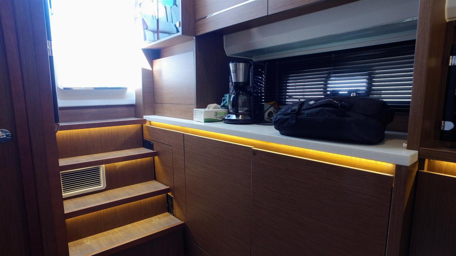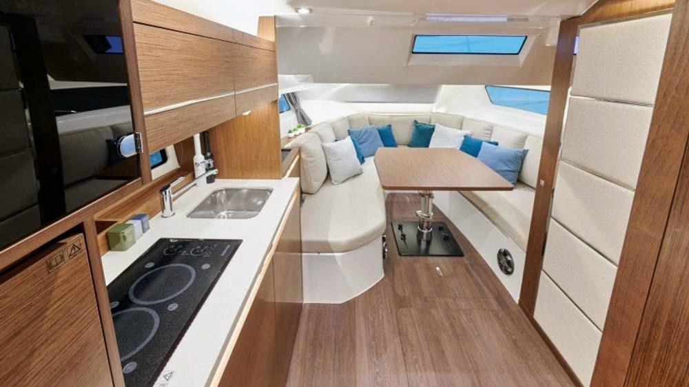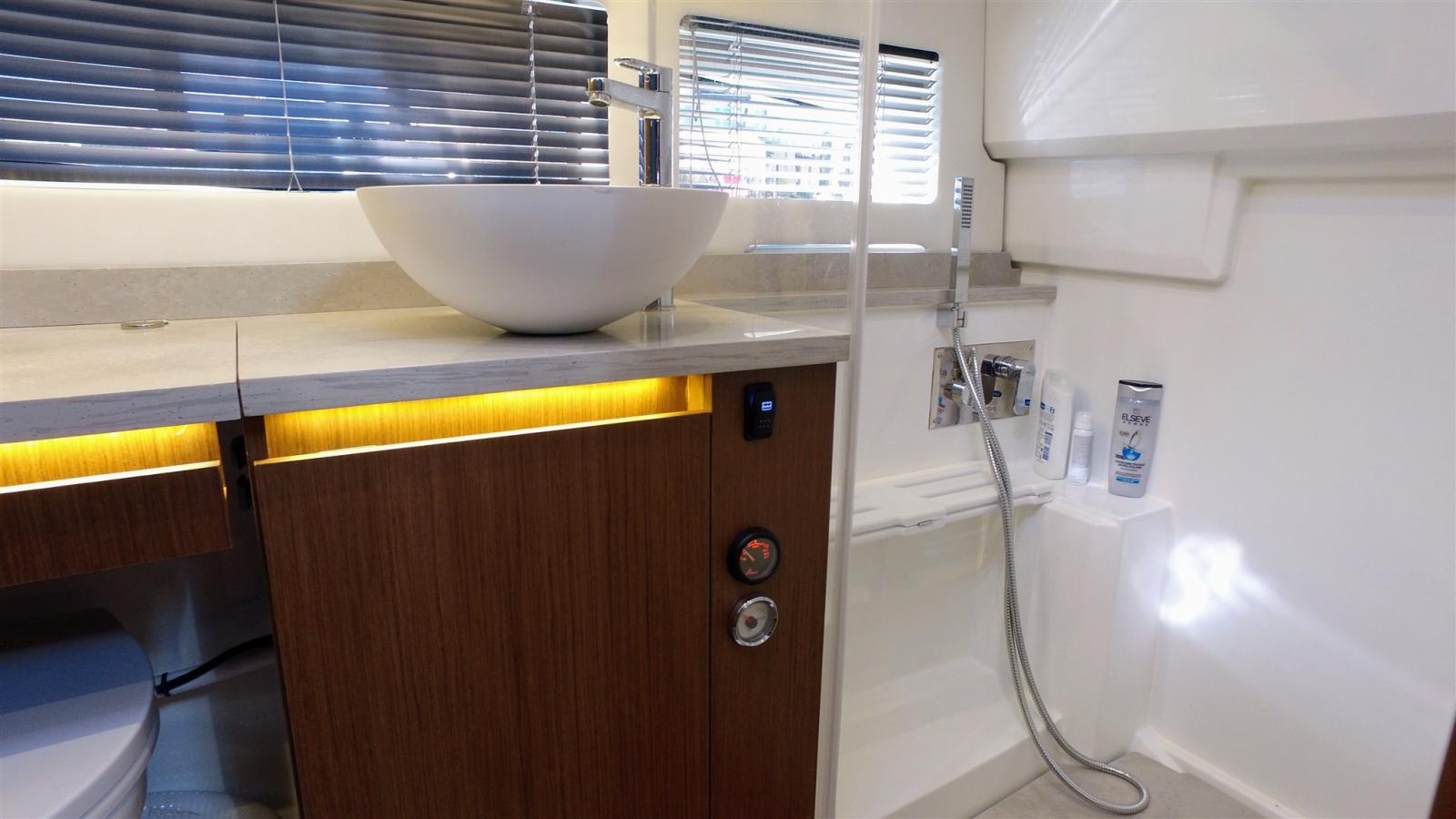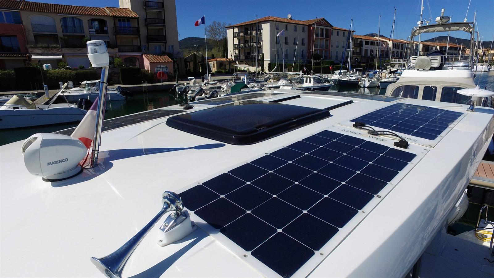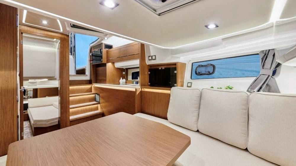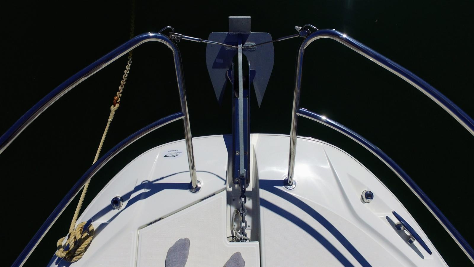 Engine Alarm, Anchor (16kg 28m de chaine de 10 et 40m de cablot - Ancre virtuelle), Water pressure pump, 4 Batteries (lithium), Deck Shower, Headlights fixed on the stem (et avant), Directional Spotlight, Electric Flaps (Lenco), Washbasin in the cockpit, Courtesy Lights (de cockpit et intérieur), Solar panels, Platform (et latérale amovible), Automatic Bilge Pump, Shorepower connector, Water harbor connector system, Electric Windlass, swimming ladder, cockpit table (avec bain de soleil et table avant), T-Top (rigide avec parbrise bas).