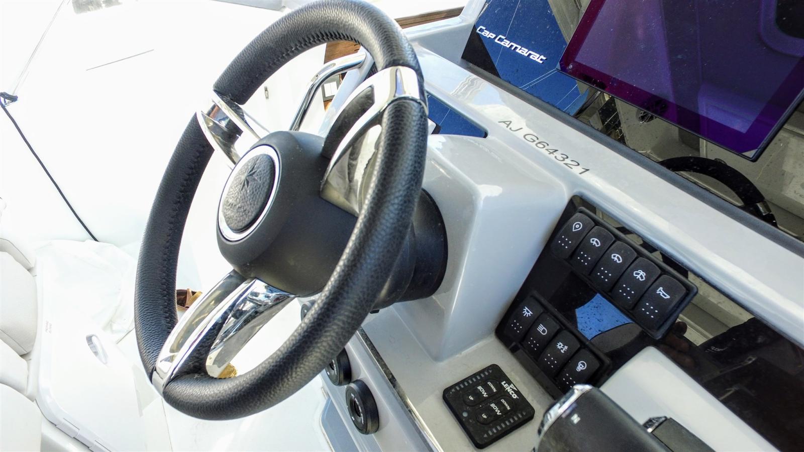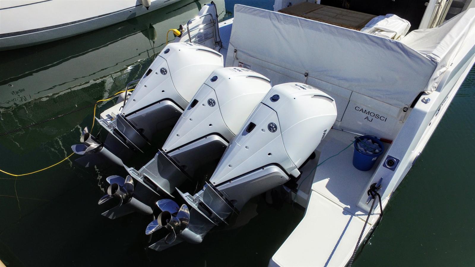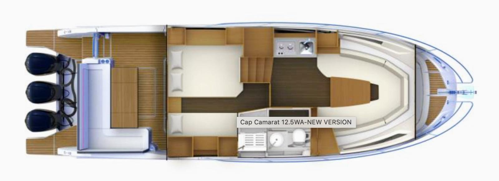 Jeanneau Cap Camarat 12.5 WA – 2023 –: large Walk Around of 11.95 m in excellent condition, powered by 3 x 300 HP Mercury Verado V8 with only 80 hours. Elegant, efficient and versatile, it can accommodate up to 12 people. Heavy-duty planing hull, 0.82 m water drawer, 1,150 L fuel / 200 L water tank. Equipped with joystick, auto pilot, Simrad Go12 GPS plotter, sonar, VHF, self-propelled, rigid T-Top, sunpad, platform and deck shower. Complete comfort with air conditioning, electric toilet, kitchen, lithium batteries, solar panels and sound system. Ideal day-cruiser or coastal cruise.
