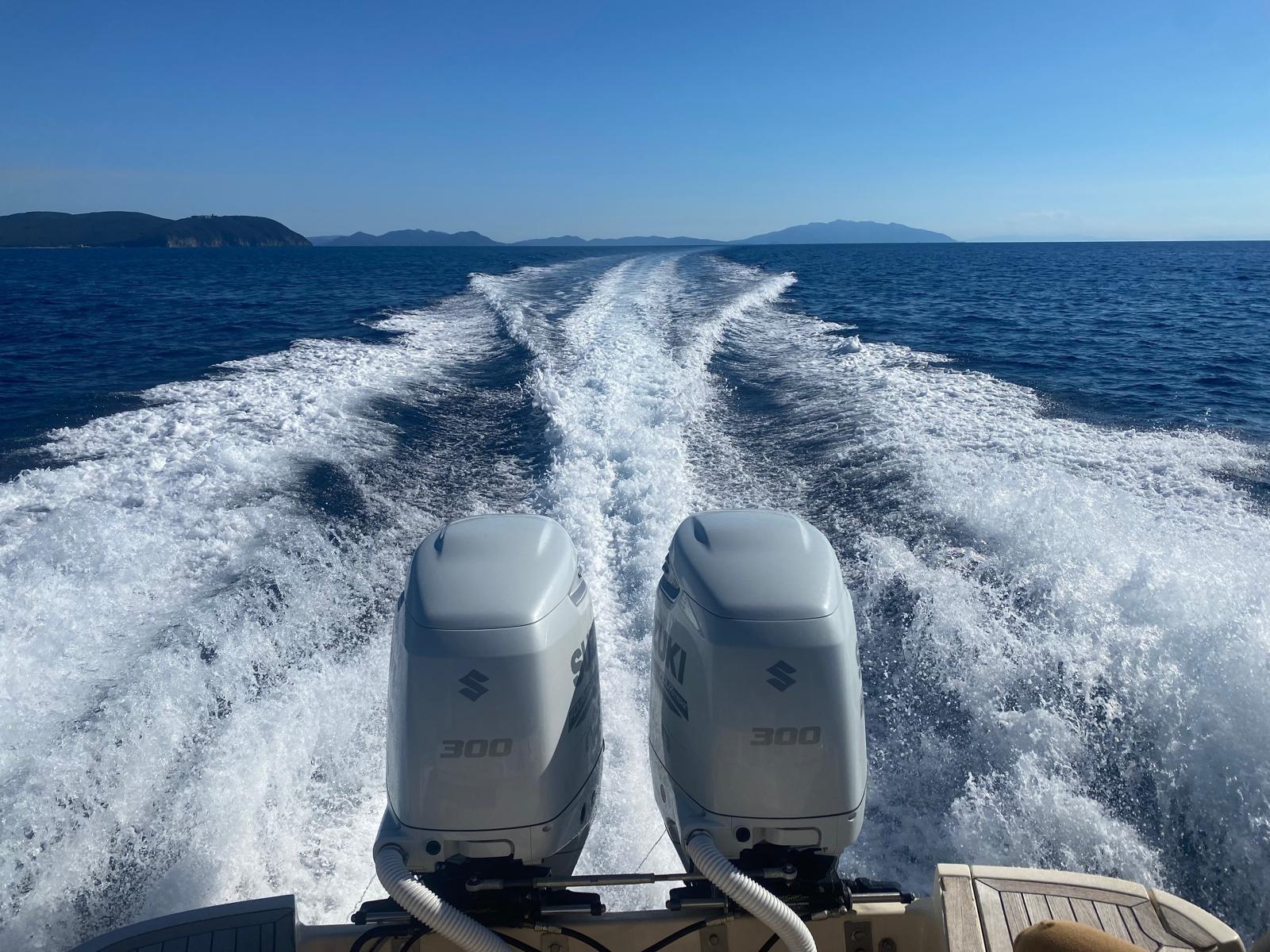 Engine Alarm, 4 Batteries (2 motori + 2 servizi), Teak Side Decks, Deck Shower, Courtesy Lights, Platform, Teak Cockpit, Shorepower connector, Rollbar (in VTR), Electric Windlass, swimming ladder, Table, Horn.