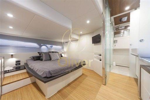 The kitchen is located in the middle of the boat and represents the junction between the outside and the inside, creating a unique and spacious environment. The ceiling, made of crystal, allows an exceptional brightness. It is an exhibited kitchen, considered as a moment of pleasure, relaxation and fun of the owner and his friends / guests. The cabins are large and comfortable: the large windows allow those who sail to feel part of the sea. Endless choices of materials for the customization of SPORT COUPE' 56: as for other models in the range, a team of trained professionals accompanies the owner in the path of choosing every detail of his new boat where no detail is left to chance.