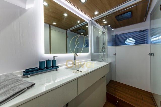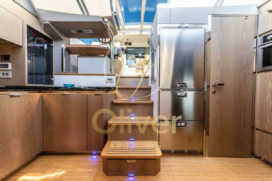 Passing through the door you find yourself in a bright dinette with a large sofa, crystal tables, marble top, retractable television and double driving position signed Besenzoni. The driving position allows easy maneuverability and the large windshield a wide and complete view. The suspended dashboard has two multifunction 12" touchscreen for the management of all the on-board instruments: from the cameras to the pilot, from the echo to the radar to the gps.