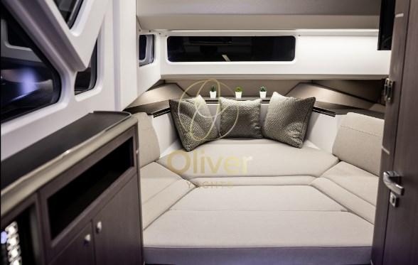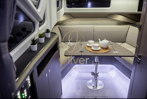 4-seater sofa with convertible backrest with removable and adjustable table. The floor from the cockpit to the bow is covered in softdeck while the