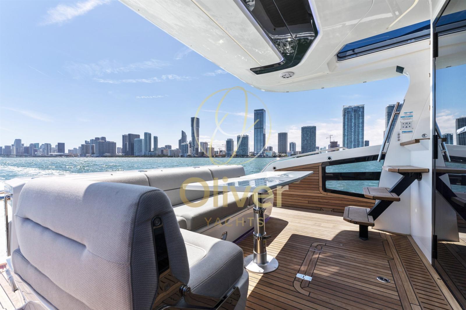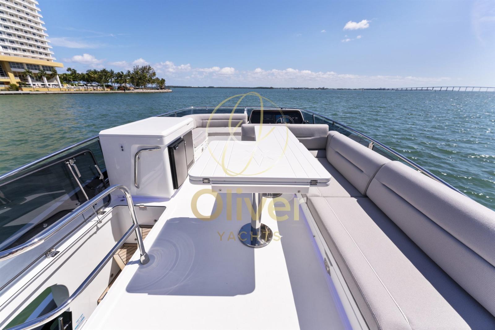 Fume/Gas Detector, Engine Alarm, Bilge Alarm, Water pressure pump, Auto-Trim (opzionale), Folding cleats, Draining System, Teak Side Decks (opzionale), Canvas Wing (opzionale), Special Colour (opzionale, varie verniciature a polvere), Deck Shower, Twin Steering, Stern Thruster (opzinale), Headlights fixed on the stem, Hydraulic Flaps, Tender Garage, Tender Crane, Washbasin in the cockpit, Courtesy Lights, Underwater lights, Gangway, Platform, Automatic Bilge Pump, Entry door, Side door, Teak Cockpit (opzionale), Shorepower connector, Water harbor connector system, Voltage Rectifier, Electronic instrumentation repeater, Electric Windlass, swimming ladder, Waste Water Purifier System, Stabilizers (opzionale, giroscopico Seakeeper), cockpit table, Living Room Foldable Table, Horn, Teak Deckhouse (opzionale), Stern Winches, Bow Winches.