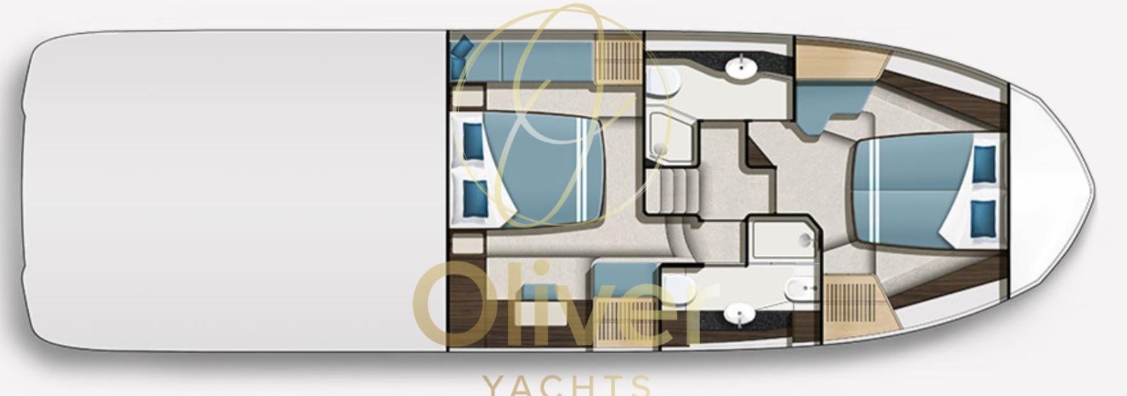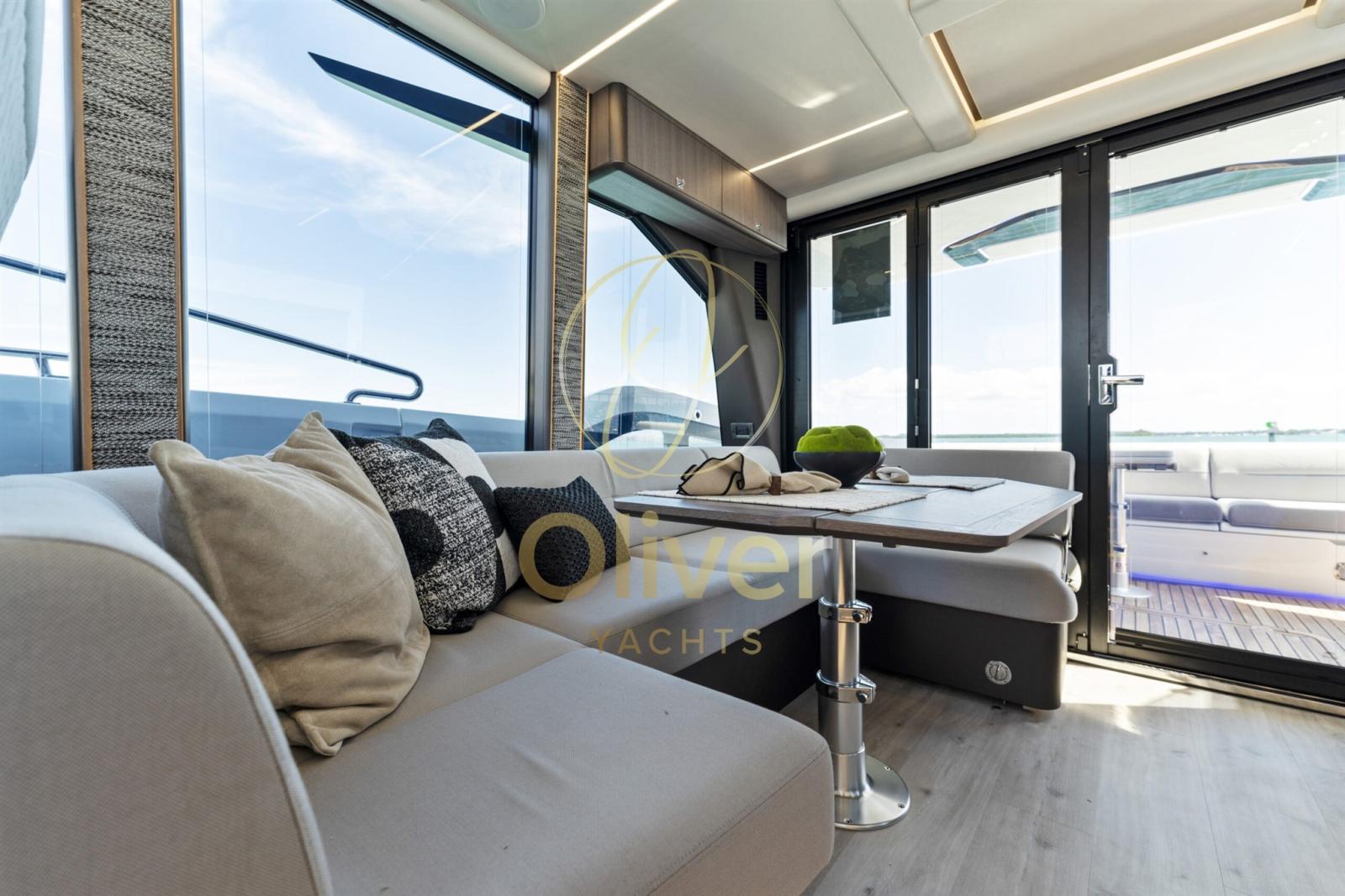 Inside, there is a classic layout with the sleeping area set back, divided from the cockpit only by sliding glass doors. The galley and wheelhouse are moved forward with the cabins located on the lower deck.