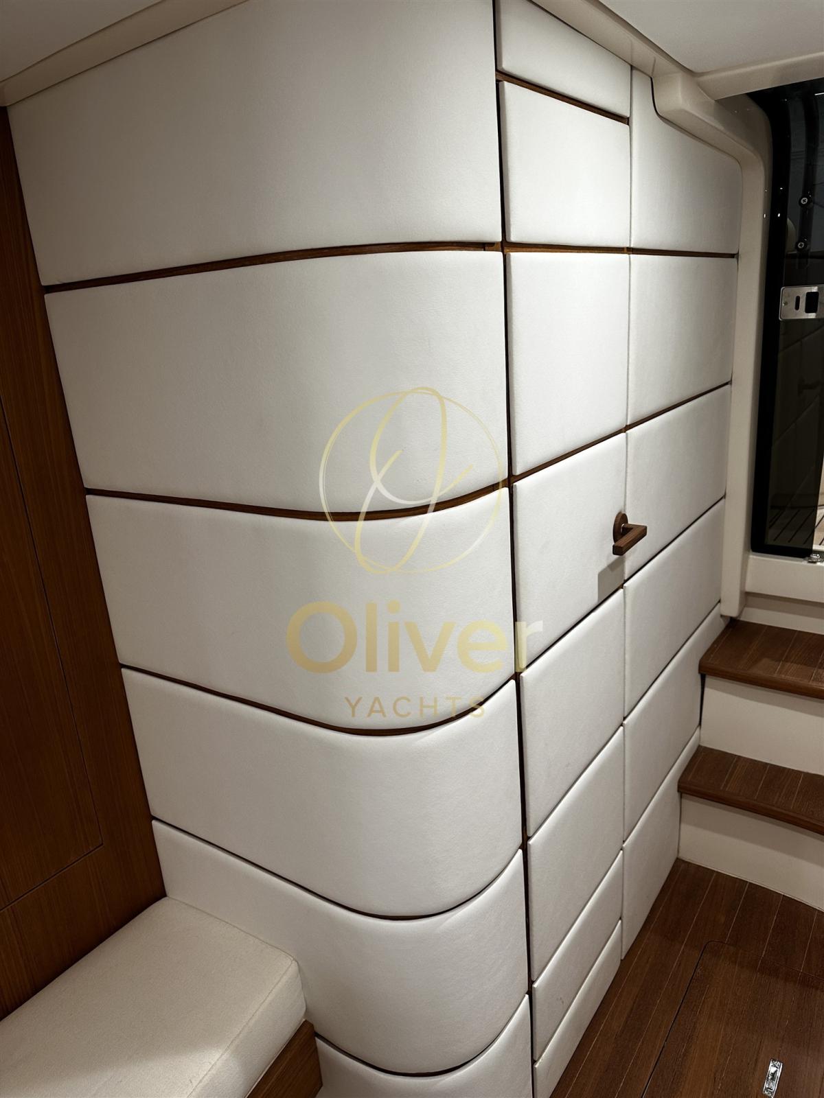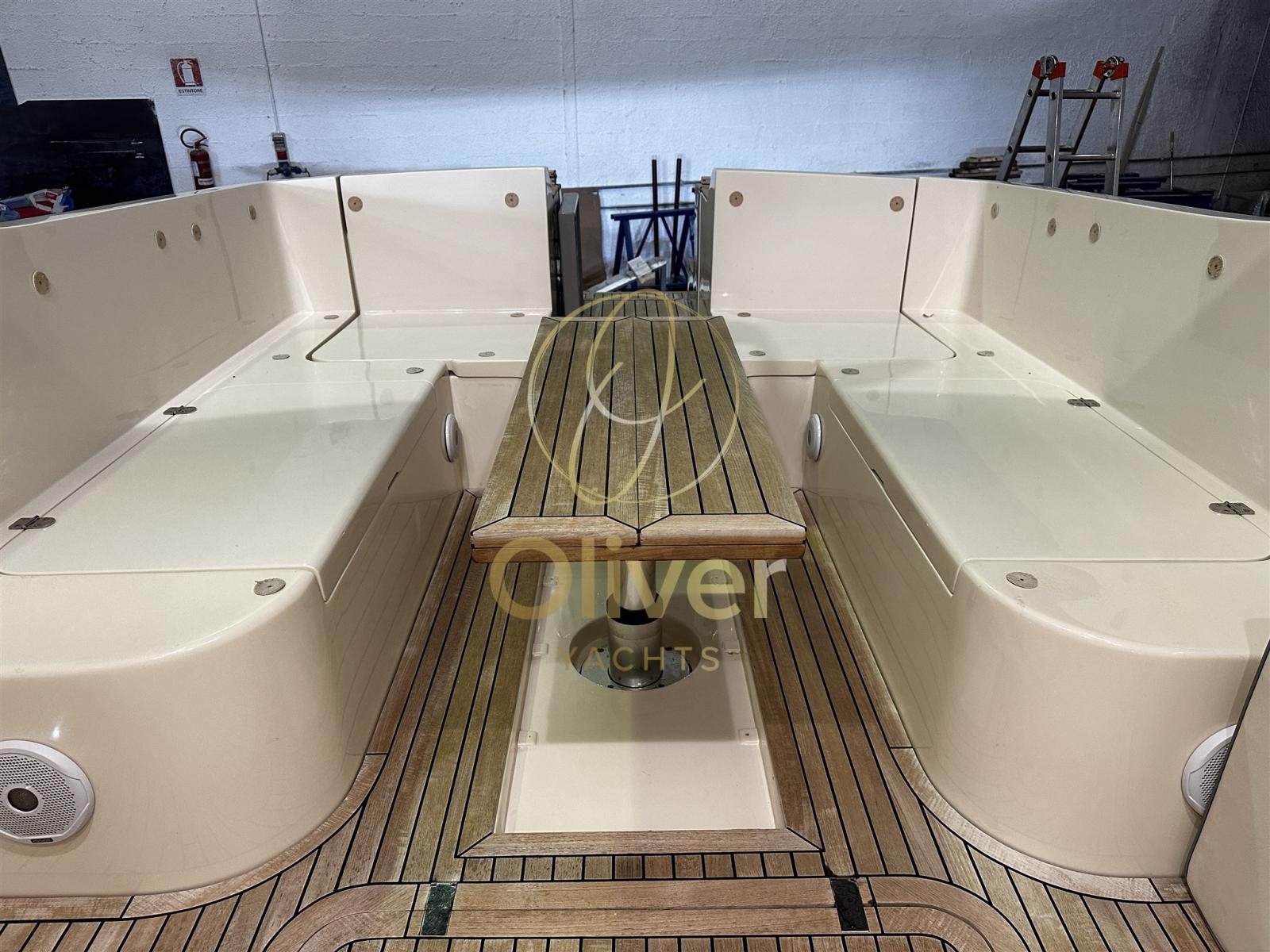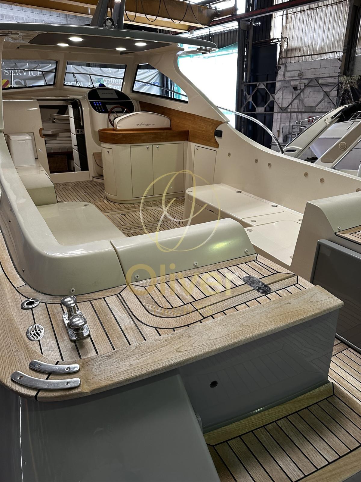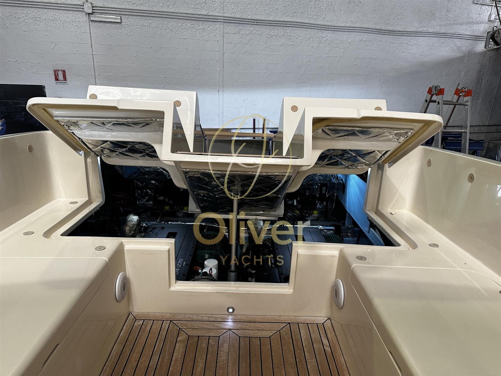 Engine Alarm, Bilge Alarm, Electric Engine Compartment Opening (Sala macchine poppa), Water pressure pump, Teak Side Decks (fino a ponte di prua), Deck Shower, Hydraulic Flaps, Hard top, Fire Extinguishing System, Flaps Indicators, Washbasin in the cockpit, Courtesy Lights, Gangway (Besenzoni bianca a scomparsa), Automatic Bilge Pump, Teak Cockpit (Pozzetto completo), Shorepower connector, Voltage Rectifier, Electric Windlass, cockpit table (Elettrico pozzetto di poppa).