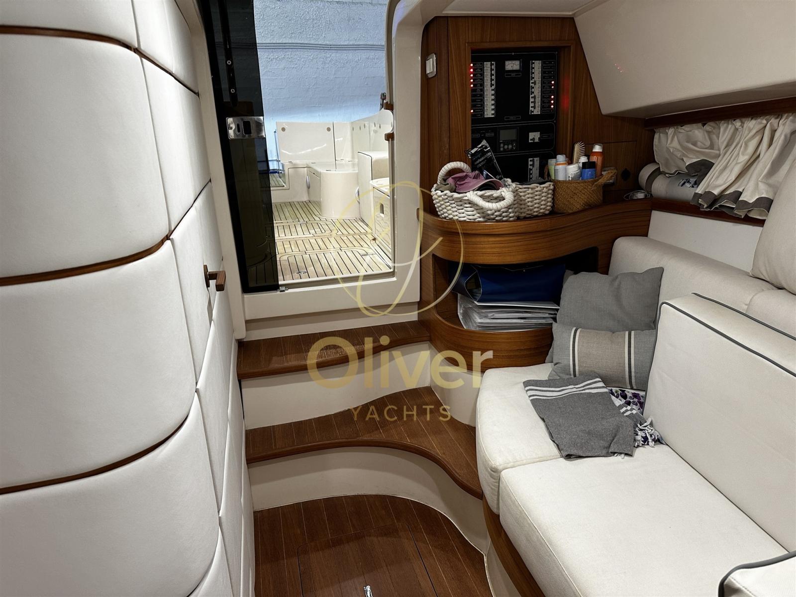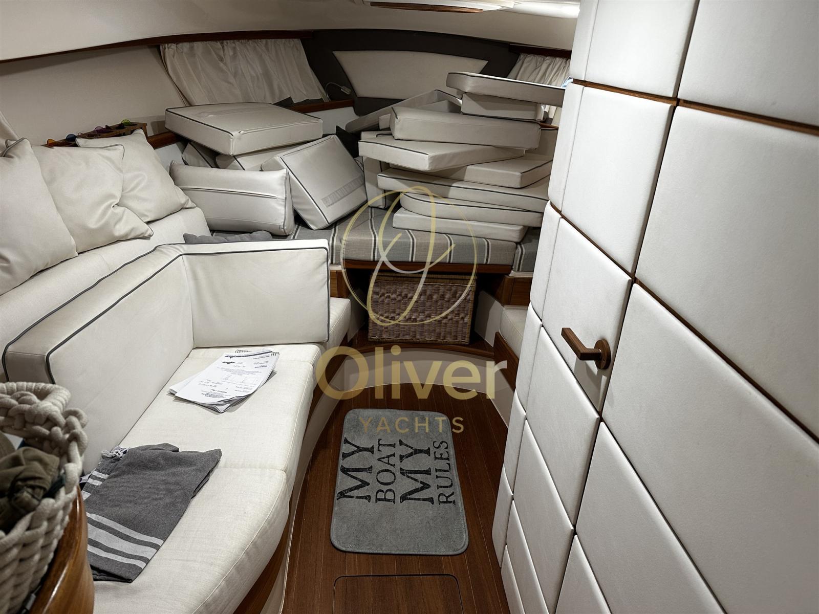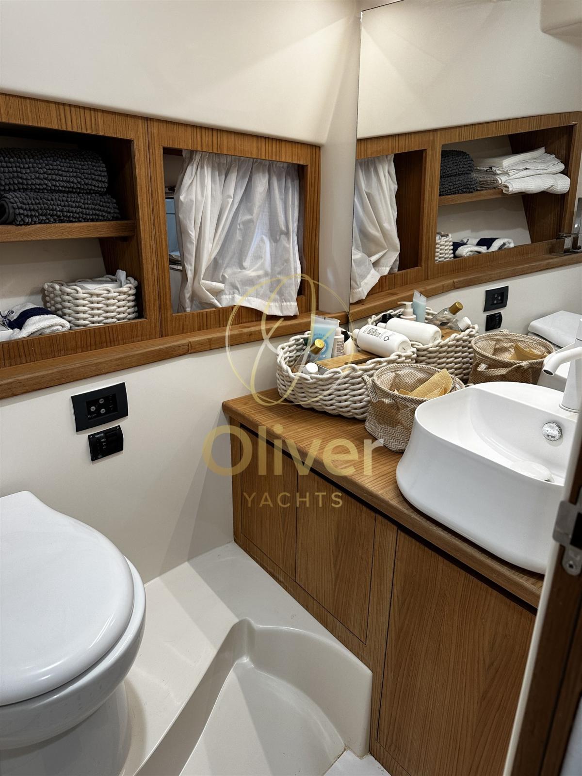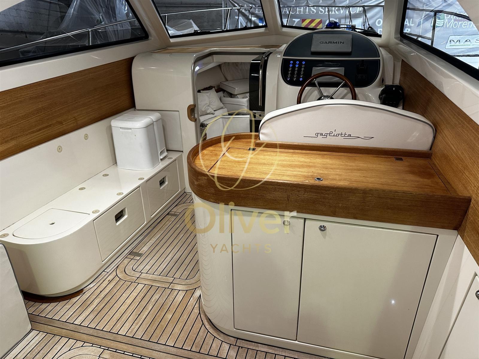 Engine Alarm, Bilge Alarm, Electric Engine Compartment Opening (Sala macchine poppa), Water pressure pump, Teak Side Decks (fino a ponte di prua), Deck Shower, Hydraulic Flaps, Hard top, Fire Extinguishing System, Flaps Indicators, Washbasin in the cockpit, Courtesy Lights, Gangway (Besenzoni bianca a scomparsa), Automatic Bilge Pump, Teak Cockpit (Pozzetto completo), Shorepower connector, Voltage Rectifier, Electric Windlass, cockpit table (Elettrico pozzetto di poppa).