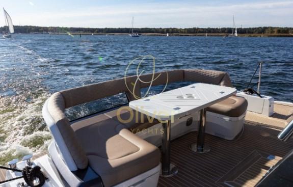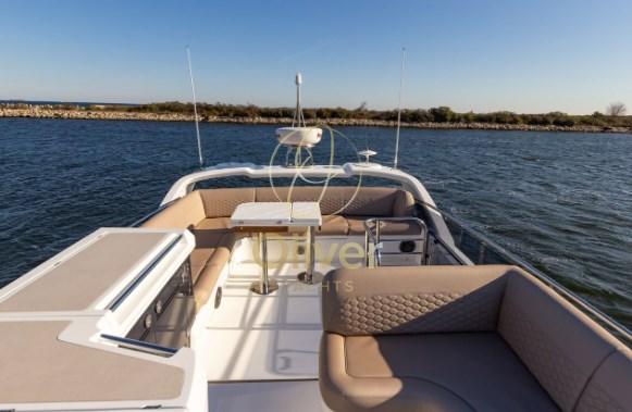Cockpit Cover, Cushions, Stern Cushions, Bow Cushions, Fly Bridge Cuscions, Cockpit Cushions, Sunbathing deck, Flybridge Cover, Instrument Cover, Seat Cover, Electric Canopy (opzionale), Sunshade (a prua con supporti in fibra di carbonio).