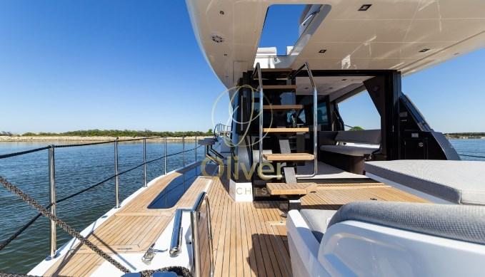 The flybridge is equipped with two distinct seating areas, a wet bar and a fully equipped upper helm station. With the use of carbon technology, the weight savings have allowed for more space at the top and better handling thanks to the lower center of gravity. The beloved Beach mode makes a triumphant, charming return with partially glazed balconies, effectively expanding the usable space in the cockpit when you decide to drop anchor. The aft seating will feature a retractable grille option accessible from the hydraulic platform.