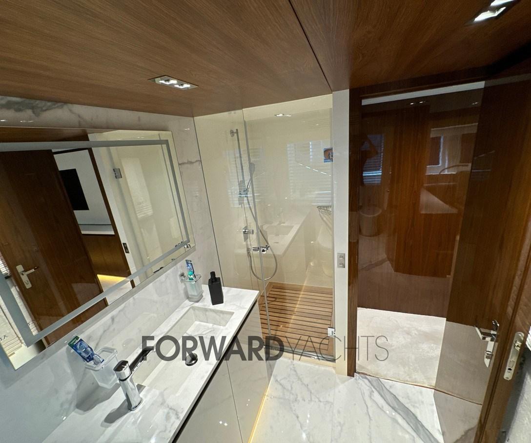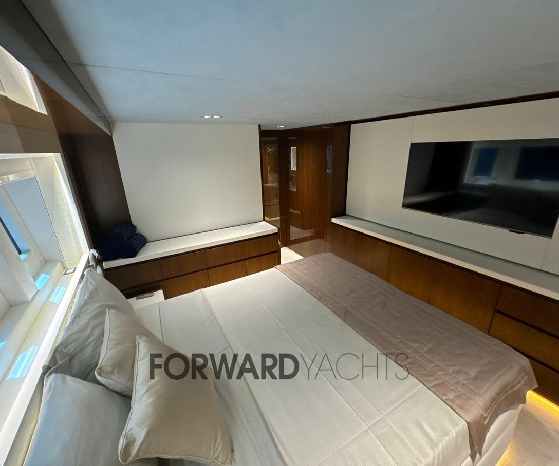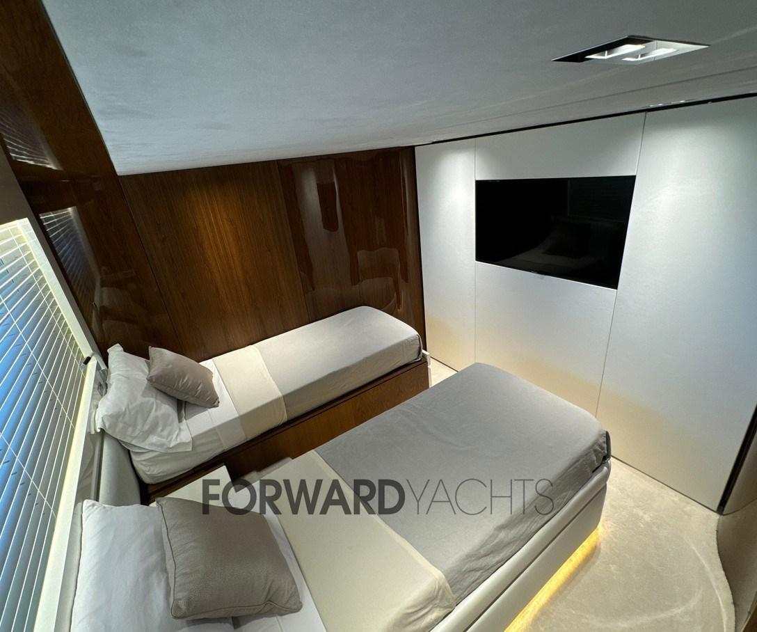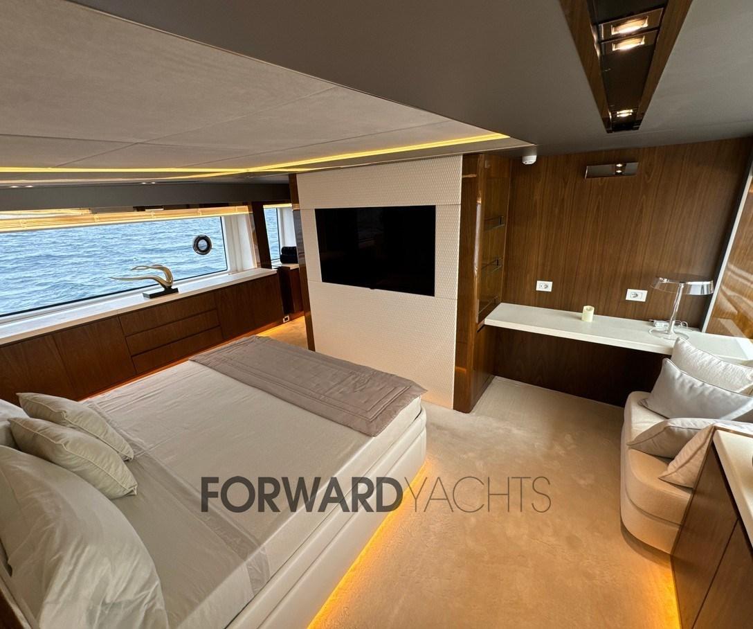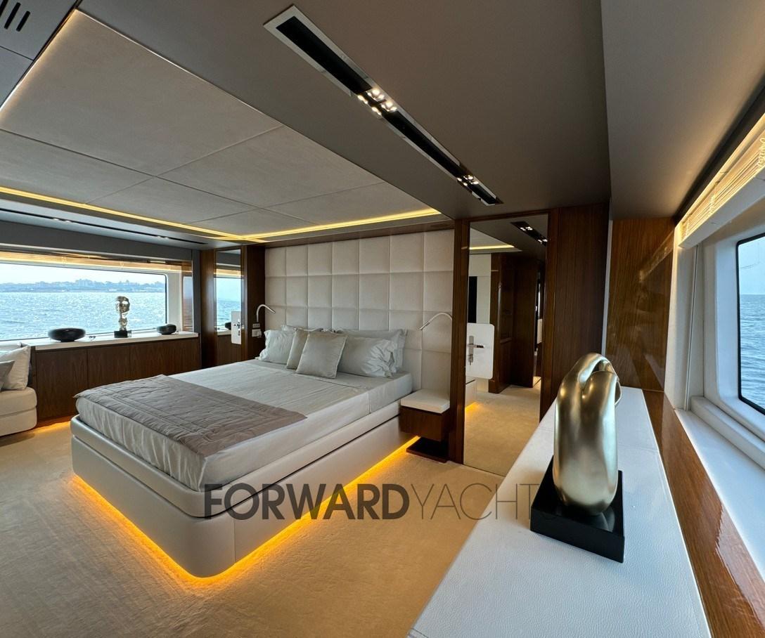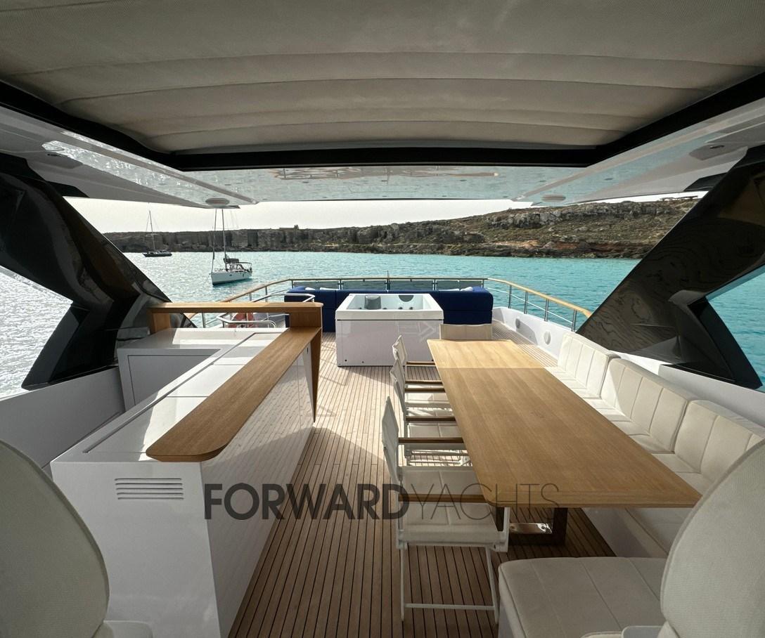 It can accommodate up to 10 guests in 5 refined cabins: an owner's suite, 2 VIP cabins and 2 convertible double cabins, all with ensuite bathrooms. There are also 5 crew members on board, housed in 3 dedicated cabins, at the extreme bow. The designer and comfortable interiors include a large saloon with panoramic windows, while the exteriors boast a fully equipped flybridge, with jacuzzi, convivial areas and sun deck.