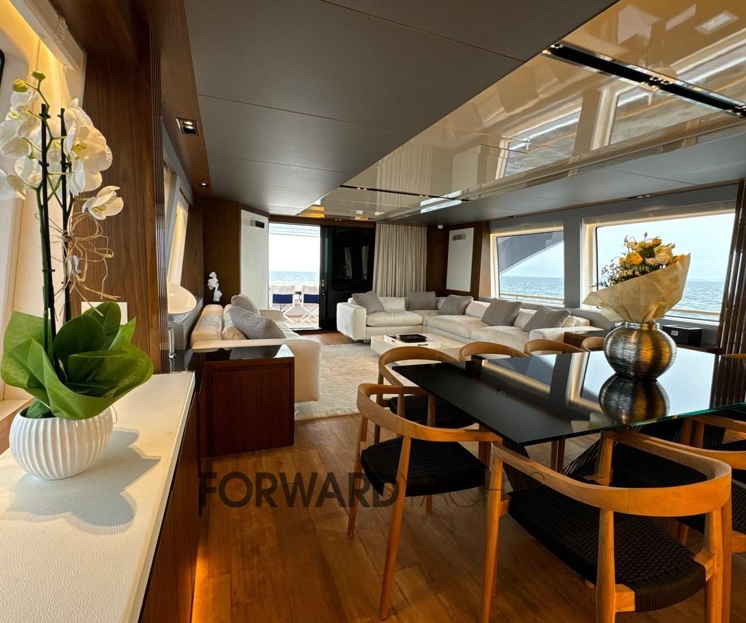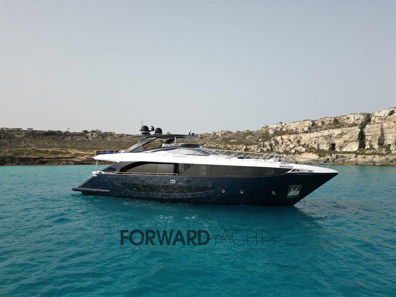The Amer F100, built by the Permare shipyard in 2020, with its 30 meters, represents the perfect combination of elegance and cutting-edge technology. Equipped with 4 Volvo Penta IPS1200 engines, it reaches a maximum speed of 28 knots and offers smooth and comfortable navigation at 23 knots, guaranteeing efficiency and great seaworthiness.