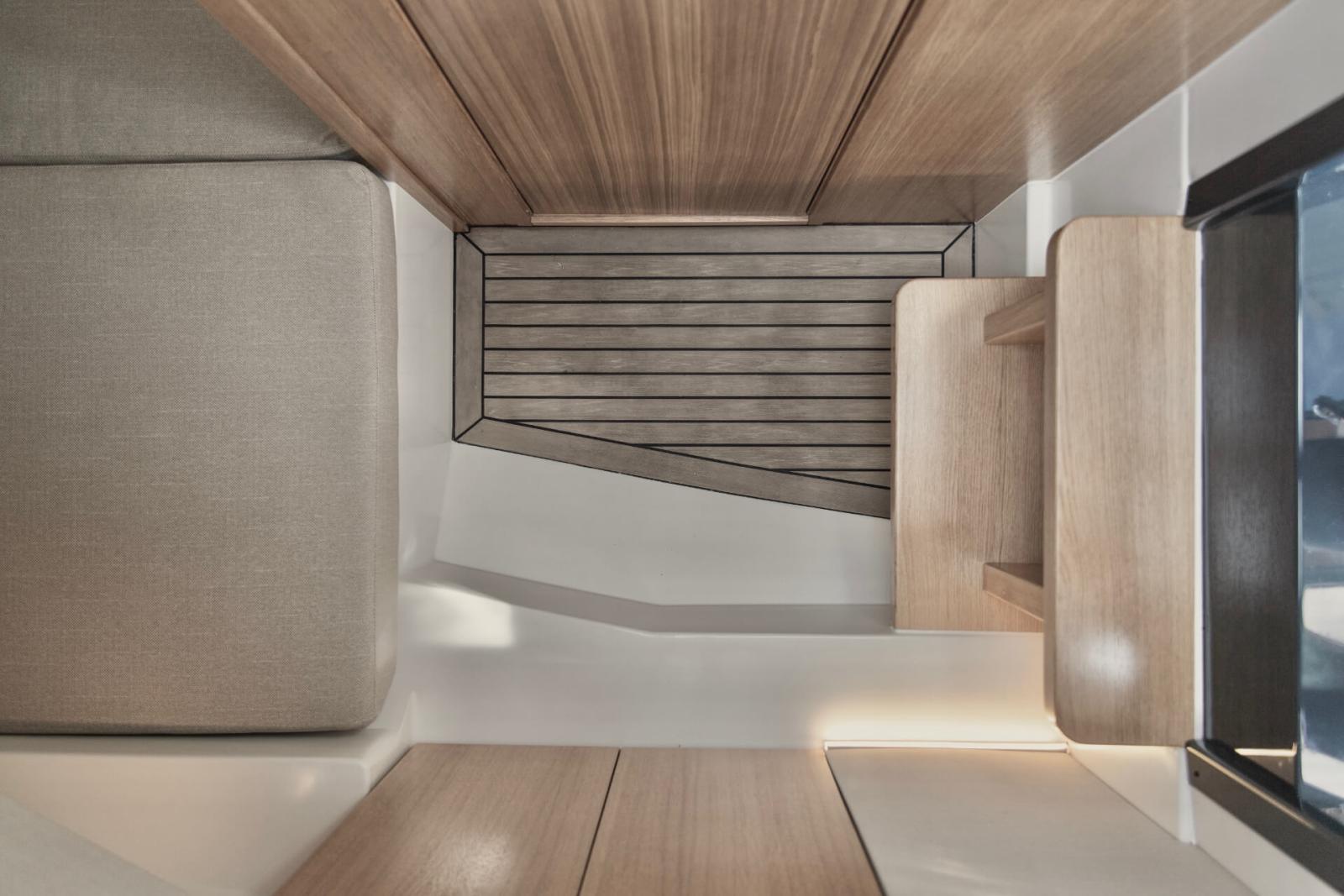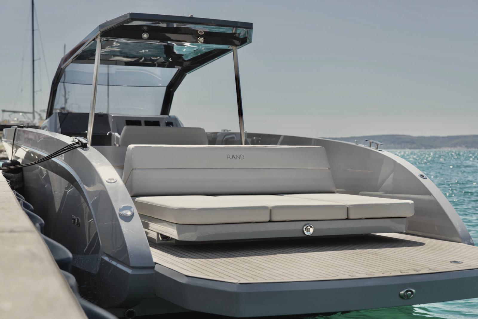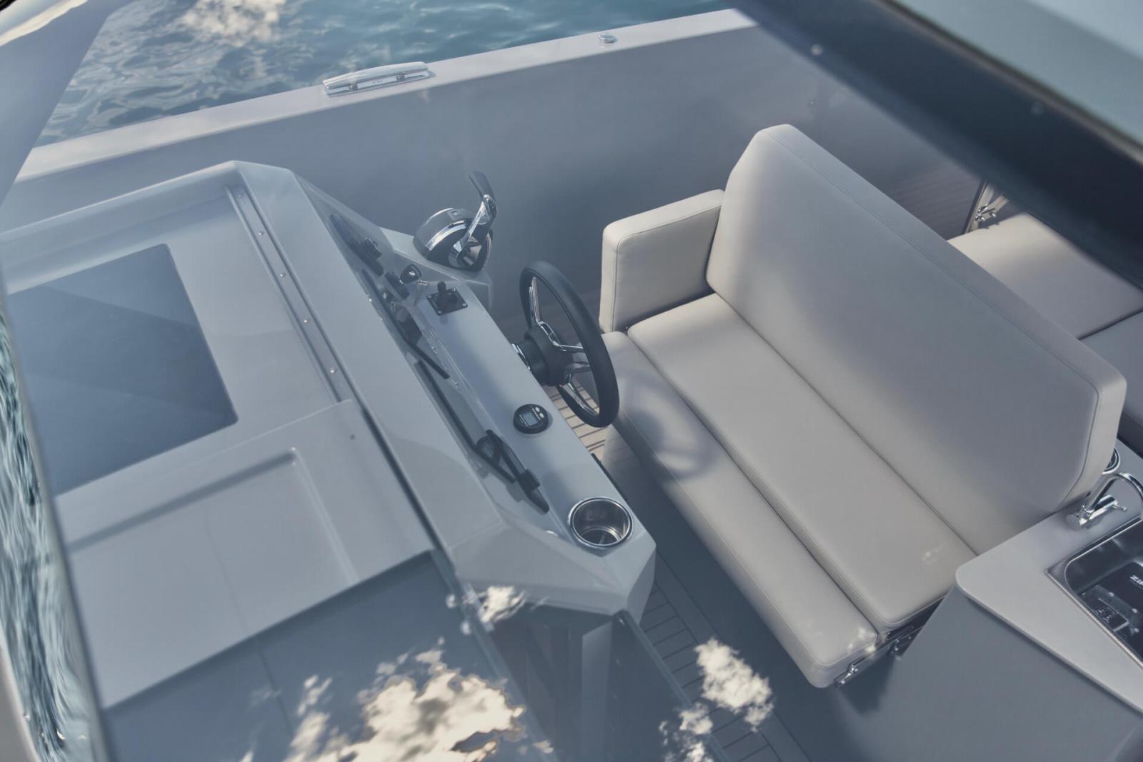 Uncompromising space: Escape 30 provides the modern 30ft open powerboat layout into a more compact and sporty size that can even be trailered, creating a unique multi-use open space with walk- around cockpit that grants easy access around the boat that is protected by a XL fenderlist.