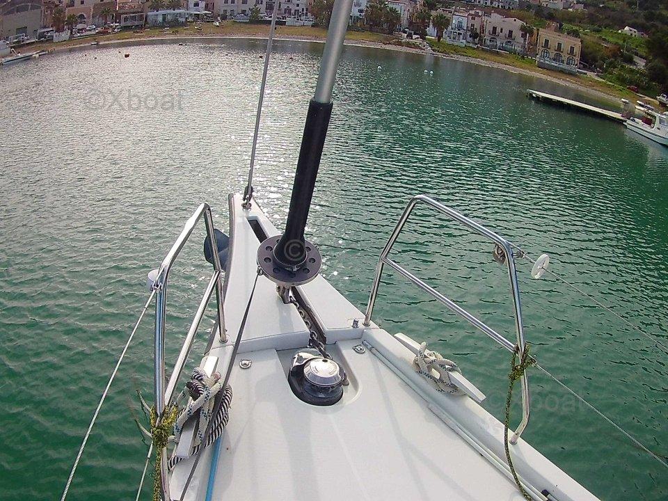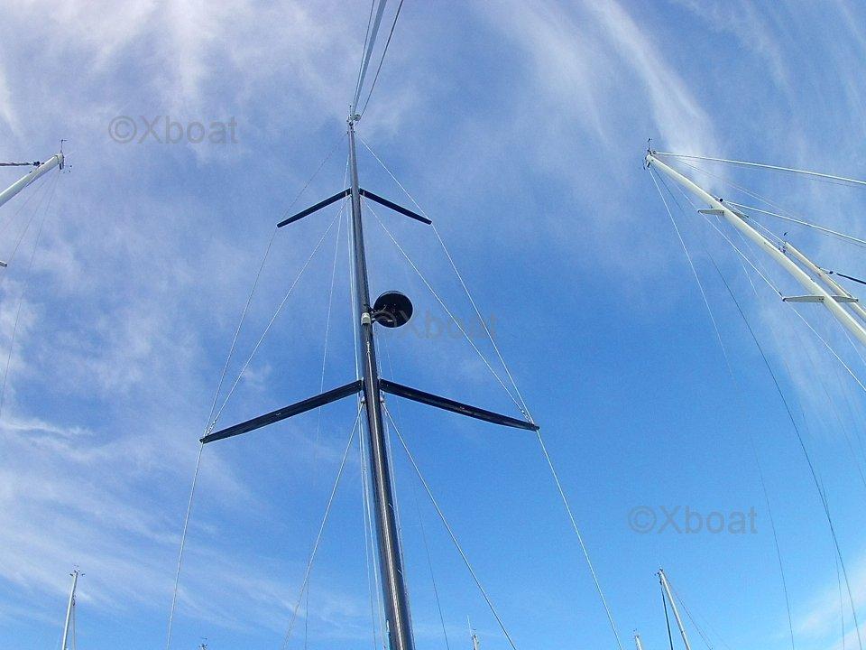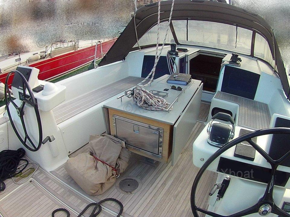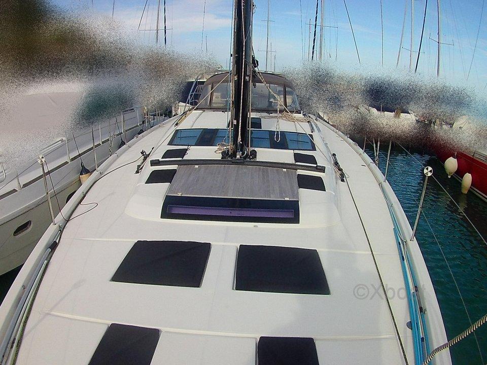 The owner writes: "Electric aft beach opening with remote control - built-in stainless steel refrigerator in the cockpit table - outdoor gas barbecue - wine cellar - LED deck lighting - underwater LED lighting - Dufour carbon composite walkway - interior in oak/Corian Grey kitchen/Alpikord dec More details and pictures on xboat.uk
