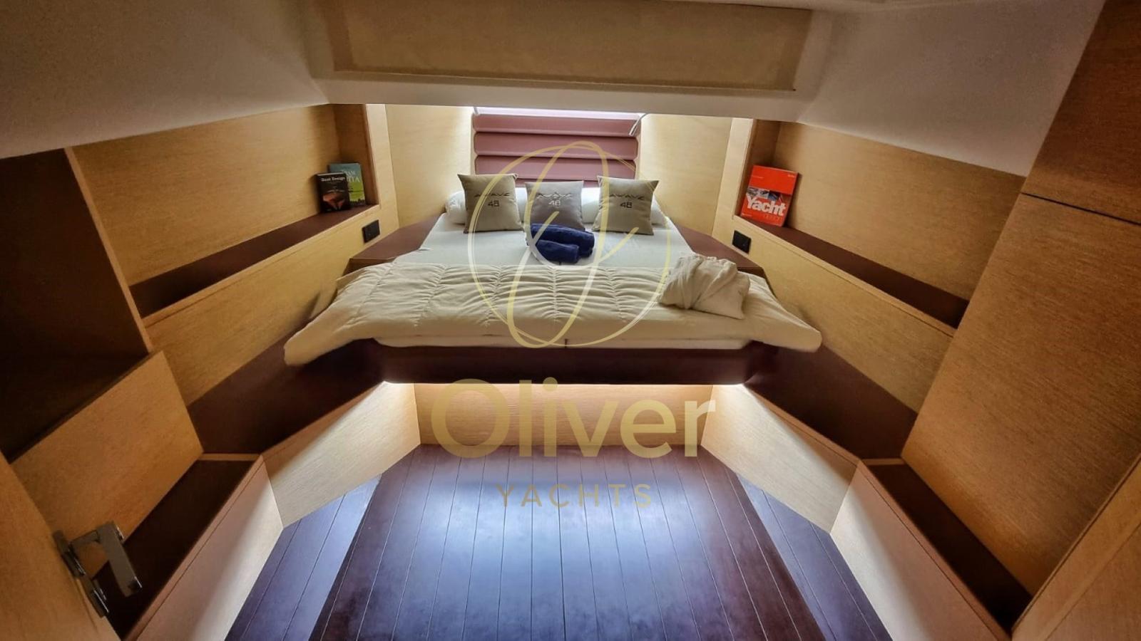 The guest cabin, located amidships, is one of the most spacious in its category. The two single beds are positioned in such a way as to ensure comfort and freedom of movement, with a height that allows even tall people to stand without difficulty. This solution, rare on yachts of this length, makes the AWAVE 48 even more exclusive and versatile.