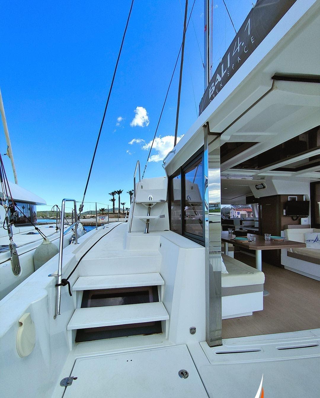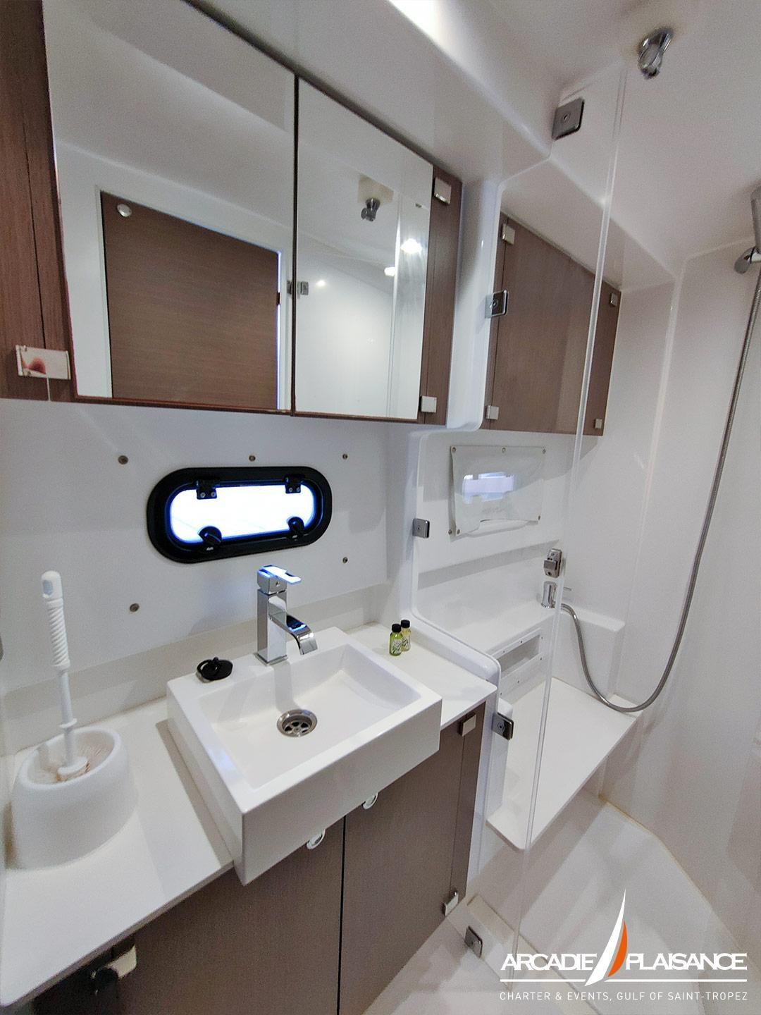 Engine Alarm, Anchor (20kg et 70 m de chaine de 10), Water pressure pump, 6 Batteries (4 x 130 cv service et 2 moteurs avec coupleur), Battery charger (70 Amp), Deck Shower (chaude et froide), Tender Crane, Courtesy Lights (dans carré et cockpit), Auxiliary Engine (2,3cv Honda 4T), 2 Solar panels (rigide 200W), Gangway, Automatic Bilge Pump, Shorepower connector, Electric Windlass (1000w vertical), Strand rigging, swimming ladder, Outboard Engine Support Bracket, 2 cockpit table (avant), Living Room Foldable Table (avec coussins), Tender (Semirigide PVC 2,75m), 2 Winch, Winch Electric (pour GV), Windex.