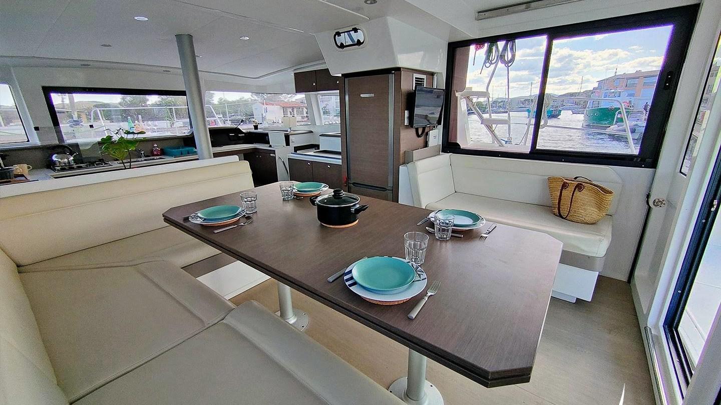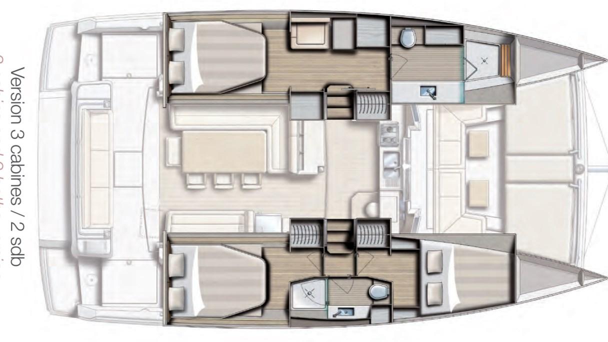 BBQ/Grill (gaz (plancha)), Warm Water System, Inverter (1600w), 4 12V Outlets (USB), 5 220V Outlets, Heater (Chauffage diesel à circulation d'eau chaude flotteurs et carré), 2 Black Water Tank (300l au total), 2 Electric Toilet (à eau douce).