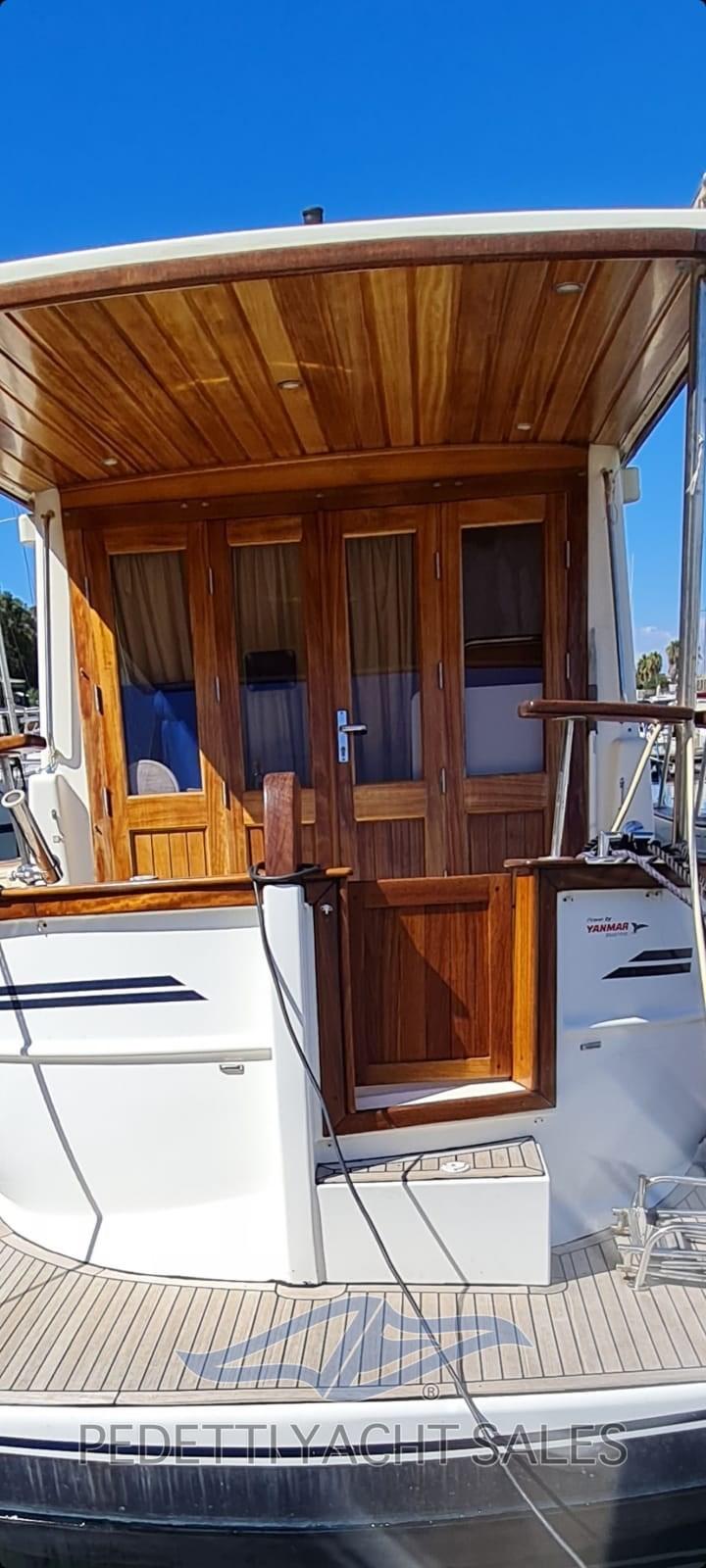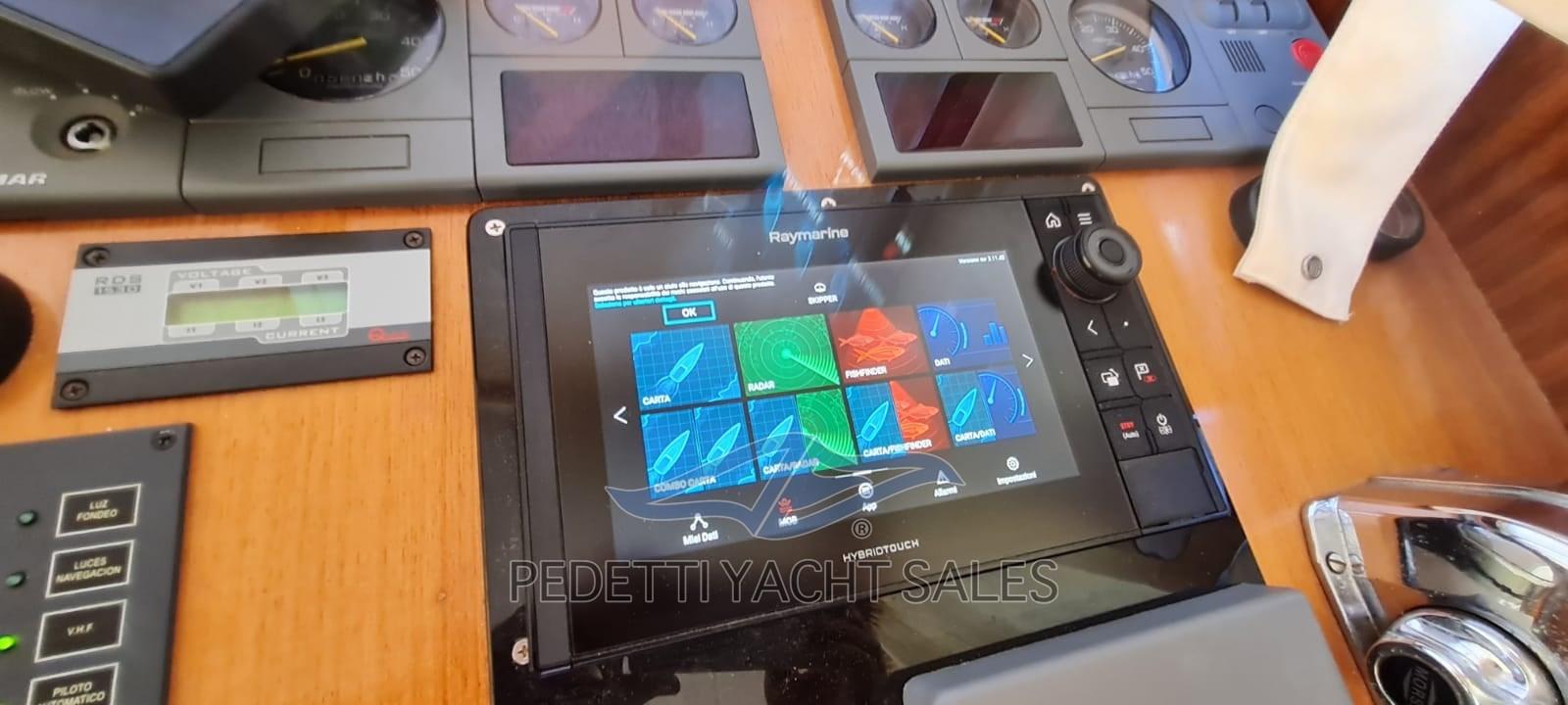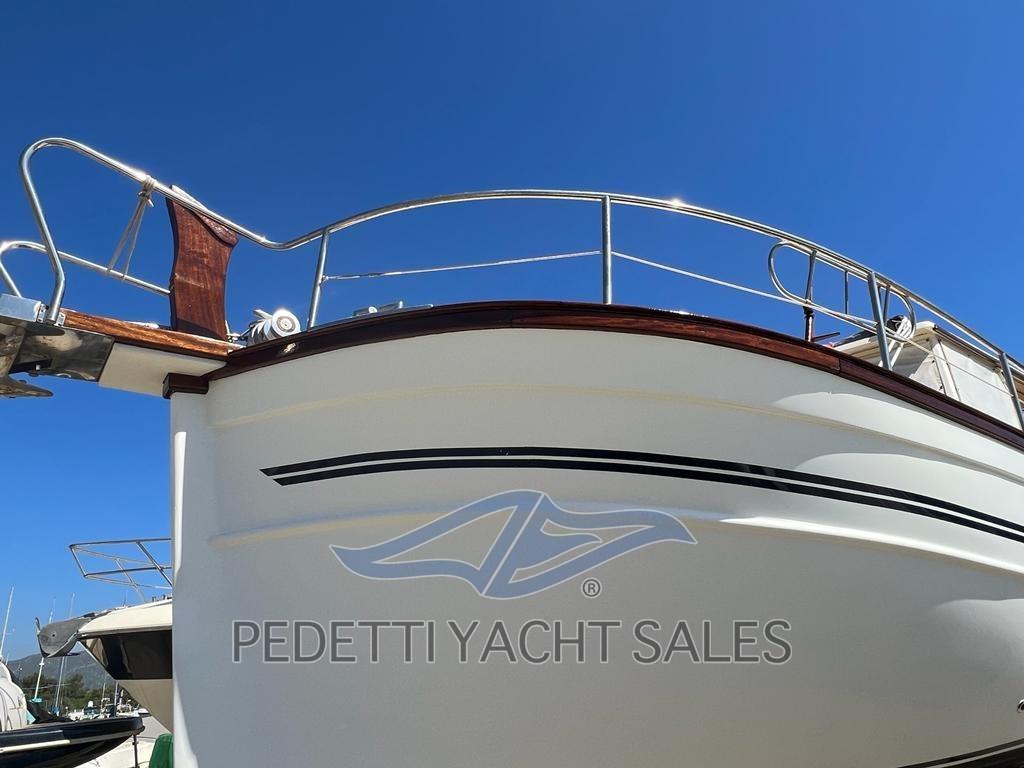 Fume/Gas Detector, Engine Alarm, Bilge Alarm, Water pressure pump, Folding cleats, Deck Shower, Hard top, Fire Extinguishing System, Flaps Indicators, Courtesy Lights, Solar panels, Platform, Automatic Bilge Pump, Entry door, Teak Cockpit, Shorepower connector, Electric Windlass, swimming ladder, cockpit table, Horn, Bow Winches.