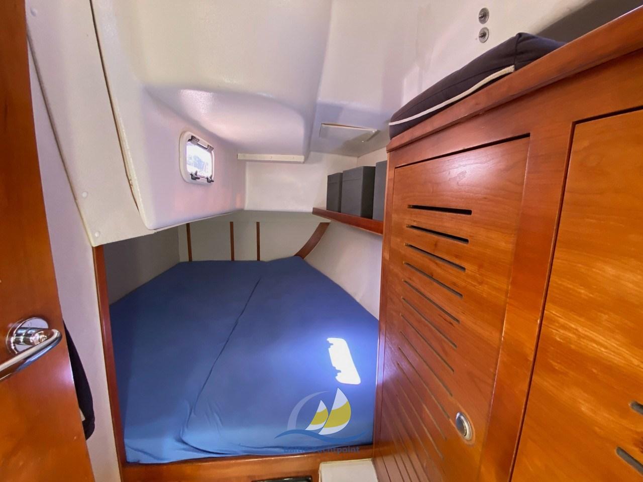 The yacht offers two cabins as well as an additional single cabin that can be used as a spacious locker for bicycles, sails, dinghy or SUP equipment.