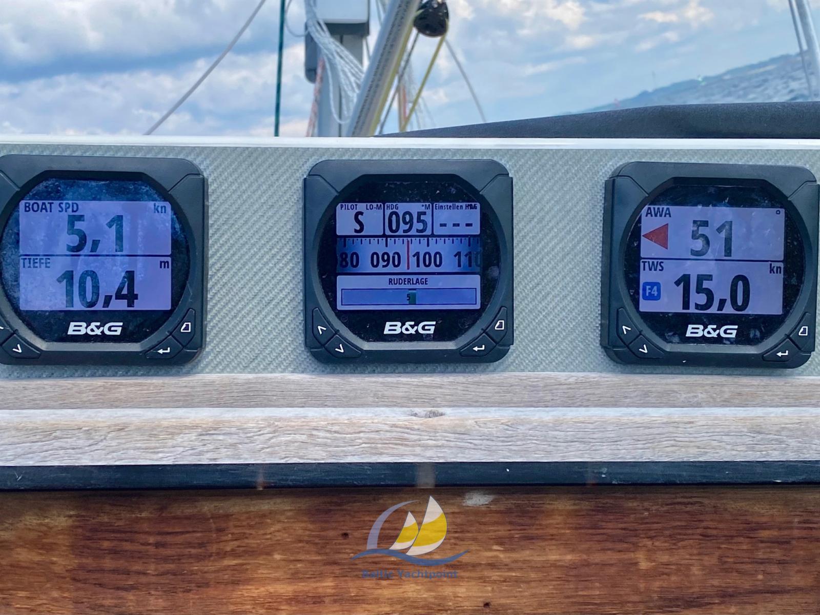 The yacht has been fully equipped, regularly maintained and is in excellent condition. It is ideal for ambitious sailors who appreciate speed, comfort and functionality. Thanks to the well-thought-out controls, it is easily suitable for one-handed use – all sails, including gennakers, can be operated from the cockpit. A high-quality B&G autopilot ensures precise control.