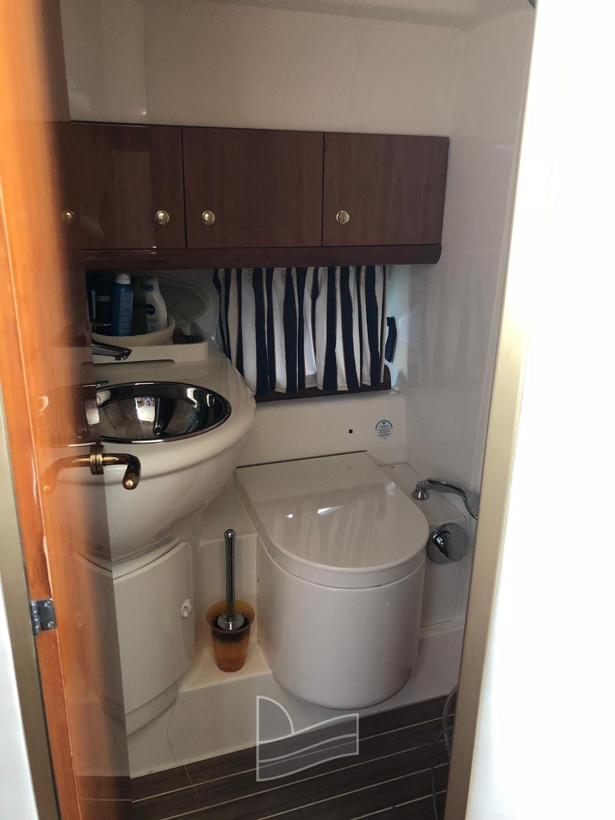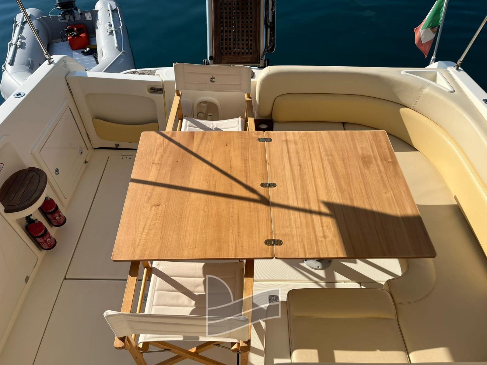 Water pressure pump, Special Colour (Blue Navy), Deck Shower, 2 Electric Flaps, Fire Extinguishing System, Washbasin in the cockpit, Gangway (Idraulica), Platform (di poppa rivestita in teak), Entry door, Shorepower connector, Water harbor connector system, Rollbar, Electric Windlass, swimming ladder, cockpit table (in teak), Horn.