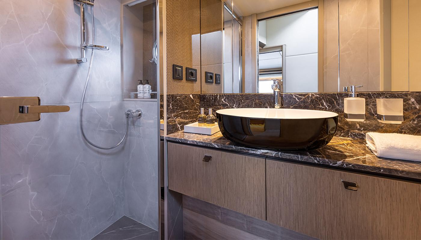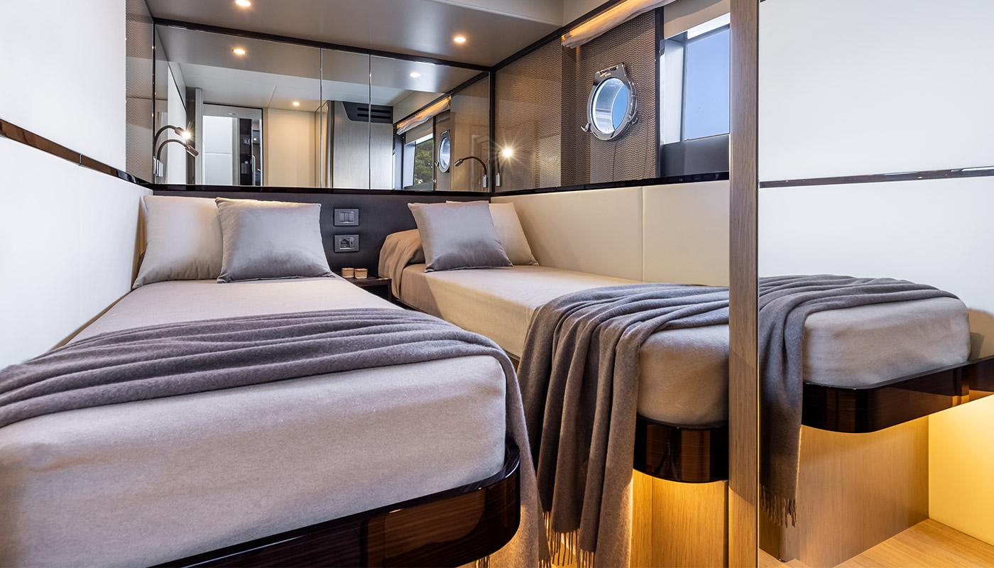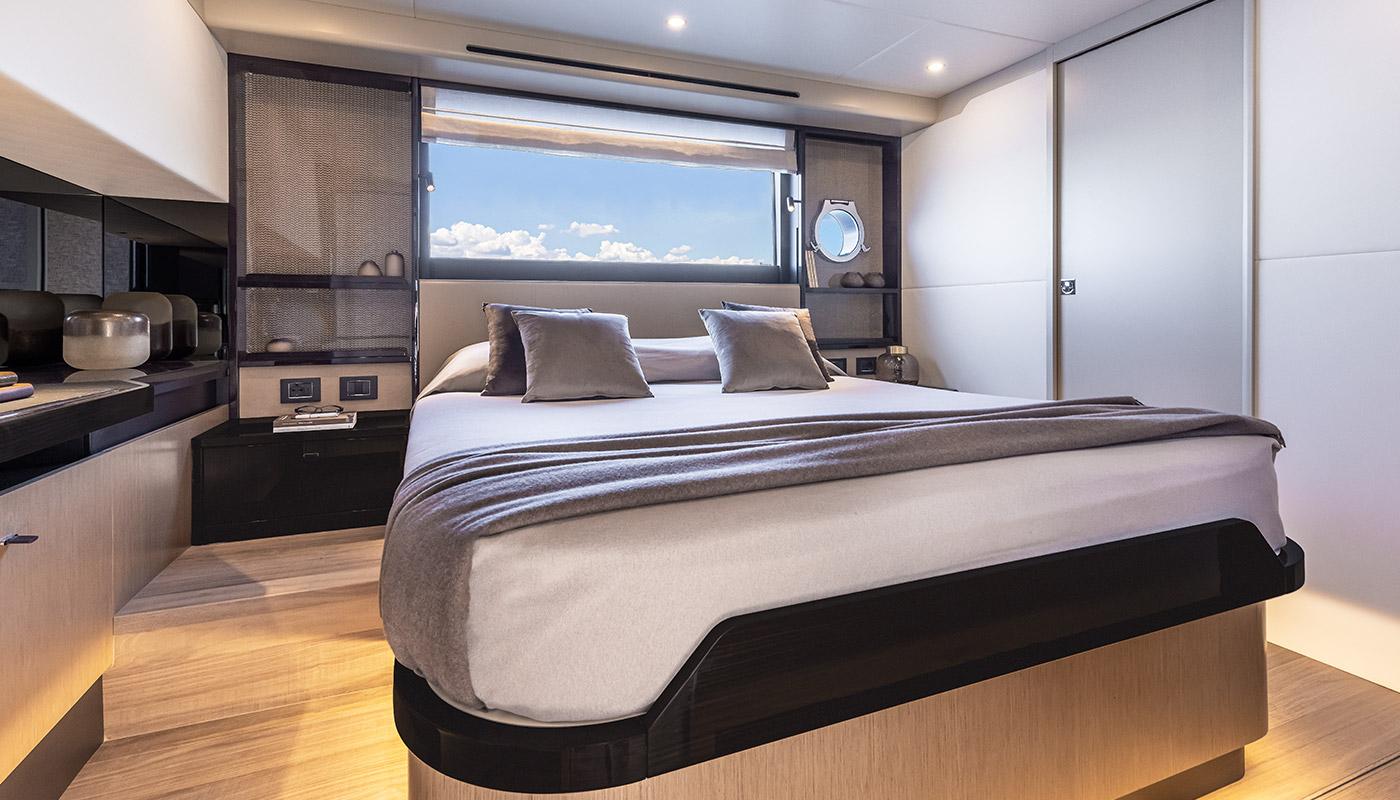The interior, bathed in natural light through panoramic glass windows, is enhanced with noble wood finishes, bespoke furniture, and premium materials. Optimised spaces provide exceptional habitability for a yacht of this class.