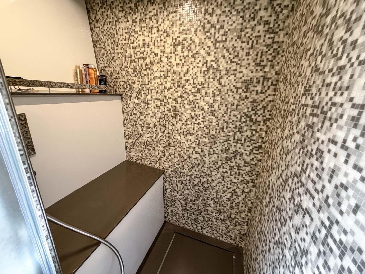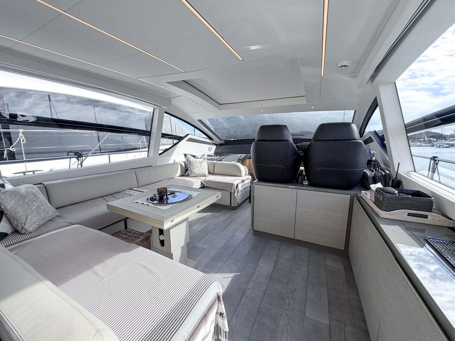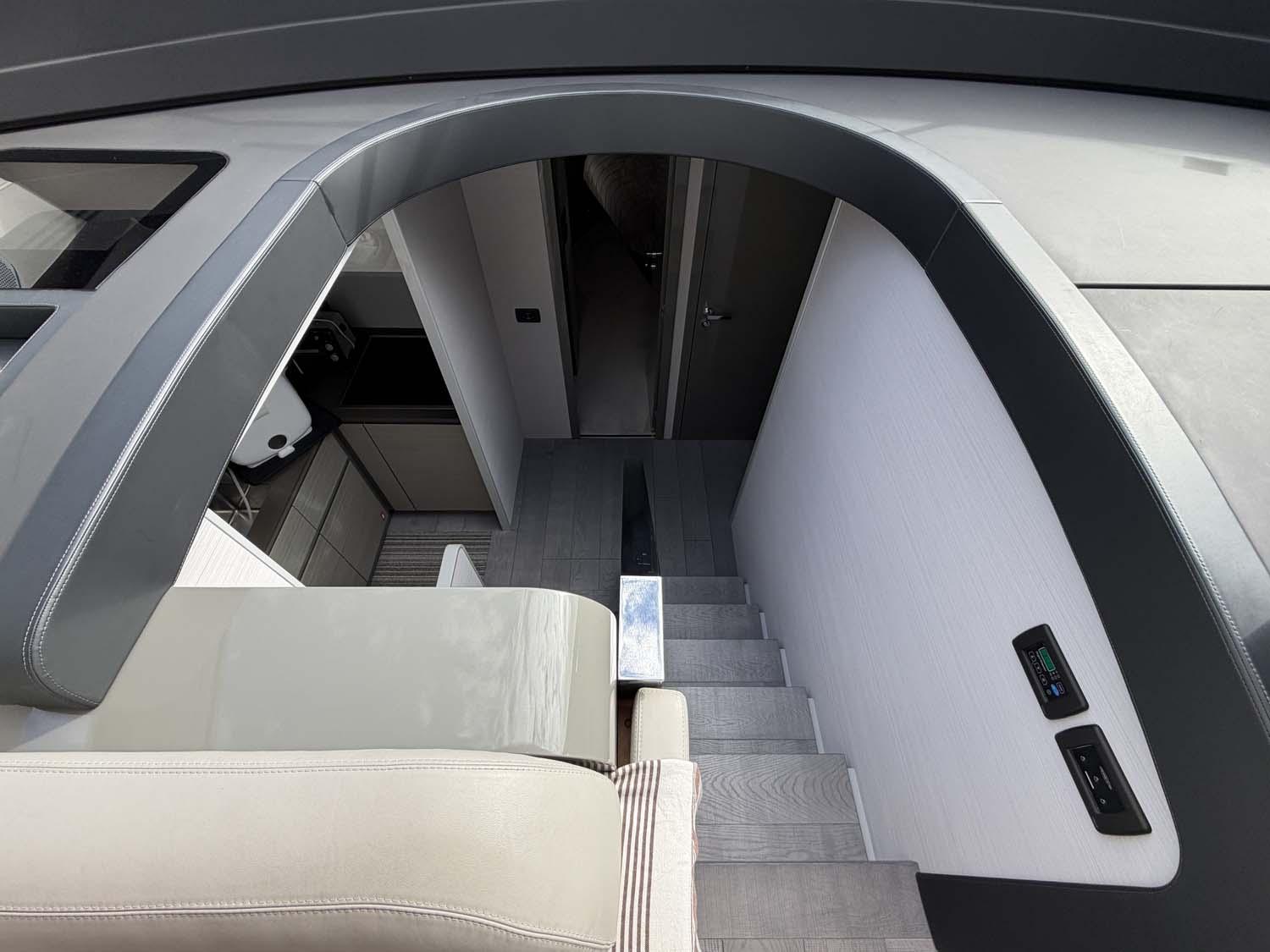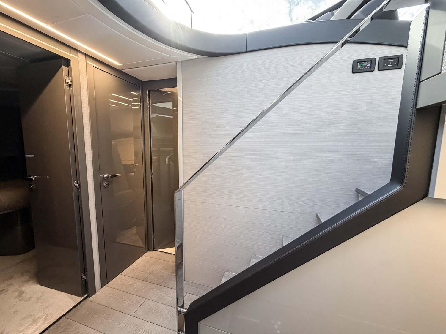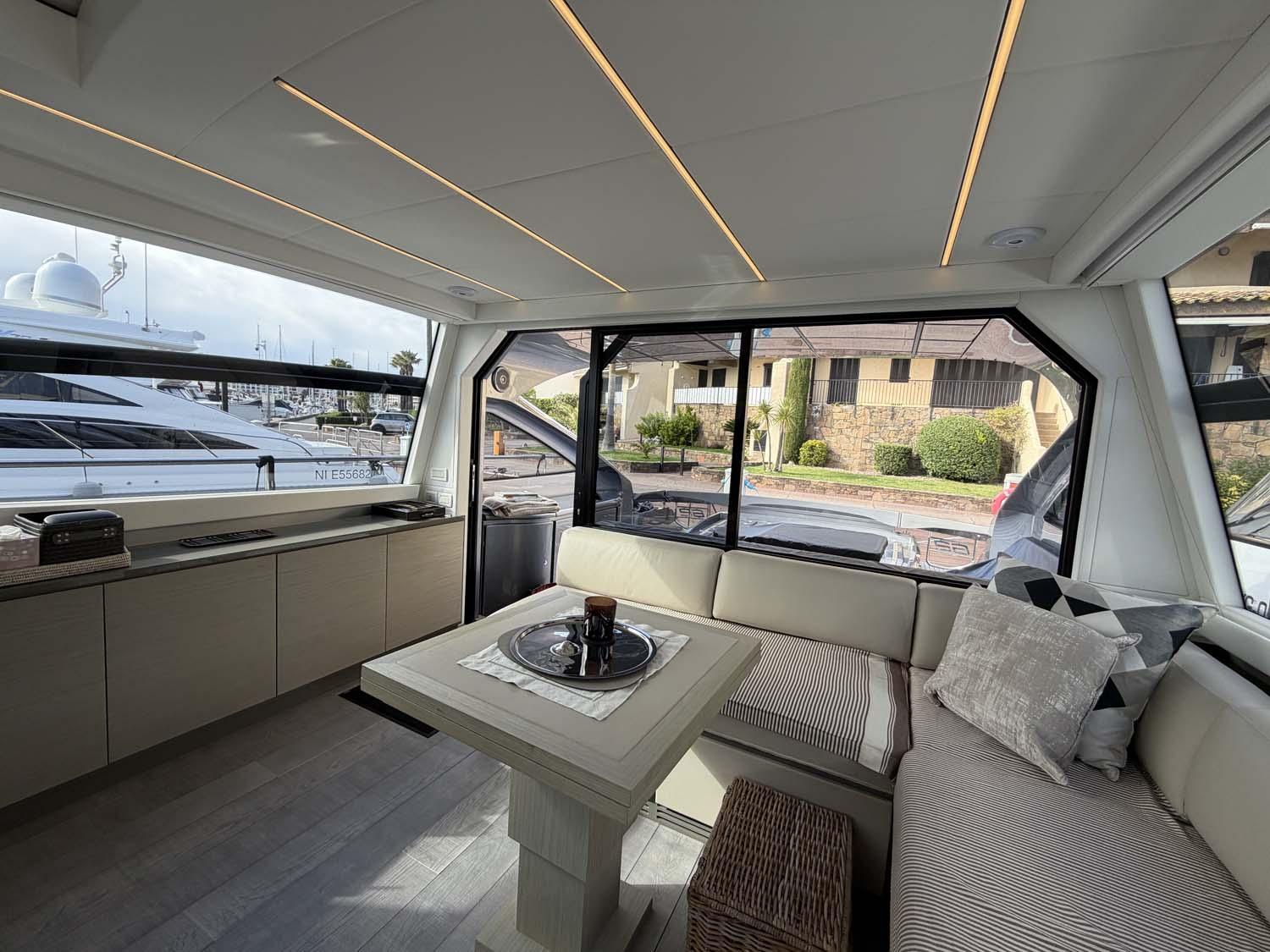 At the stern, the cockpit has been designed as an open-air living space, with a large sundeck and shaded dining area, while the large sliding windows allow the interior space to flow naturally outwards, for a smooth flow of movement and an onboard experience that is as enjoyable as it is immersive.