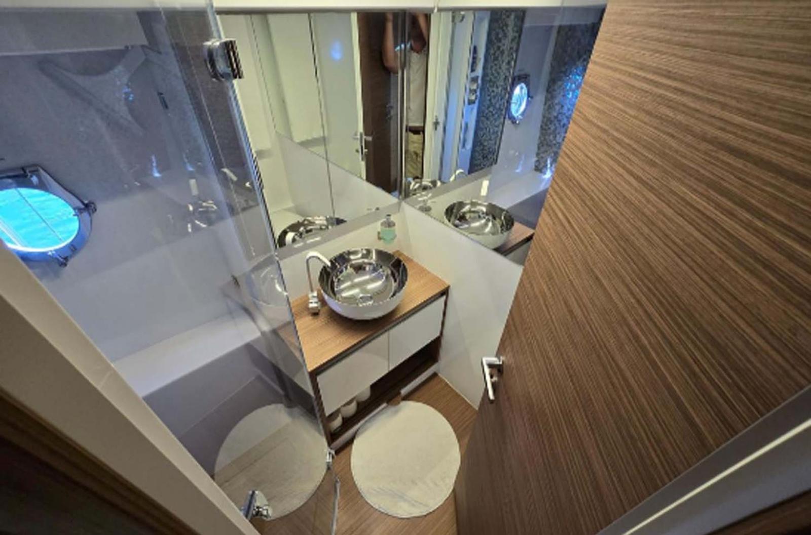Extensive equipment includes SEAKEEPER gyro stabilizer, Onan 11kW generator, air conditioning, hydraulic platform, joystick etc. Engines are upgraded as well (550hp each).