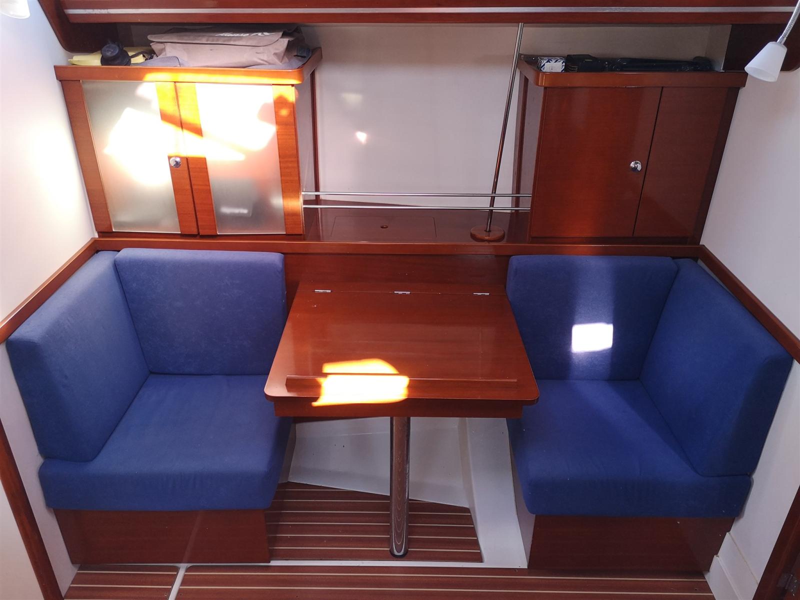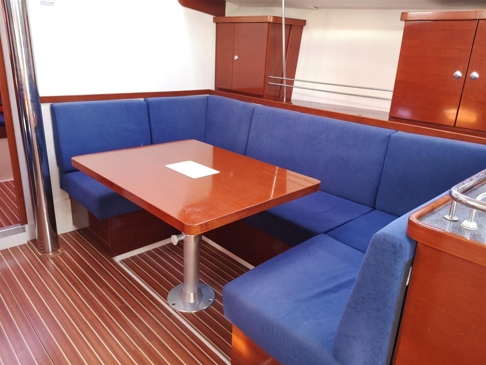Convertible dinette with folding table, L sofa with full cushions, chart table and two opposing sofas