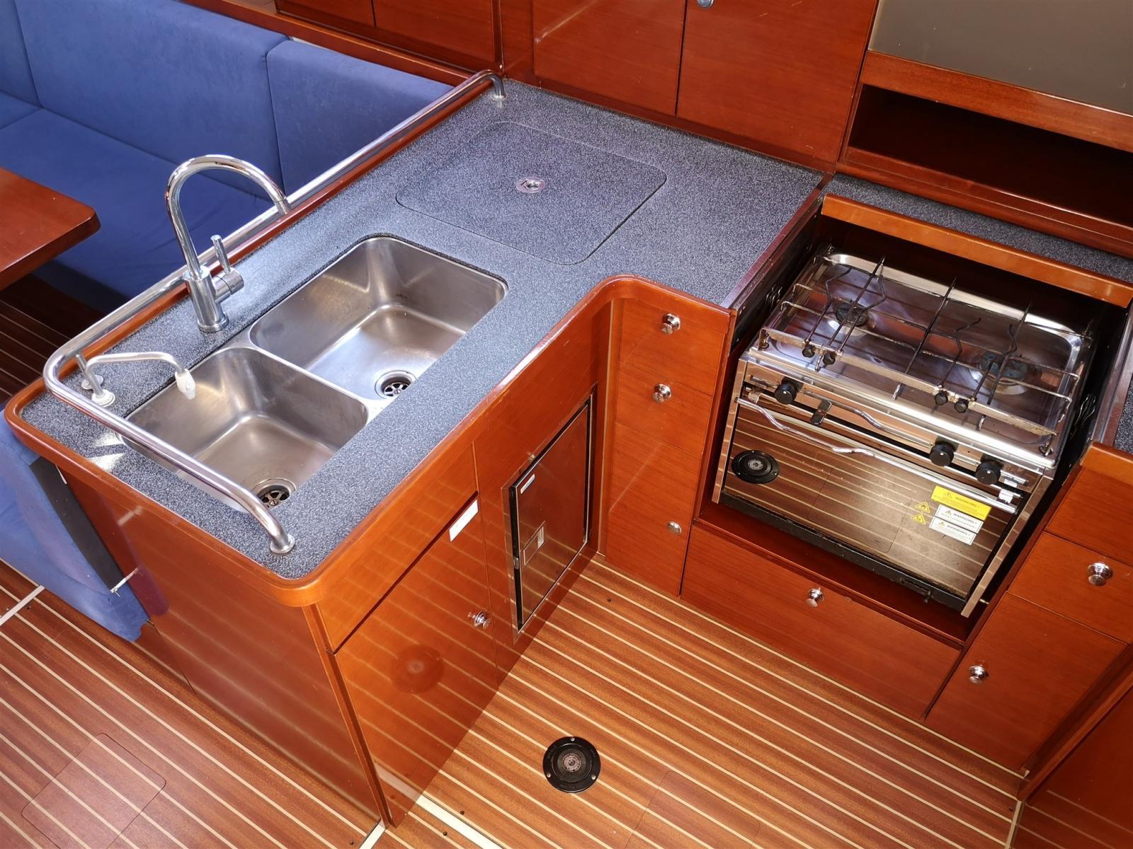 L-shaped kitchen complete with double sink with sea water pump, two-burner gas hob, oven and fridge
