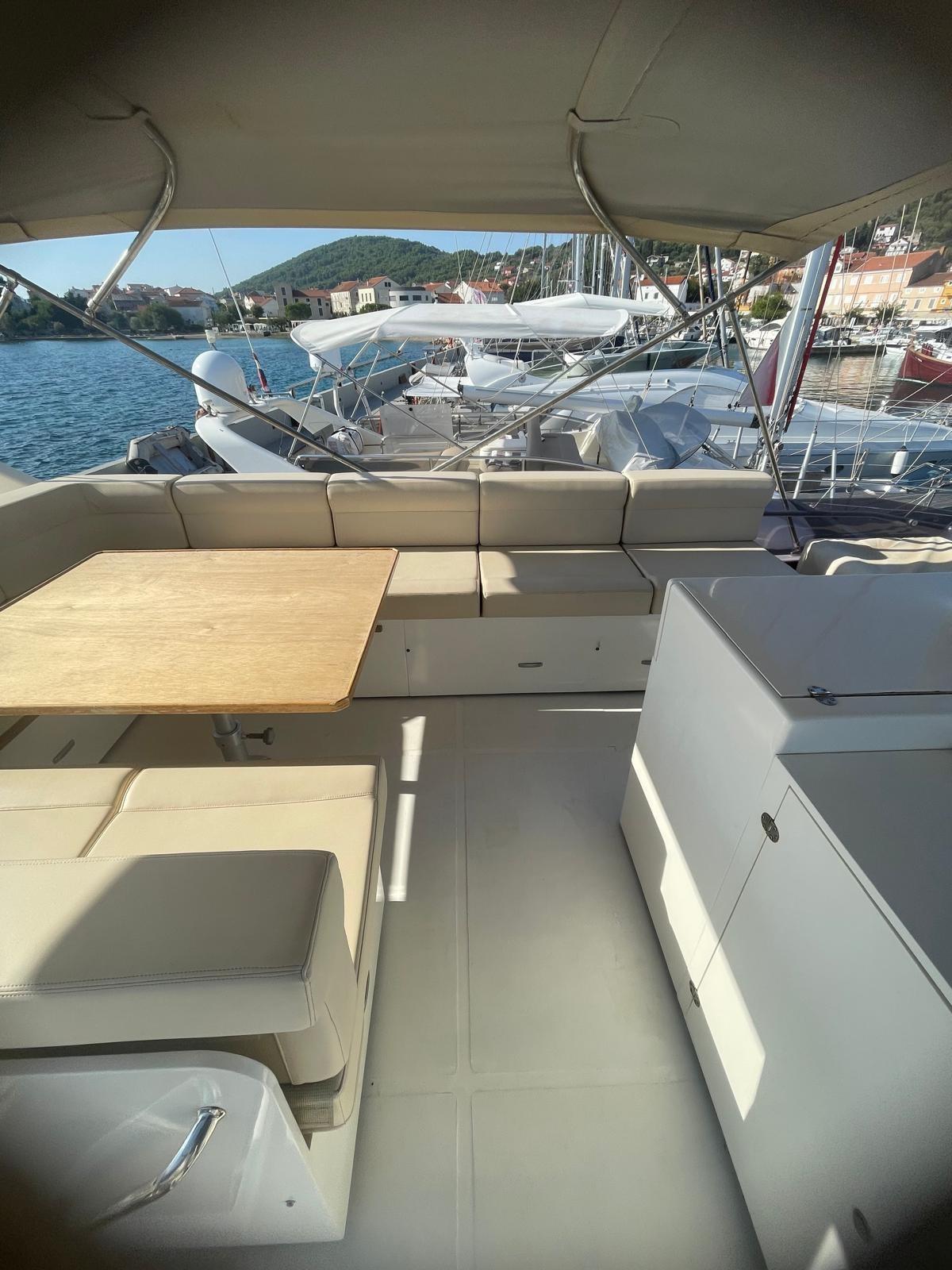 Engine Alarm, Bilge Alarm, Spare shaft, Water pressure pump, 6 Batteries, Teak Side Decks, Deck Shower, Directional Spotlight, Hydraulic Flaps, Fire Extinguishing System, Flaps Indicators, Courtesy Lights, Underwater lights, Gangway (Idraulica), Platform, Automatic Bilge Pump, Teak Cockpit, Shorepower connector, Water harbor connector system, Voltage Rectifier, Electric Windlass, swimming ladder, Waste Water Purifier System, cockpit table, Living Room Foldable Table, Horn, Stern Winches, Bow Winches.