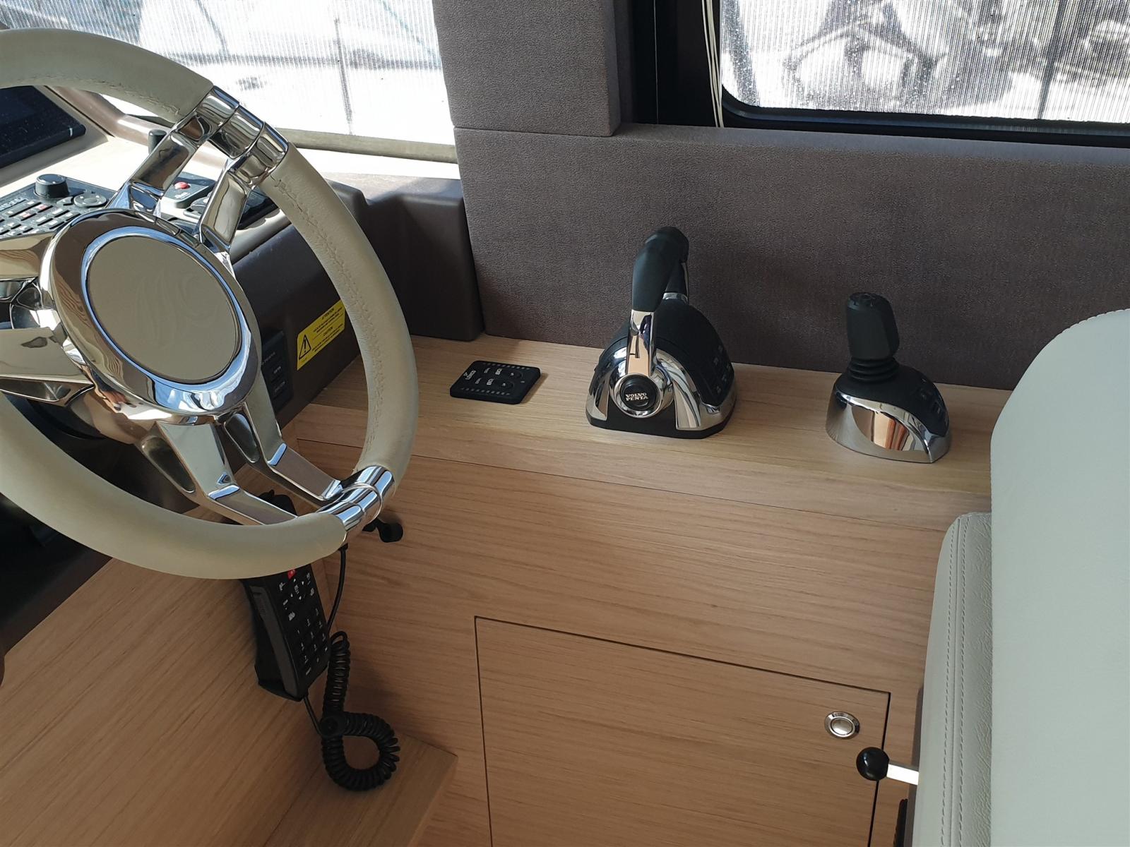 Fume/Gas Detector, 2 Engine Alarm, Bilge Alarm, Water pressure pump, Deck Shower, Twin Steering, Headlights fixed on the stem, Electric Flaps, 2 Flaps Indicators, Anchor Chain Washdown, Washbasin in the cockpit, Courtesy Lights, Gangway, Platform, Automatic Bilge Pump, 2 Electric Bilge Pump, Manual Bilge Pump, Entry door, Teak Cockpit, 2 Shorepower connector (230 V - 50 Hz 63A con cavo di 15m), Water harbor connector system, Electric Windlass, swimming ladder, cockpit table, Living Room Foldable Table, Tender, Horn, Stern Winches, Bow Winches.