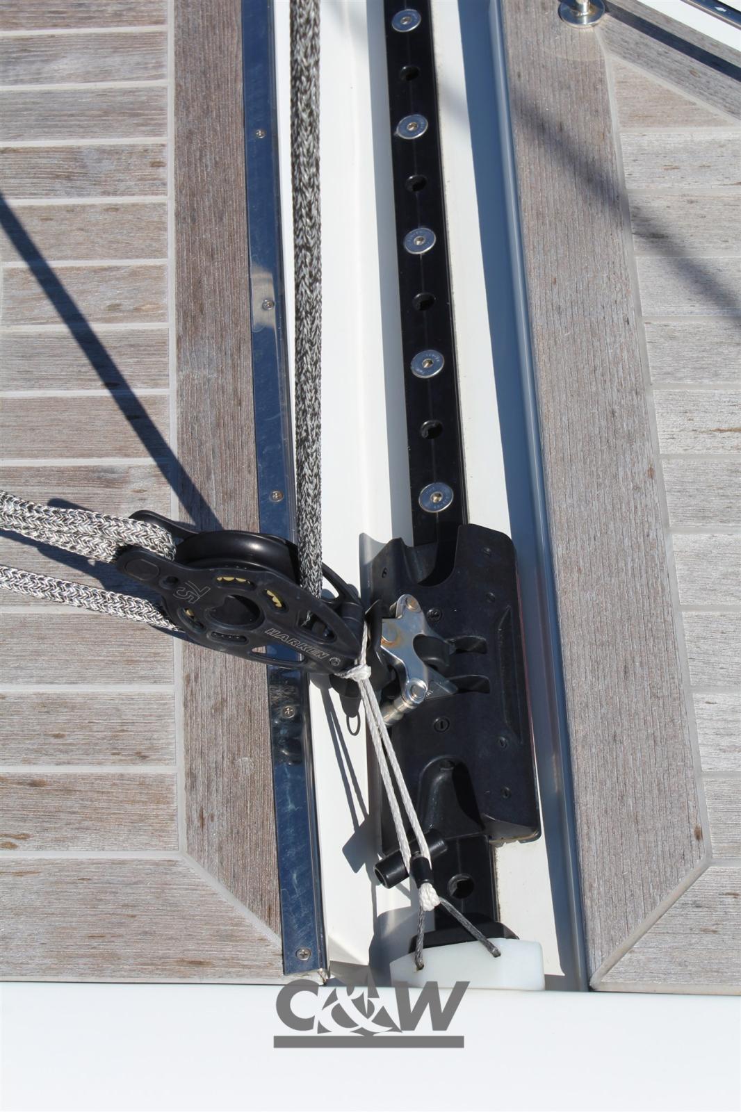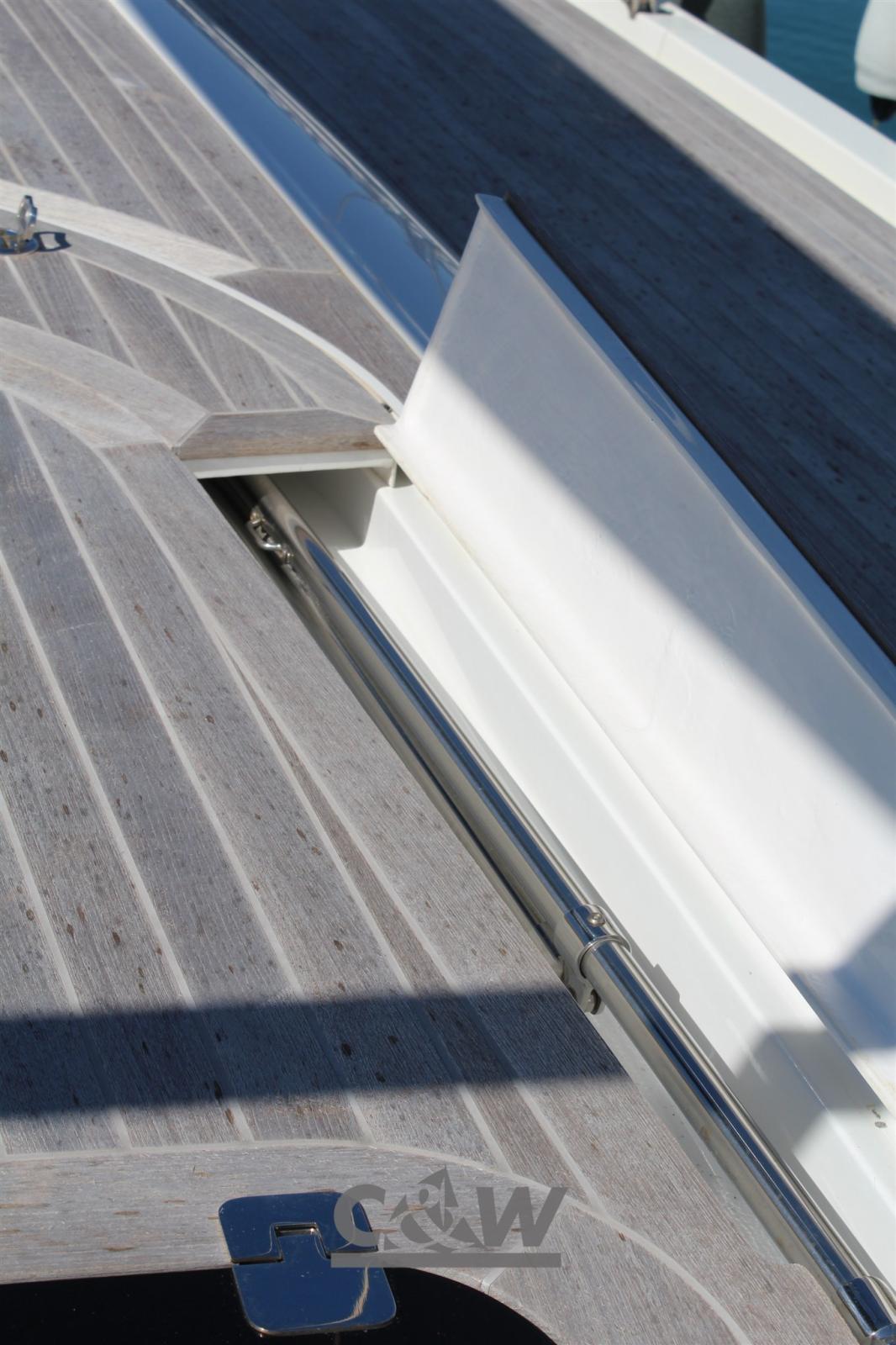 Teak Side Decks, Bow Thruster (VIP 150 12V con batteria dedicata), Tender Garage (attrezzato), Gangway (carbonio), Platform (con scala integrata e comandi in pozzetto), Electric Windlass, cockpit table, Tender (Aermarine Cabrio 245 + motore fb Torqedo 3Hp), Teak Deckhouse, 2 Winch (Harken Performa 60), 2 Winch Electric.