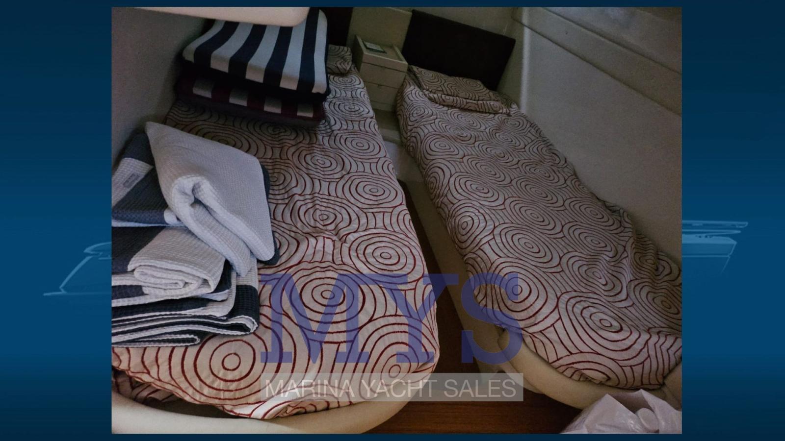 2 seats with single beds on the floor that can be converted into a double bed in the aft cabin with closing door, sink in the room and manual toilet