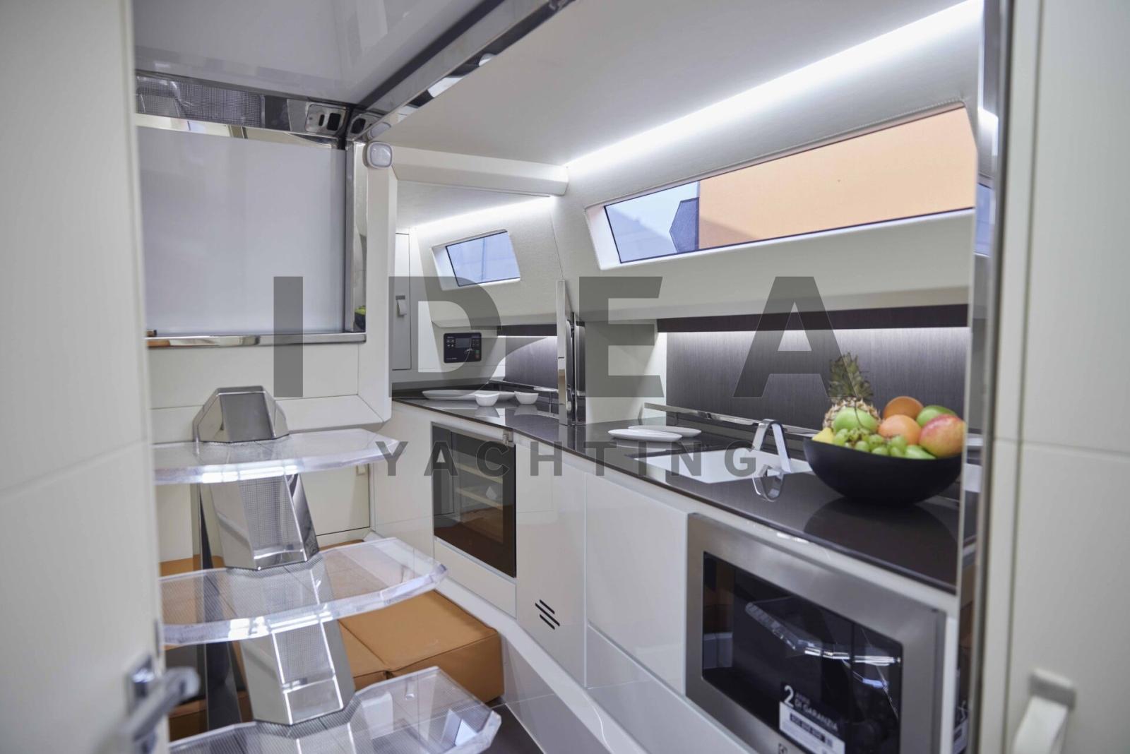 Galley, 3 Deck Refrigerator (1 drawer refrigerator under the seat, 2 drawer refrigerator under the sundeck), Refrigerator (42 lt), ICE Maker, Ceramic hot plate (Induction), Winecooler (12 bottles).