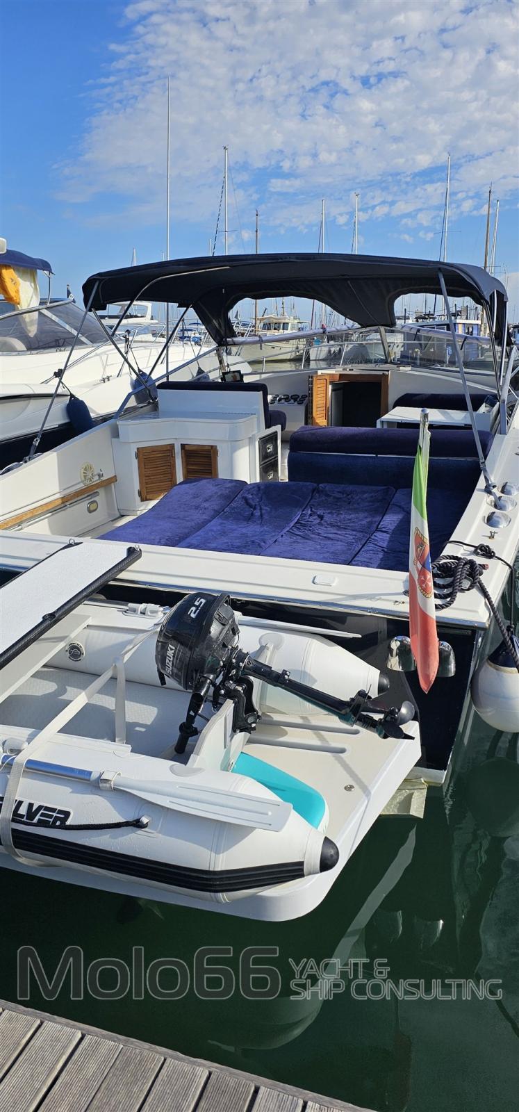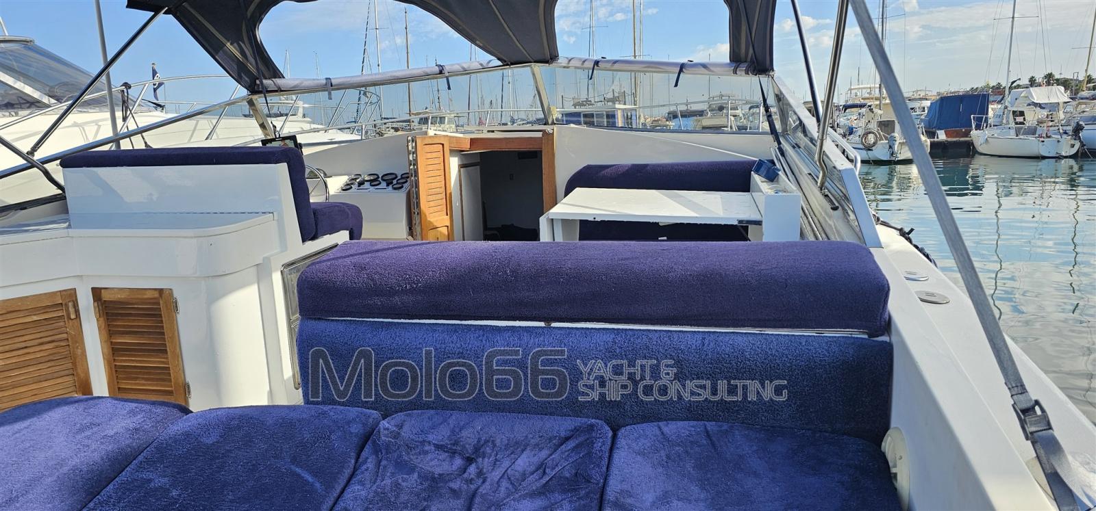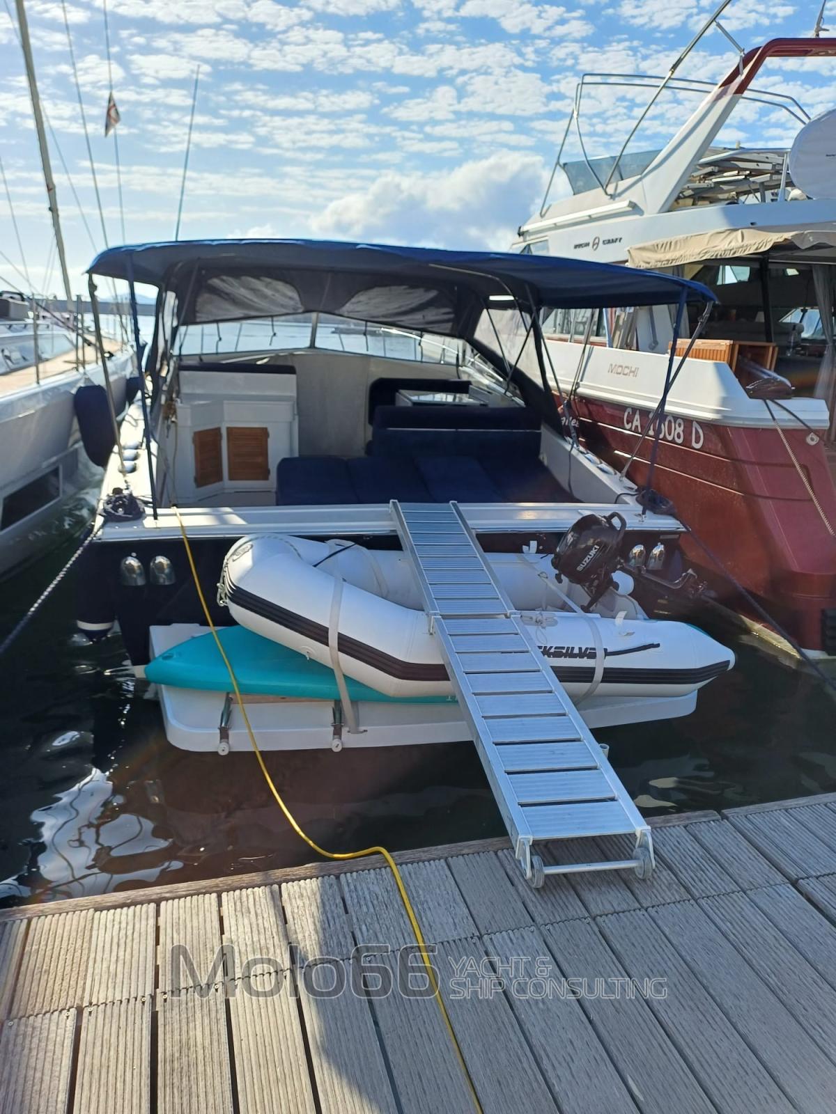 Fume/Gas Detector, Engine Alarm, Bilge Alarm, Water pressure pump, 5 Batteries, Deck Shower, Electric Flaps, Hydraulic Flaps, Fire Extinguishing System, Flaps Indicators, Courtesy Lights, Gangway, 3 Electric Bilge Pump, Shorepower connector, Water harbor connector system, Electric Windlass, swimming ladder, cockpit table, Living Room Foldable Table, Tender, Horn.