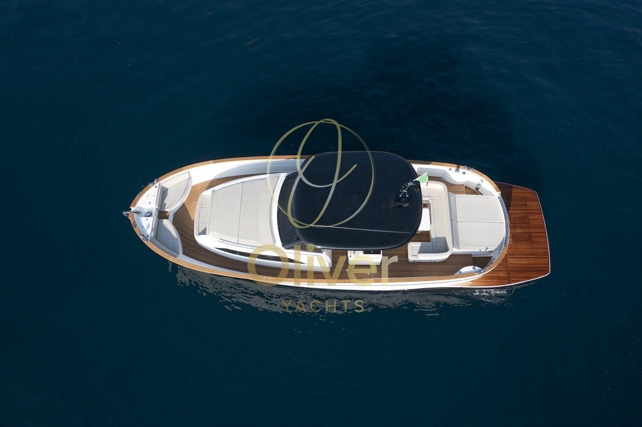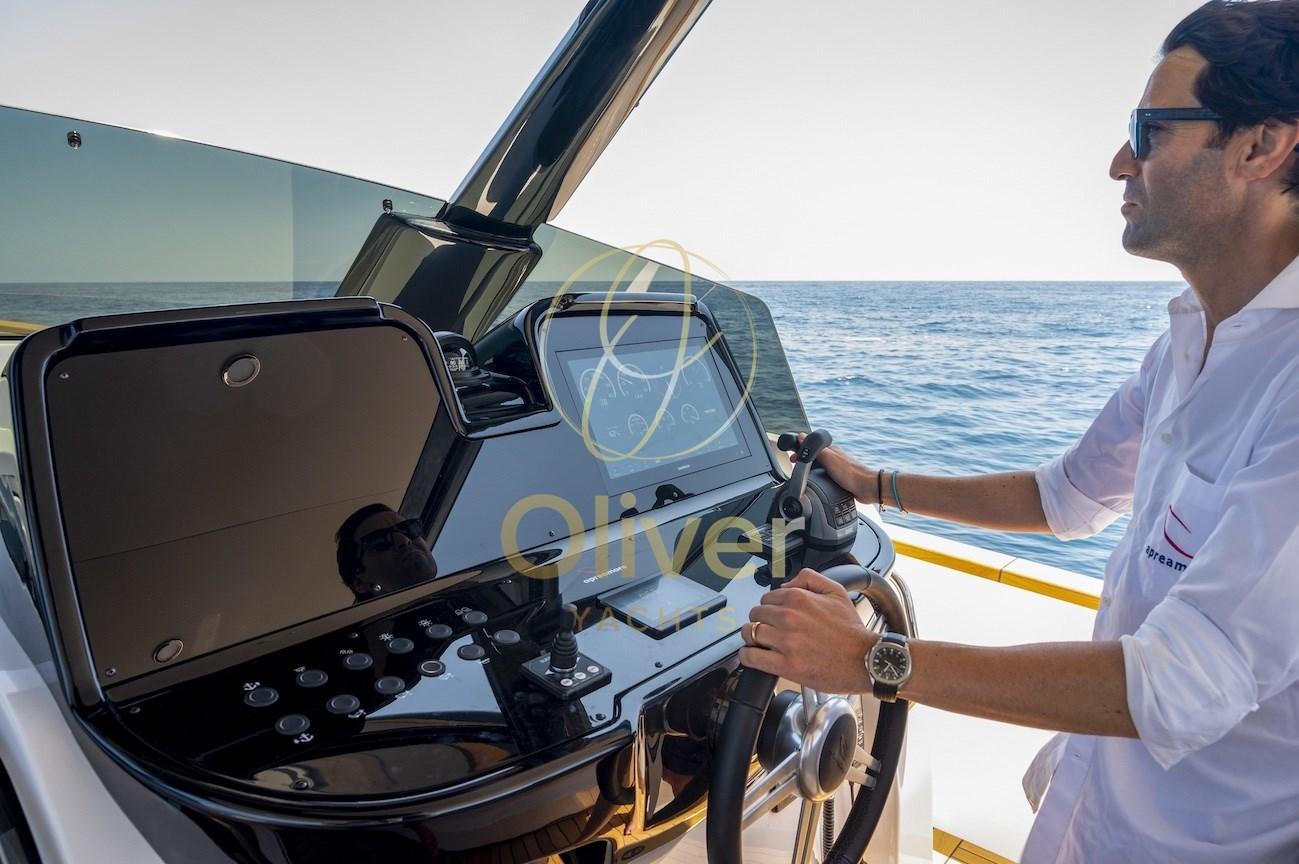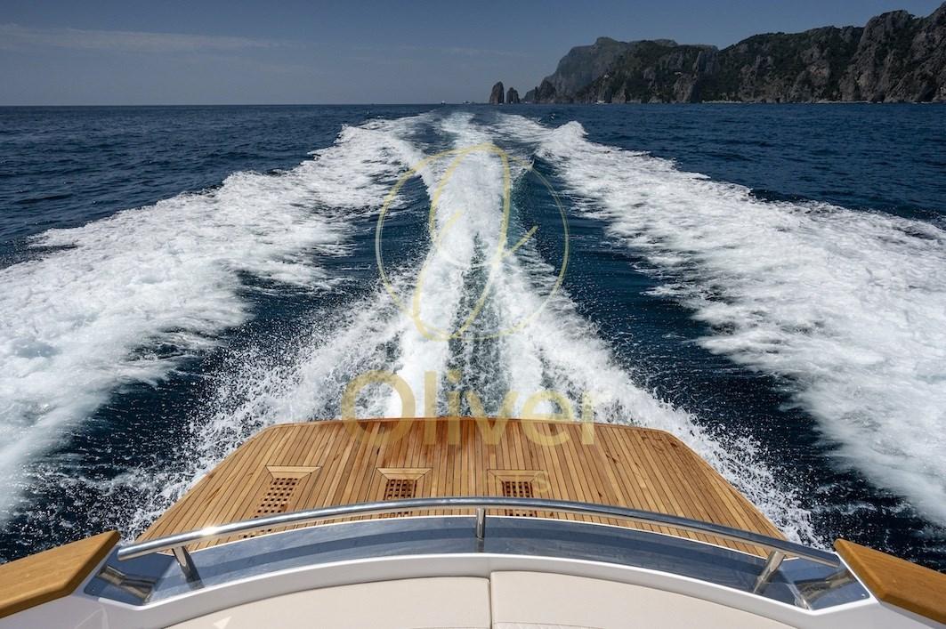 Fume/Gas Detector, Engine Alarm, Bilge Alarm, Anchor (Bruce 20 Kg), Water pressure pump, Teak Side Decks, Shore power cable, Deck Shower (A poppa calda e fredda), Electric Flaps (Intruder Volvo Penta), Hard top, Fire Extinguishing System (Sala macchine a polvere), Flaps Indicators, Washbasin in the cockpit, Courtesy Lights, 6 Fenders, Gangway (Idraulica a scomparsa Opacmare), Platform, 3 Automatic Bilge Pump, Teak deck, Teak Cockpit, Shorepower connector, Electric Windlass (1700 W), swimming ladder (Idraulica a scomparsa Opacmare), cockpit table, Horn, 2 Stern Winches, Bow Winches.