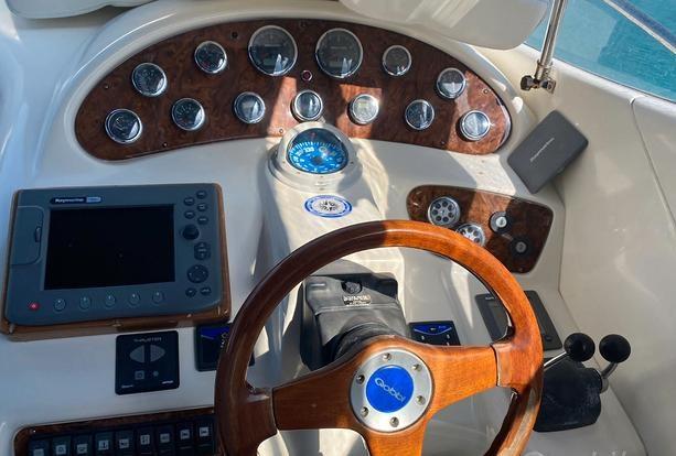 Engine Alarm, Bilge Alarm, Deck Shower, Hydraulic Flaps, Flaps Indicators, Courtesy Lights, Gangway (idraulica), Platform (teak), Entry door, Teak Cockpit, Shorepower connector, Water harbor connector system, Rollbar, Electric Windlass, swimming ladder, cockpit table, Horn.