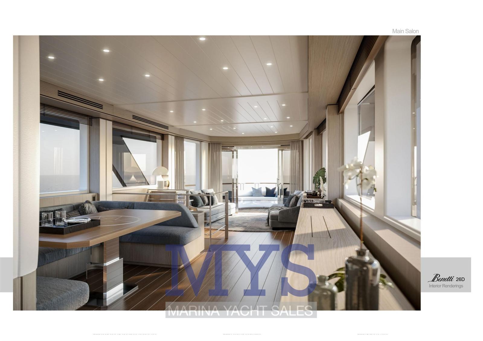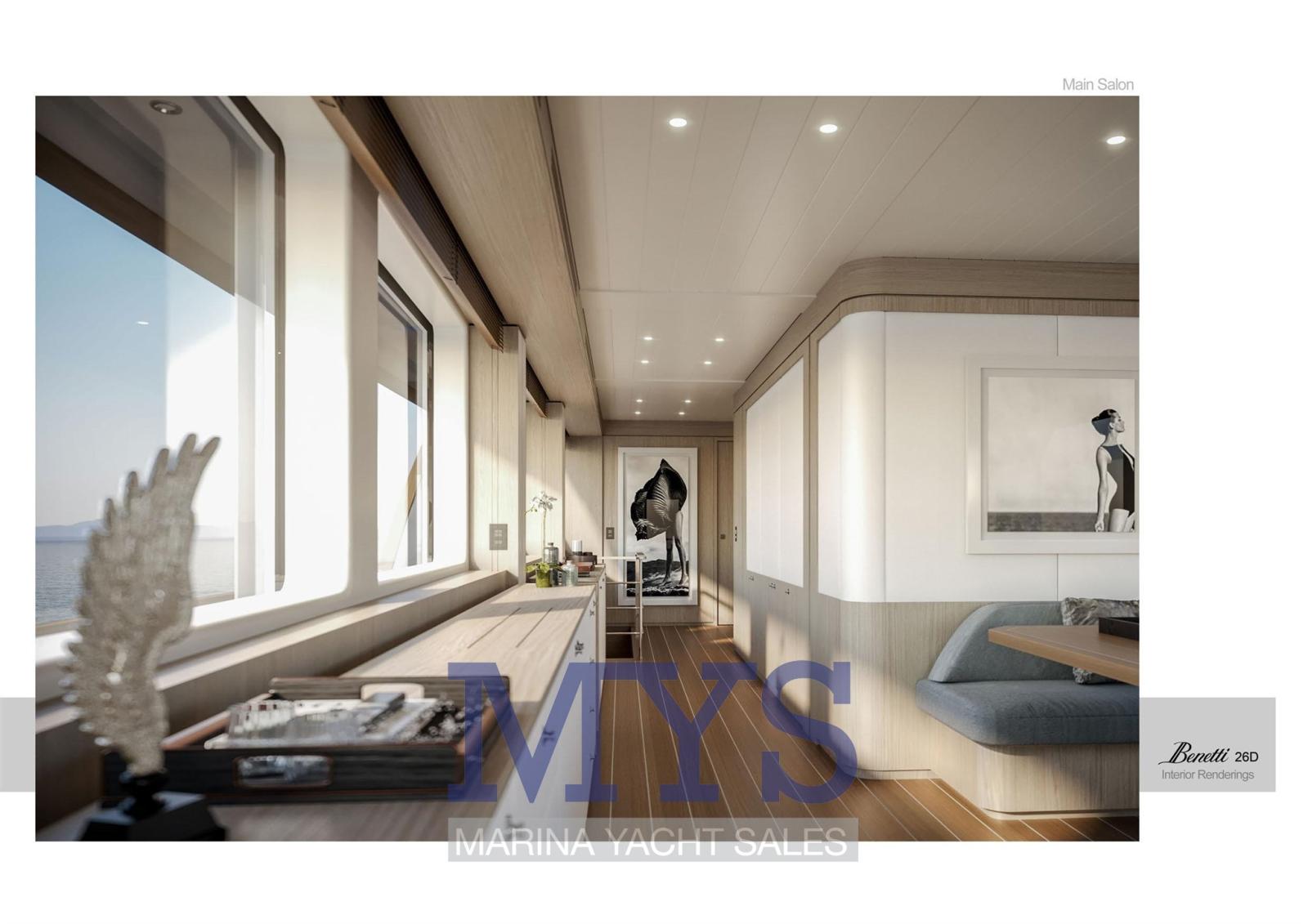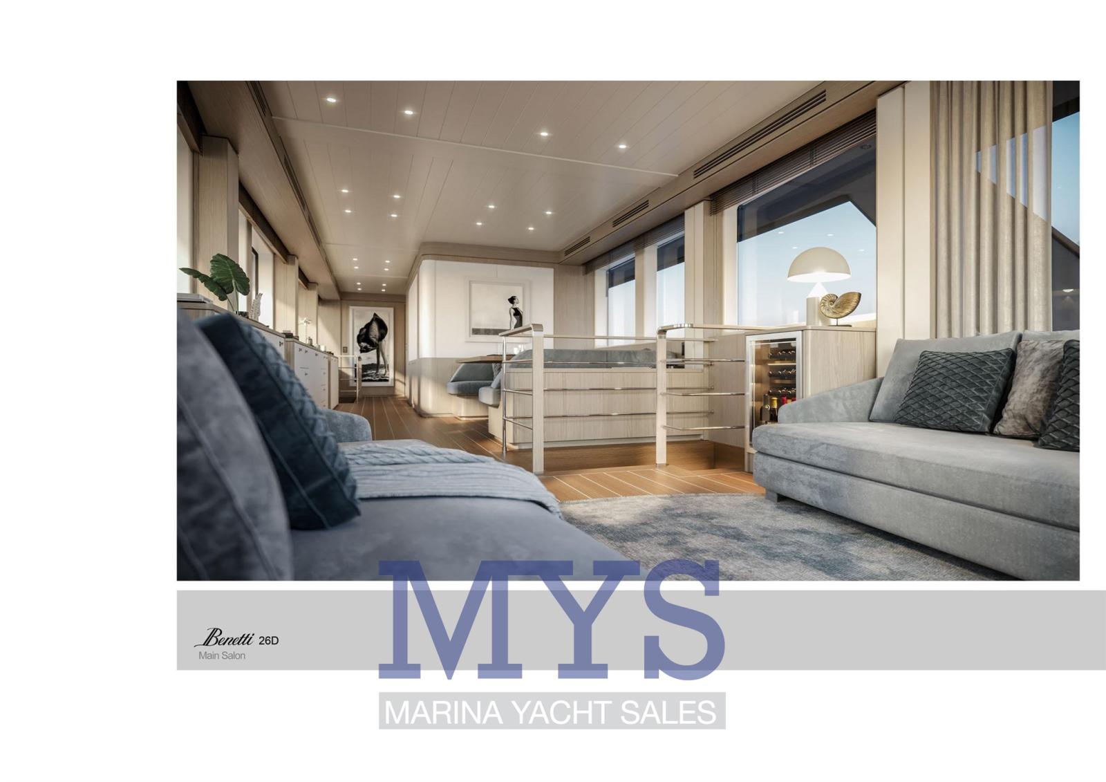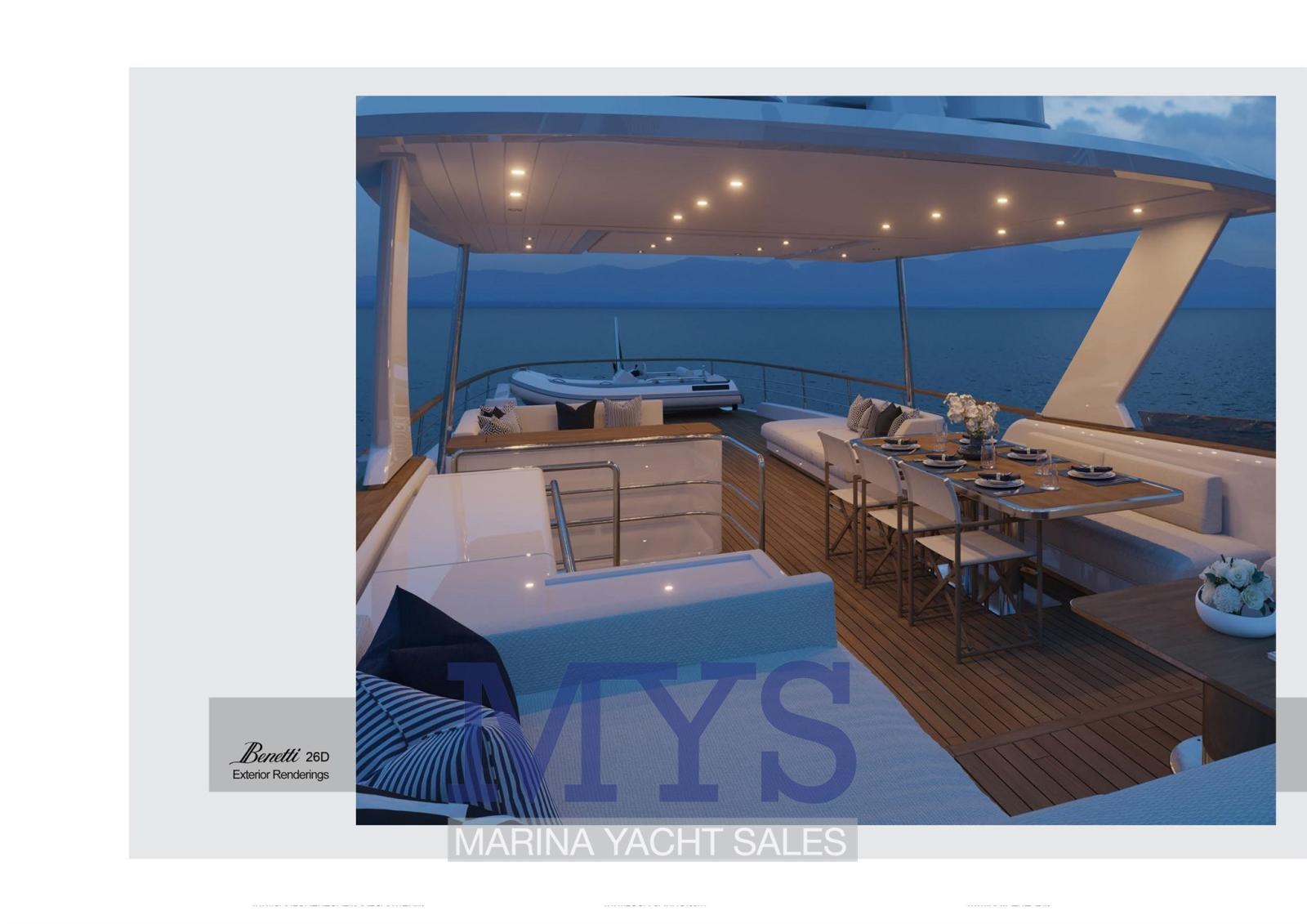 Fume/Gas Detector, Engine Alarm, Bilge Alarm, 2 Anchor, Water pressure pump, Draining System, Teak Side Decks, Deck Shower, Directional Spotlight, Tender Crane (Su Fly Bridge), Davits for tender on fly, Hard top (Fly Bridge), Anchor Chain Washdown, Courtesy Lights, Underwater lights, Gangway (A scomparsa), Automatic Bilge Pump, Manual Bilge Pump, Entry door, Side door, Teak Cockpit, Shorepower connector, Water harbor connector system, Electric Windlass, Gang Board, swimming ladder, Waste Water Purifier System, Stabilizers, cockpit table, Tender, Horn, T-Top, Stern Winches, Bow Winches.