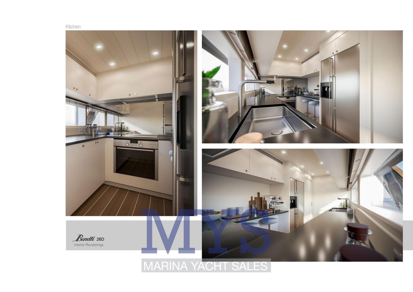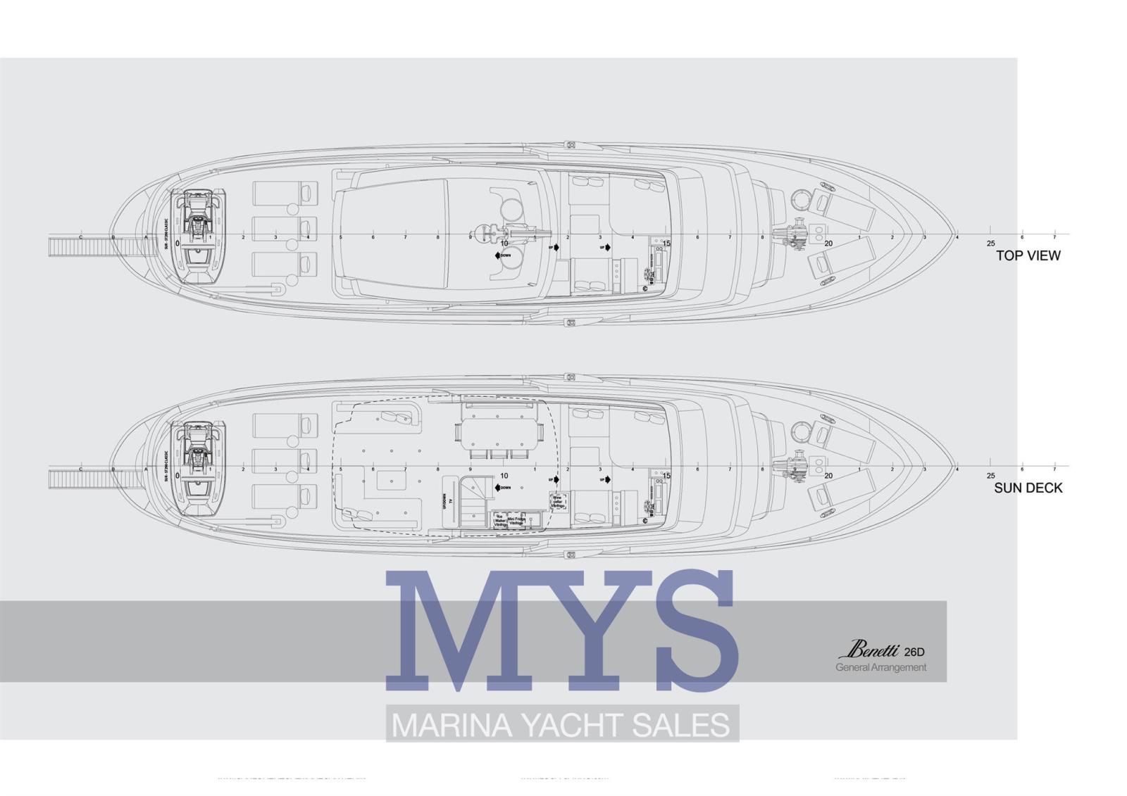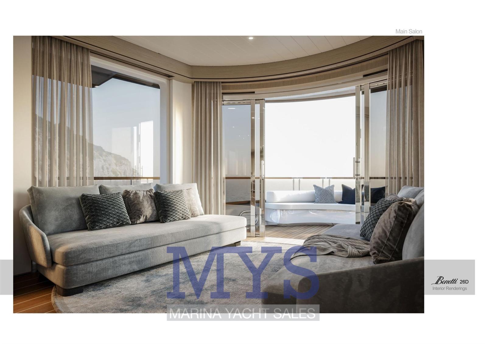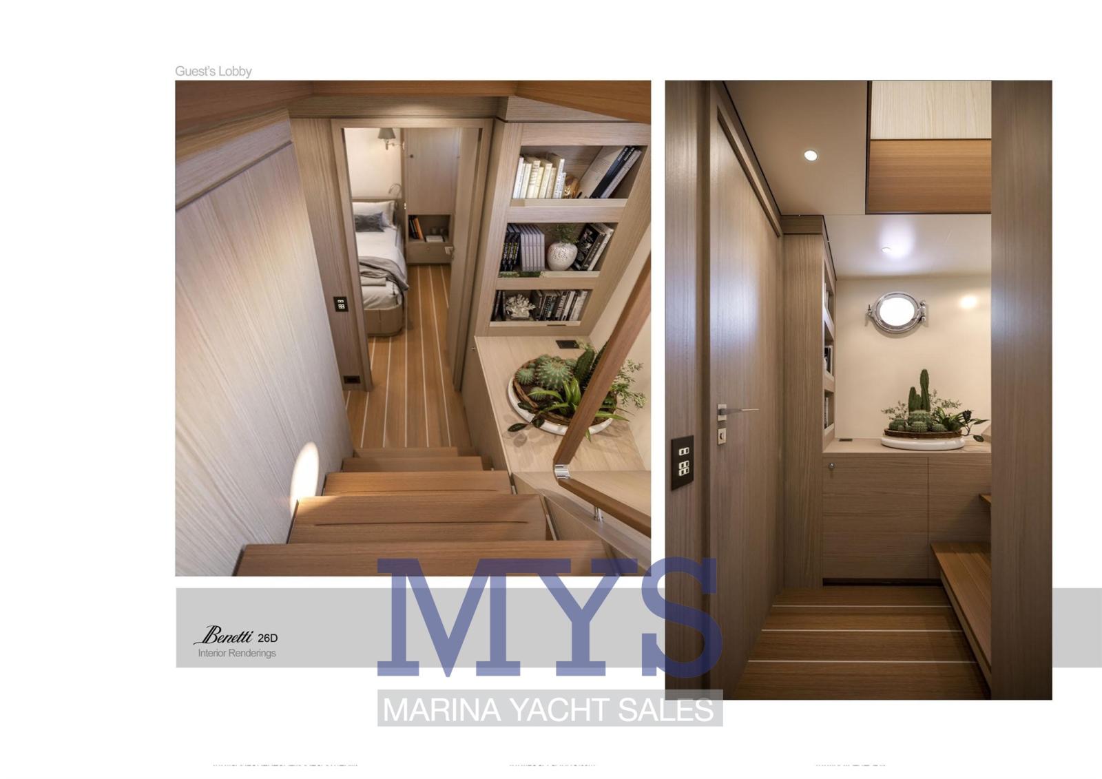 Fume/Gas Detector, Engine Alarm, Bilge Alarm, 2 Anchor, Water pressure pump, Draining System, Teak Side Decks, Deck Shower, Directional Spotlight, Tender Crane (Su Fly Bridge), Davits for tender on fly, Hard top (Fly Bridge), Anchor Chain Washdown, Courtesy Lights, Underwater lights, Gangway (A scomparsa), Automatic Bilge Pump, Manual Bilge Pump, Entry door, Side door, Teak Cockpit, Shorepower connector, Water harbor connector system, Electric Windlass, Gang Board, swimming ladder, Waste Water Purifier System, Stabilizers, cockpit table, Tender, Horn, T-Top, Stern Winches, Bow Winches.