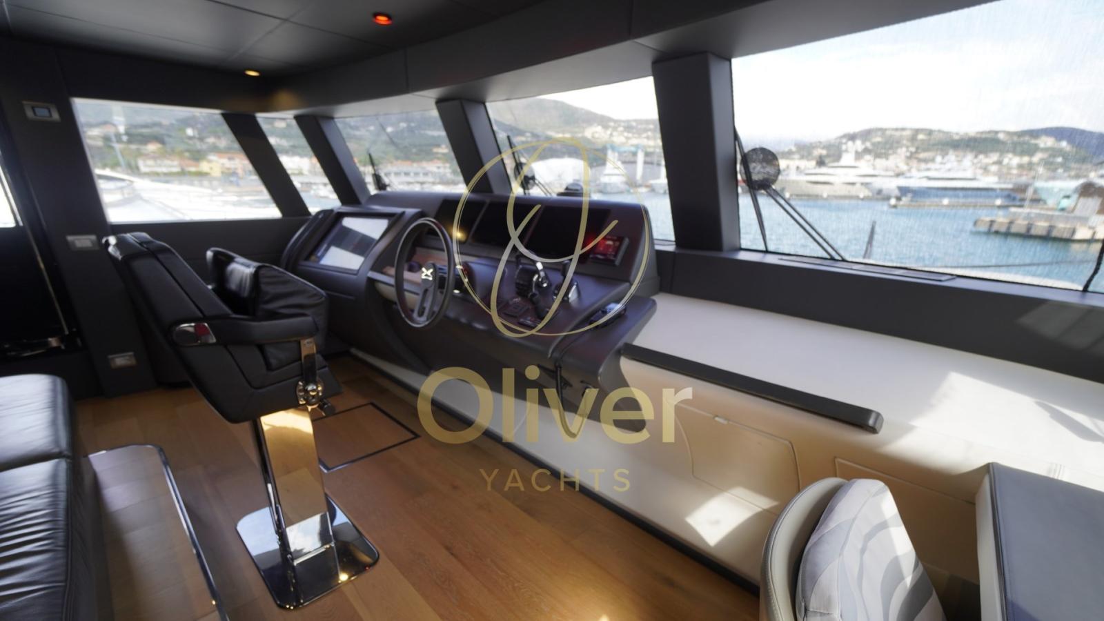 Fume/Gas Detector, Engine Alarm, Bilge Alarm, Electric Engine Compartment Opening, Auto Dynamic Trim Interceptor, Water pressure pump, Auto-Trim, Draining System, Teak Side Decks, Canvas Wing, Deck Shower, Twin Steering, Headlights fixed on the stem, Directional Spotlight, Electric Flaps (INTERCEPTOR), Tender Garage, Crane (HYDR 800 KG), Fire Extinguishing System, Compressor Air System, Anchor Chain Washdown, Courtesy Lights, Underwater lights, Jet-Ski, Gangway, Platform (TRANSFORMER OPAC), Automatic Bilge Pump, Manual Bilge Pump, Entry door, 6 Side door, Teak Cockpit, Shorepower connector, Water harbor connector system, Voltage Rectifier, 2 Electronic instrumentation repeater, 2 Electric Windlass (LOFRANS), swimming ladder, Saddles for tender, Waste Water Purifier System, Stabilizers (PINNE ABT TRAC eTRAC 250/9x), cockpit table, Tender (JOKER BOAT 470 + YAMAHA 40HP), Horn, Teak Deckhouse, 2 Stern Winches (ELETTRICO), 2 Bow Winches (ELETTRICO).