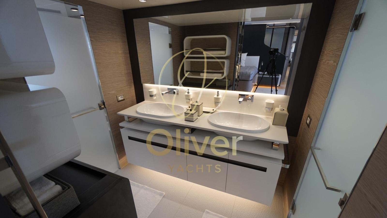 • Main Deck: open space saloon with large panoramic windows, lounge area, master cabin with office area and bathroom with double sink and large shower with window.