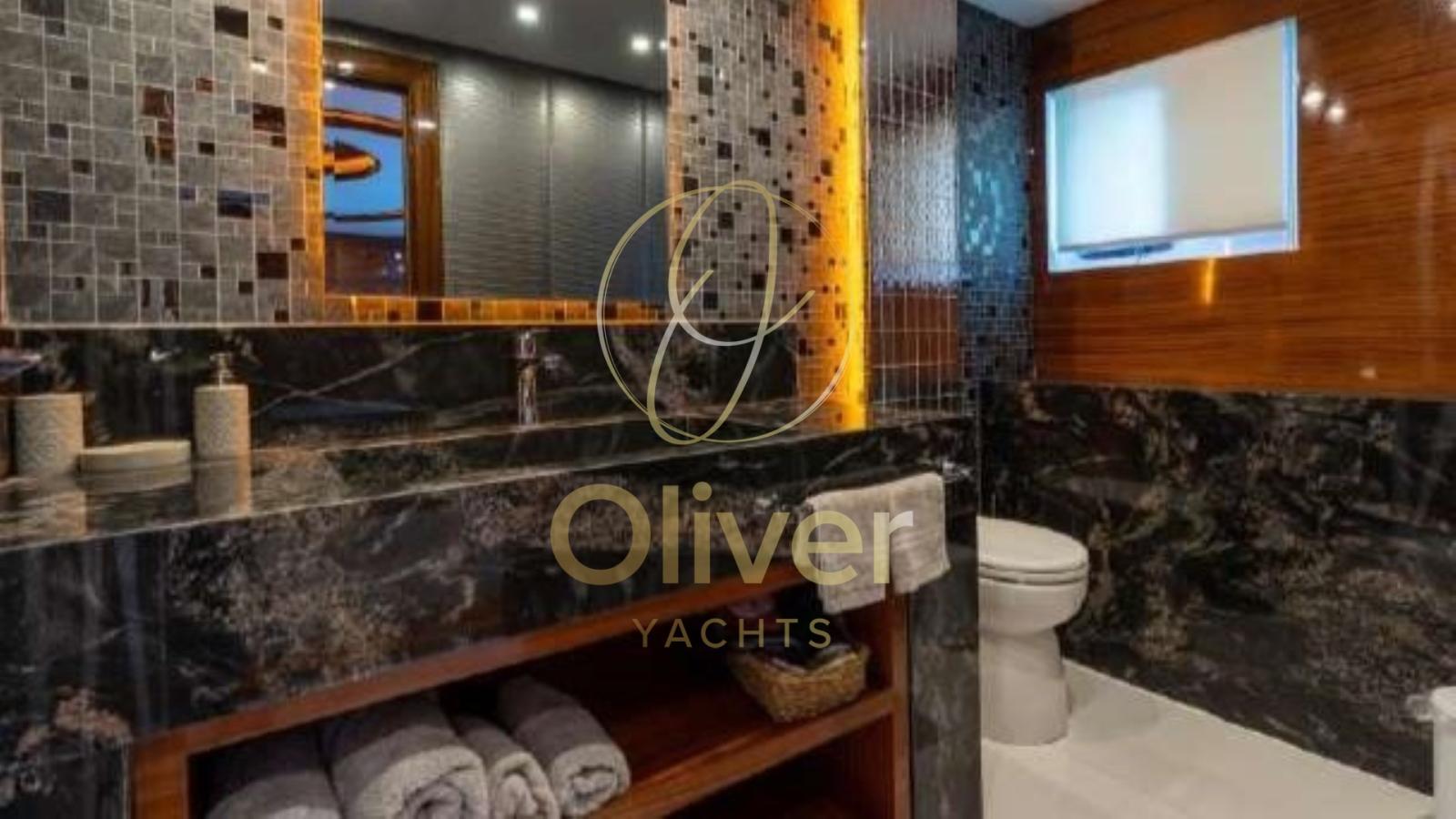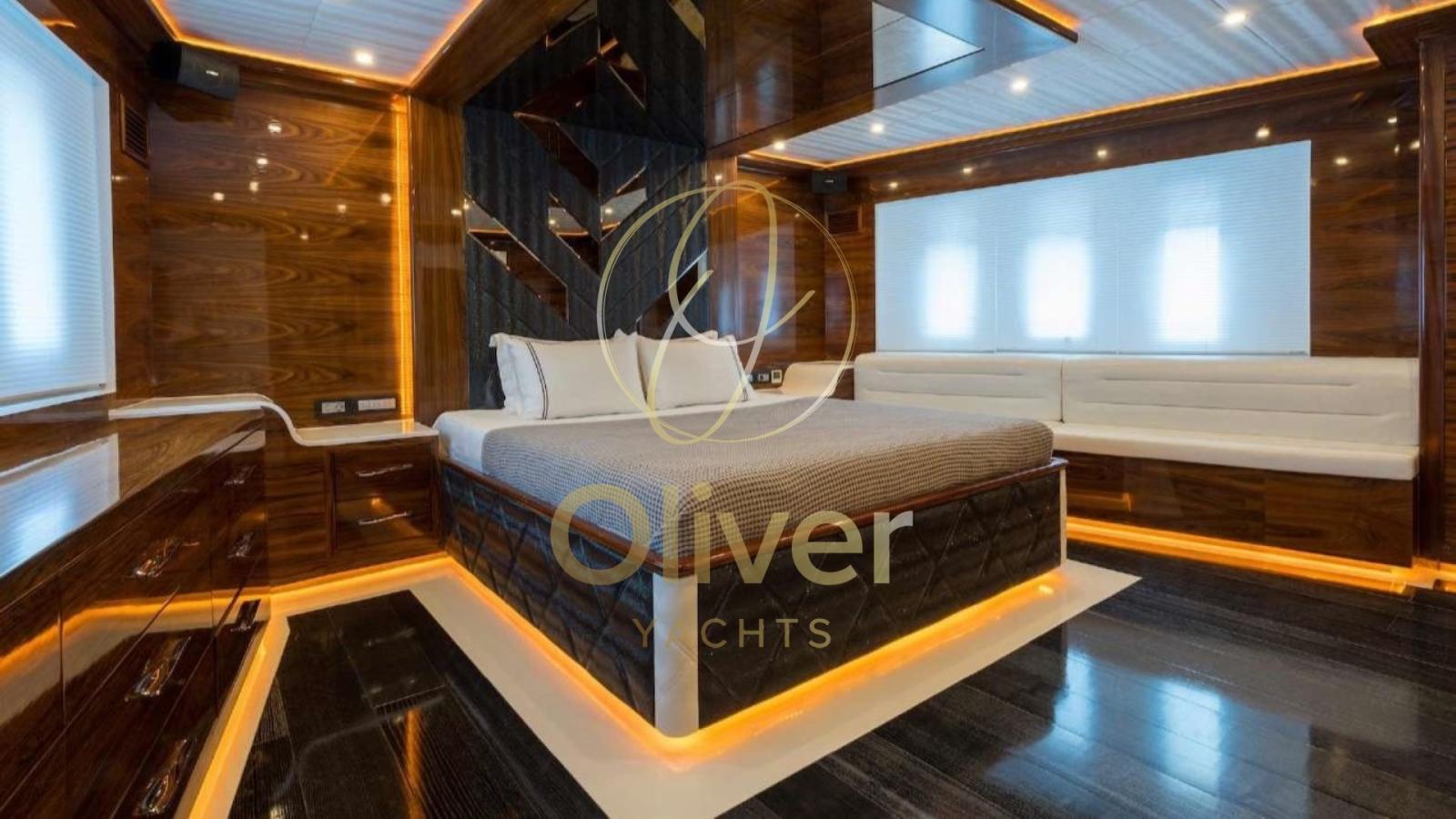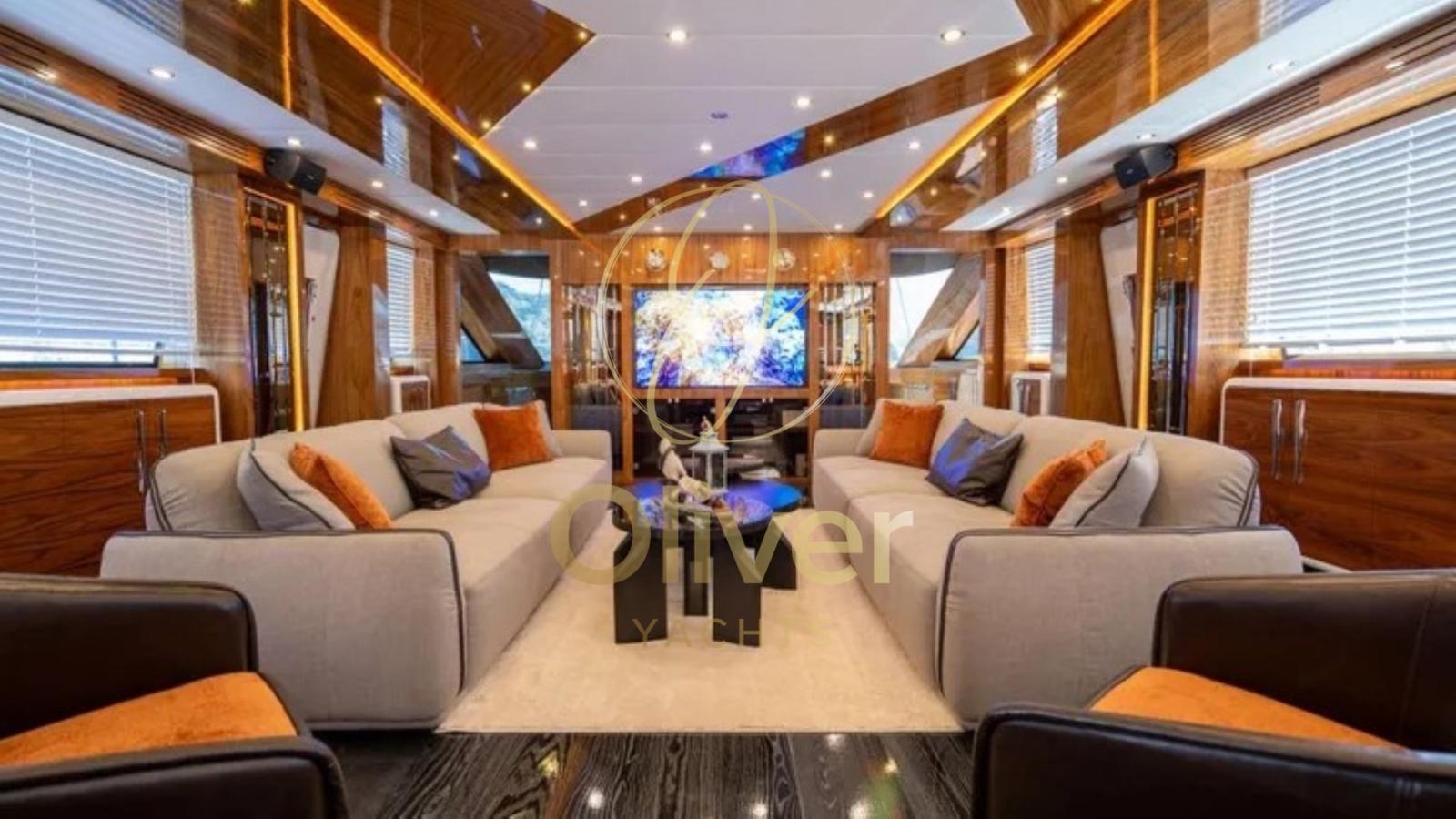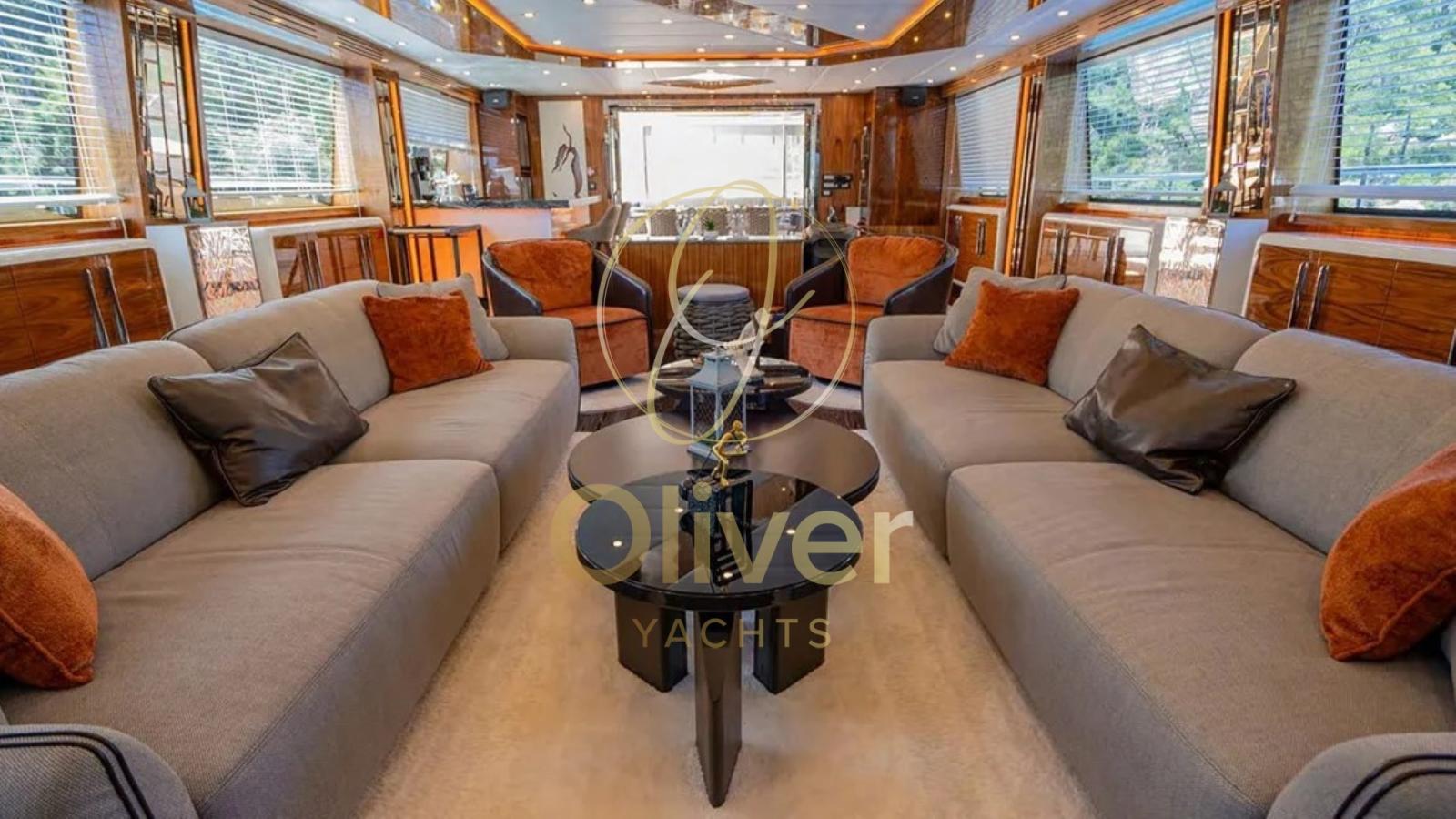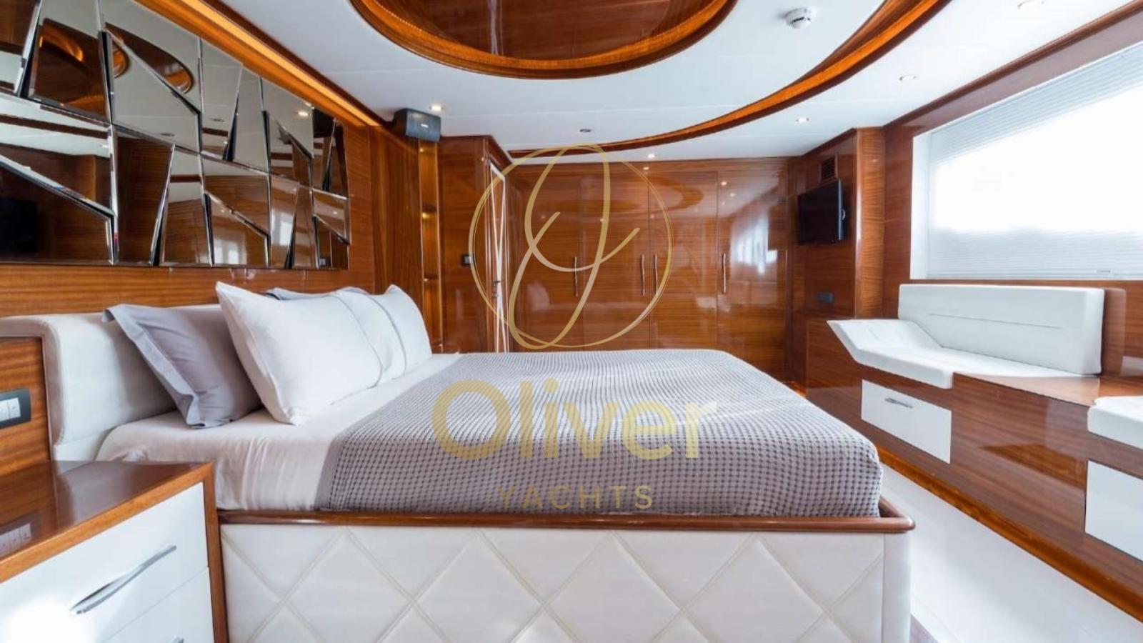 The interiors offer a perfect balance between refinement and comfort, designed to welcome guests in an elegant, welcoming environment full of attention to detail. The main salon opens into a large, bright space, characterized by fine wood finishes, modern furnishings and warm tones that contribute to creating a relaxing and sophisticated atmosphere. Large windows allow natural light to envelop the environment, giving a continuous view of the sea even while sailing. The lounge area is furnished with comfortable sofas and spaces dedicated to relaxation and conversation, while the indoor dining area is an elegant alternative for private dinners, in an intimate and refined context. Each space is designed to ensure maximum functionality, without sacrificing aesthetics and comfort. The five cabins: 1 master and 4 guests offer spacious, quiet and tastefully furnished environments. The owner's suite, particularly large and bright, is equipped with a king-size bed, large wardrobes and a private bathroom with modern finishes. The three VIP double cabins and the twin cabin are also equipped with private bathrooms, air conditioning and satellite TV, ensuring maximum relaxation and privacy for all guests. Every detail of the interior has been designed to offer an exclusive sensory experience, where design, comfort and functionality blend harmoniously, transforming every moment on board into a special occasion of well-being and pleasure.