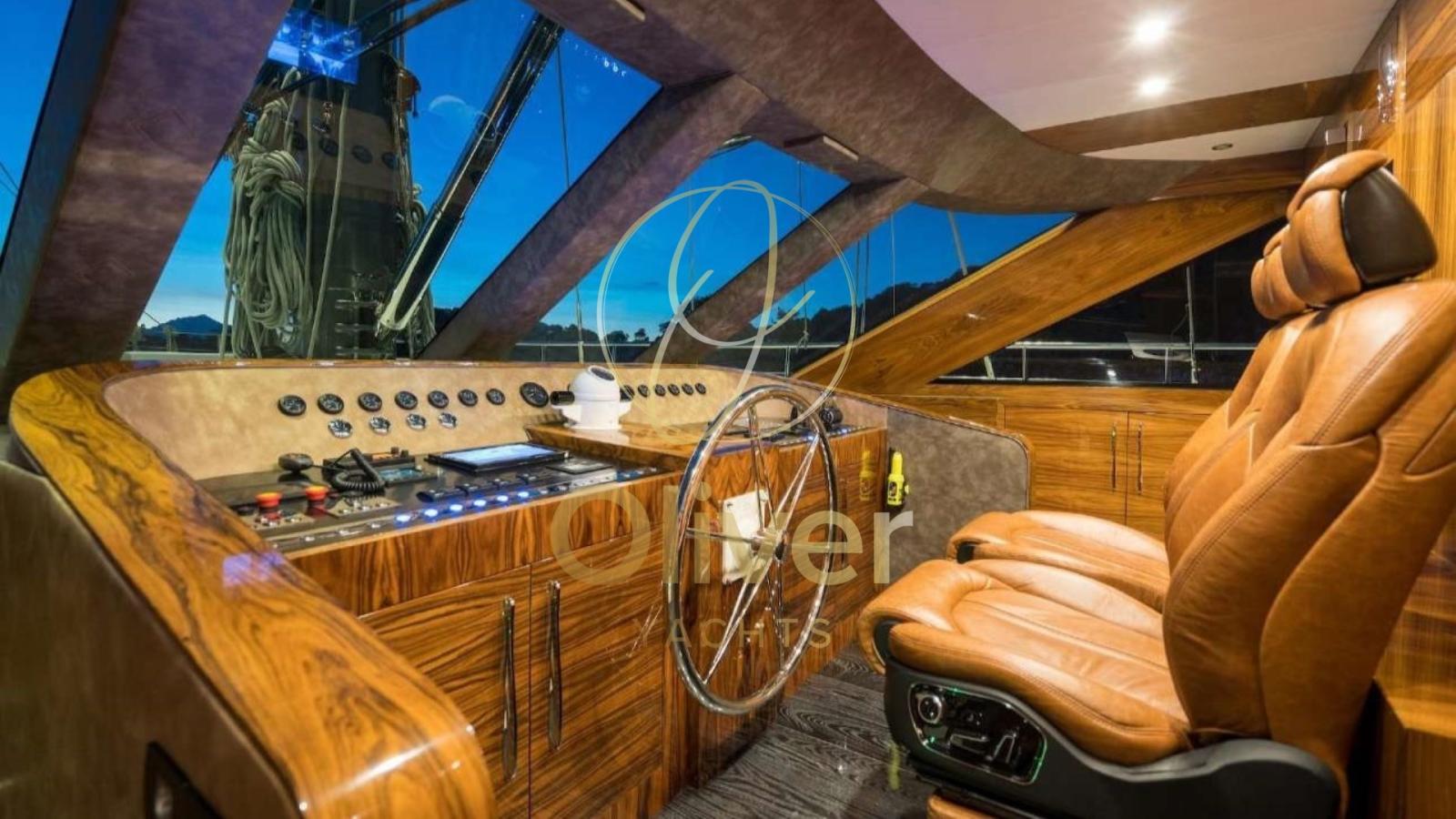 Fume/Gas Detector, Engine Alarm, Bilge Alarm, 2 Anchor, Electric Engine Compartment Opening, Spare shaft, Water pressure pump, Auto-Trim, Electric cable reel, Folding cleats, Draining System, Teak Side Decks, Canoe, Deck Shower, Twin Steering, Secondary Propeller, Headlights fixed on the stem, Directional Spotlight, Tender Crane, Fire Extinguishing System, Compressor Air System, Anchor Chain Washdown, Washbasin in the cockpit, Courtesy Lights, Underwater lights, Jet-Ski, Auxiliary Engine, Gangway, Platform, Automatic Bilge Pump, Manual Bilge Pump, Entry door, Side door, Teak Cockpit, Shorepower connector, Water harbor connector system, Voltage Rectifier, Electronic instrumentation repeater, Rollbar, Electric Windlass, Hydraulic Windlass, Manual Windlass, Strand rigging, Gang Board, swimming ladder, Saddles for tender, Waste Water Purifier System, Stabilizers, cockpit table, Tender, guard rails with gates, Horn, Teak Deckhouse, Winch Hydraulic, Stern Winches, Bow Winches, Windex.