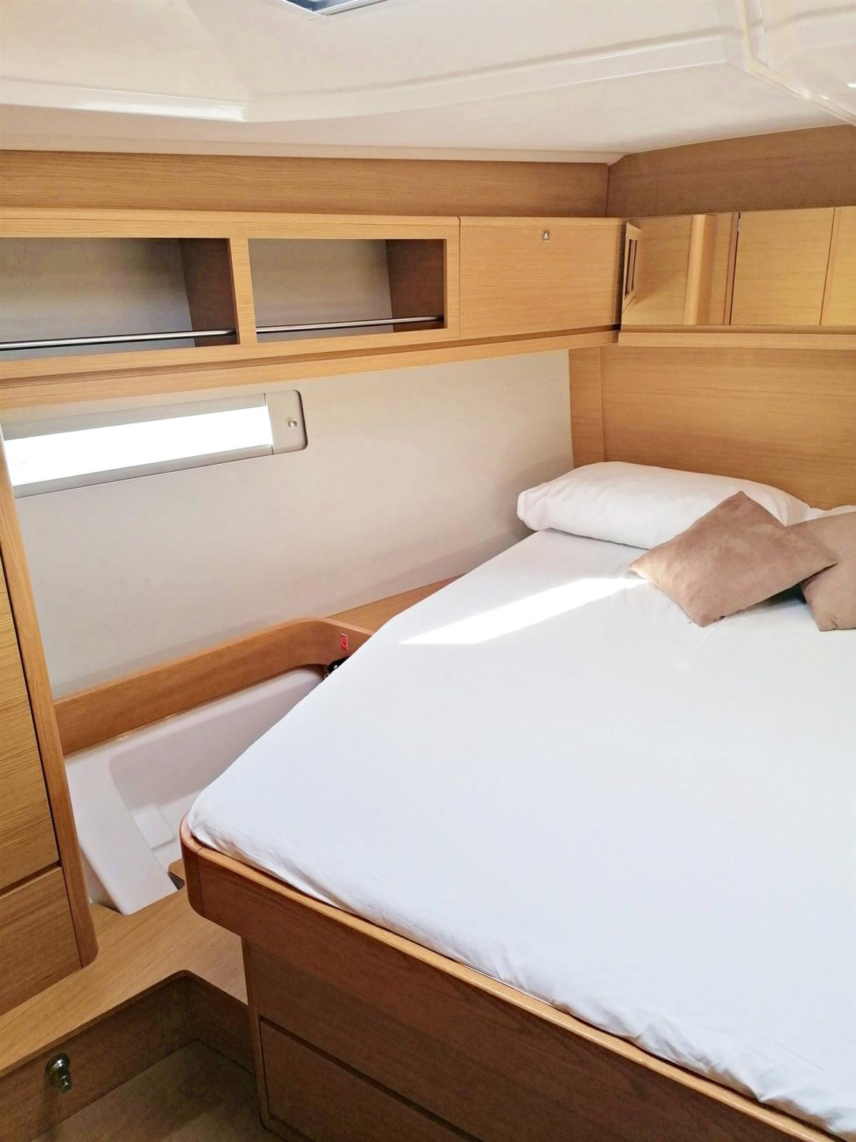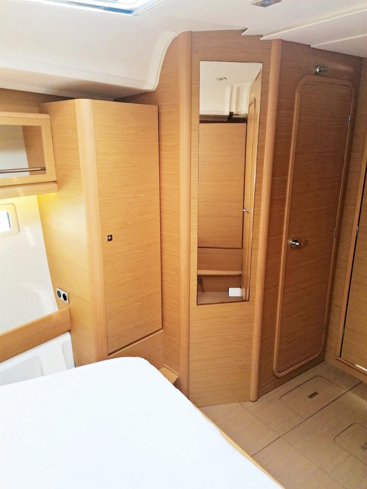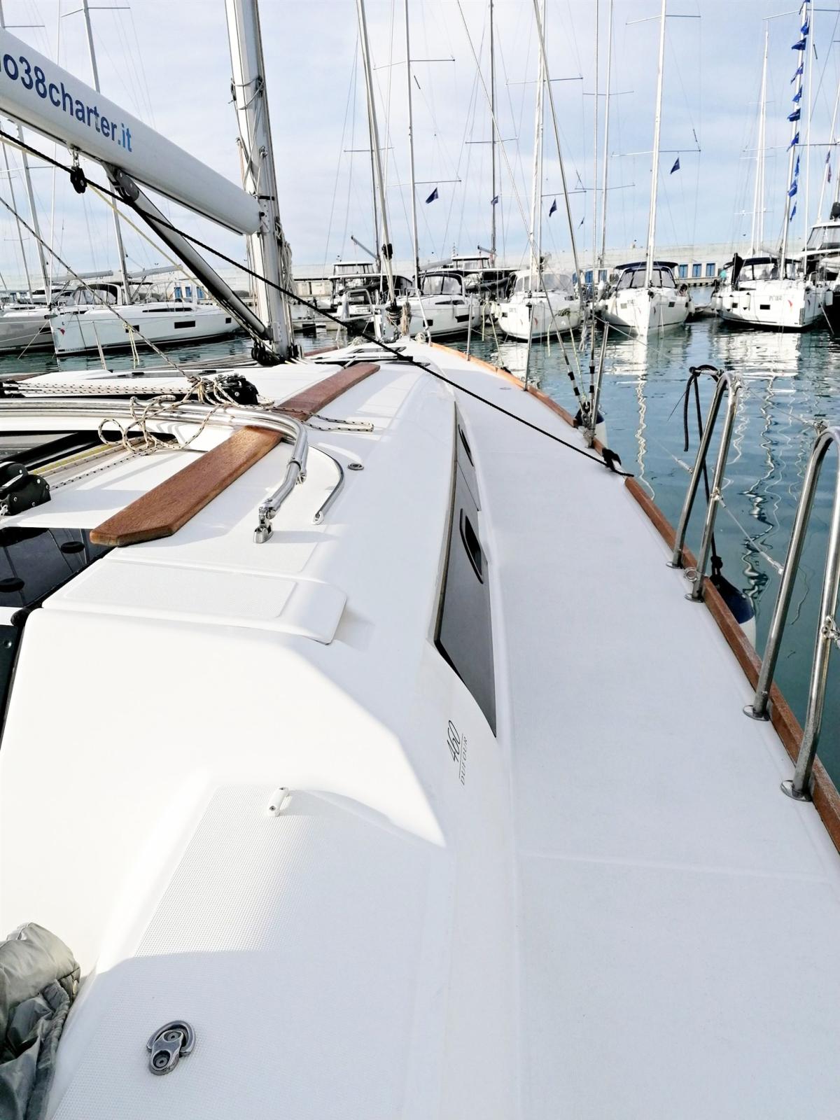 3 double cabins and 2 bathrooms, 8 berths (6+2), light oak interior, Volvo 75 hp turbo engine, overall length 14.15 m (13.50 m CE certified), retractable bow thruster, battened mainsail and self-tacking jib, lazy bag, lazy jacks, sprayhood, bimini, complete Raymarine electronics with gps in the cockpit, cockpit bottom and swim platform in teak, dinette cushions in eco-leather, etc.