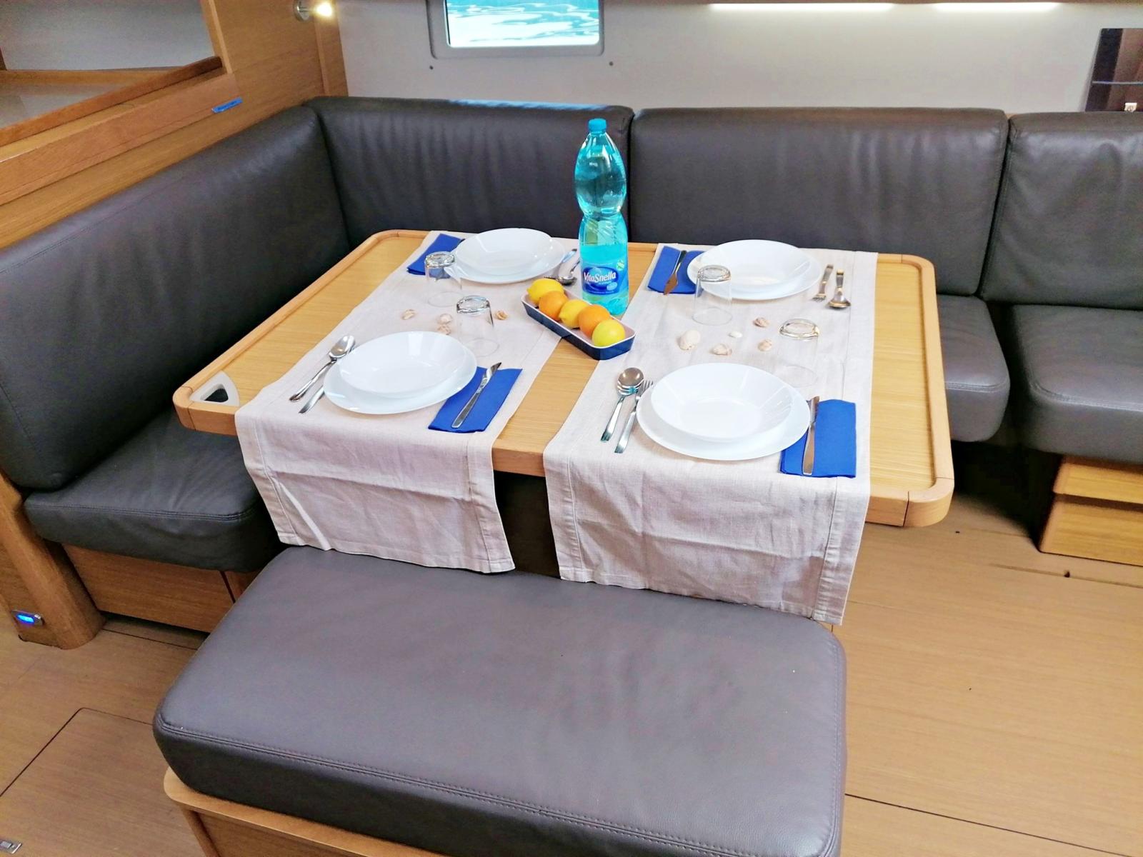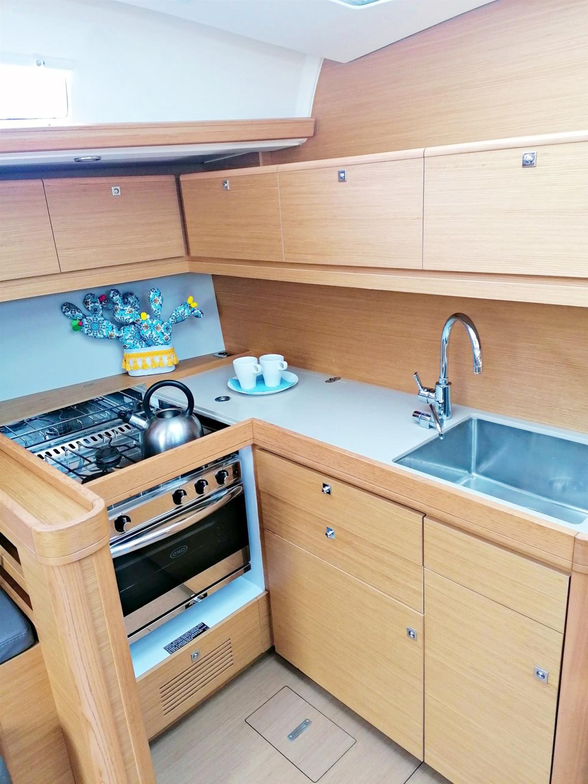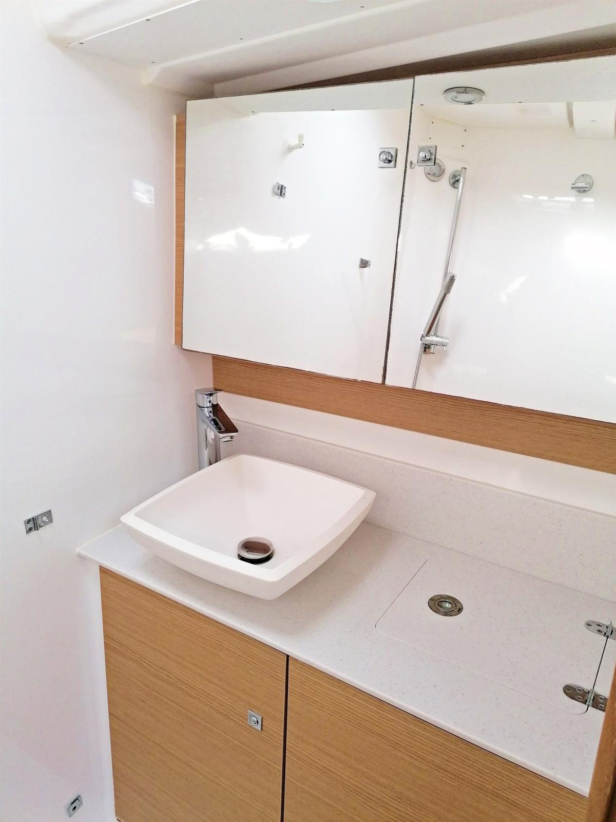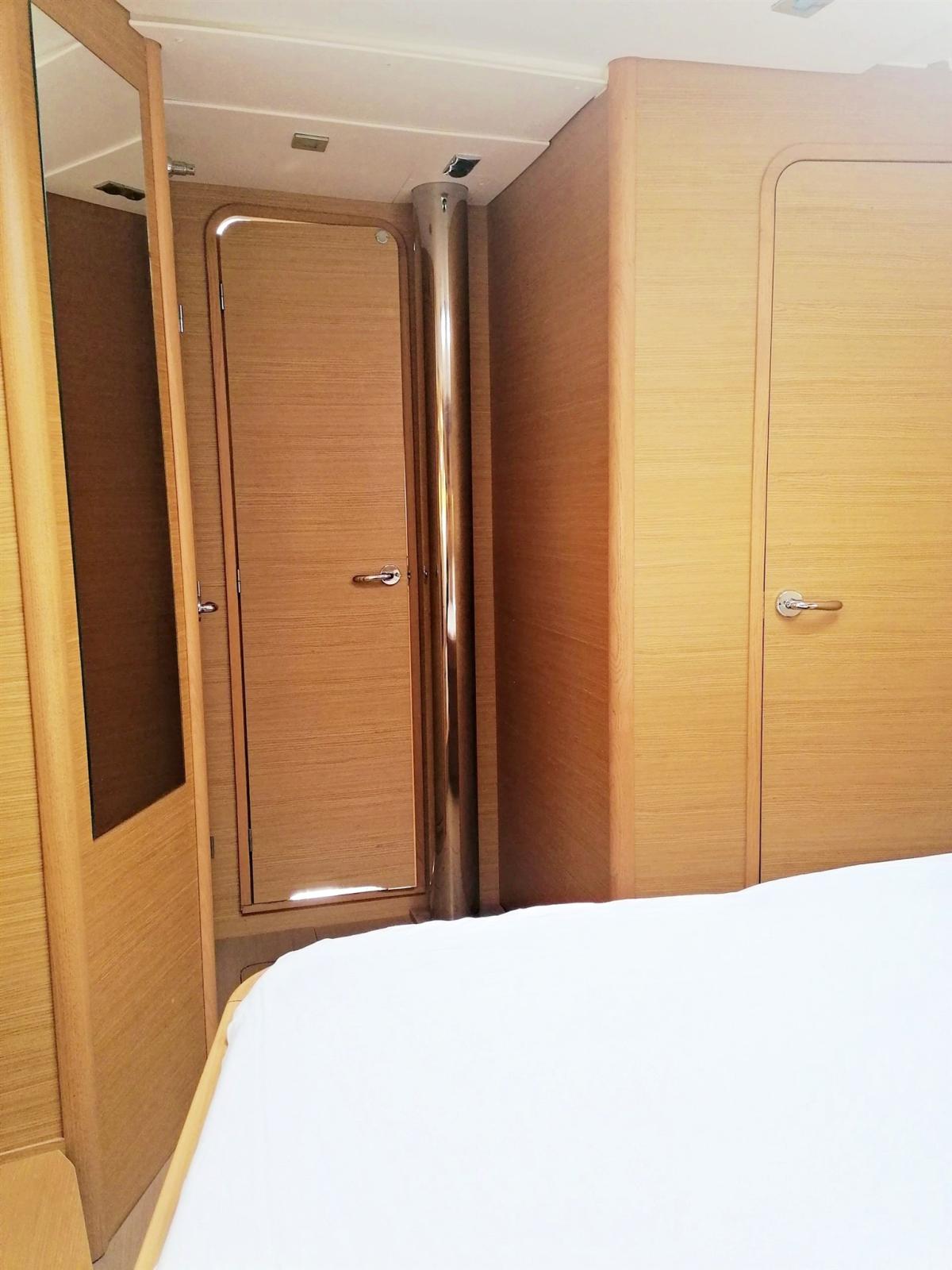 3 double cabins and 2 bathrooms, 8 berths (6+2), light oak interior, Volvo 75 hp turbo engine, overall length 14.15 m (13.50 m CE certified), retractable bow thruster, battened mainsail and self-tacking jib, lazy bag, lazy jacks, sprayhood, bimini, complete Raymarine electronics with gps in the cockpit, cockpit bottom and swim platform in teak, dinette cushions in eco-leather, etc.