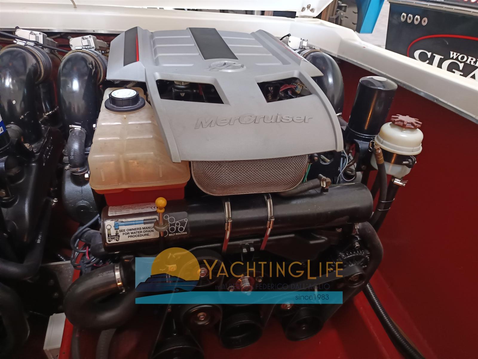 Boat with white hull and blue band - 496 HO engines and Bravo One Xr feet installed new 2010 - Wheelhouse replaced 2018 - Hull brought to gelcoat, upholstery and colored bands 2018 - Transom and platform repainted 2018 - Internal and external carpet 2018 - Stereo 2018 - Lightweight and removable sun awning - N°4 new exhaust manifolds 2021 - Coolant replaced 2022 - New batteries 2025 - N°1 new fuel pump and salt water pumps overhauled - Extraordinary maintenance with engine and foot unloading 2025 - Exhausts with silencing valve 2025 - Additional sea intakes for engines in the hull - Unloading for stern foot control with seal replacement 2025 -