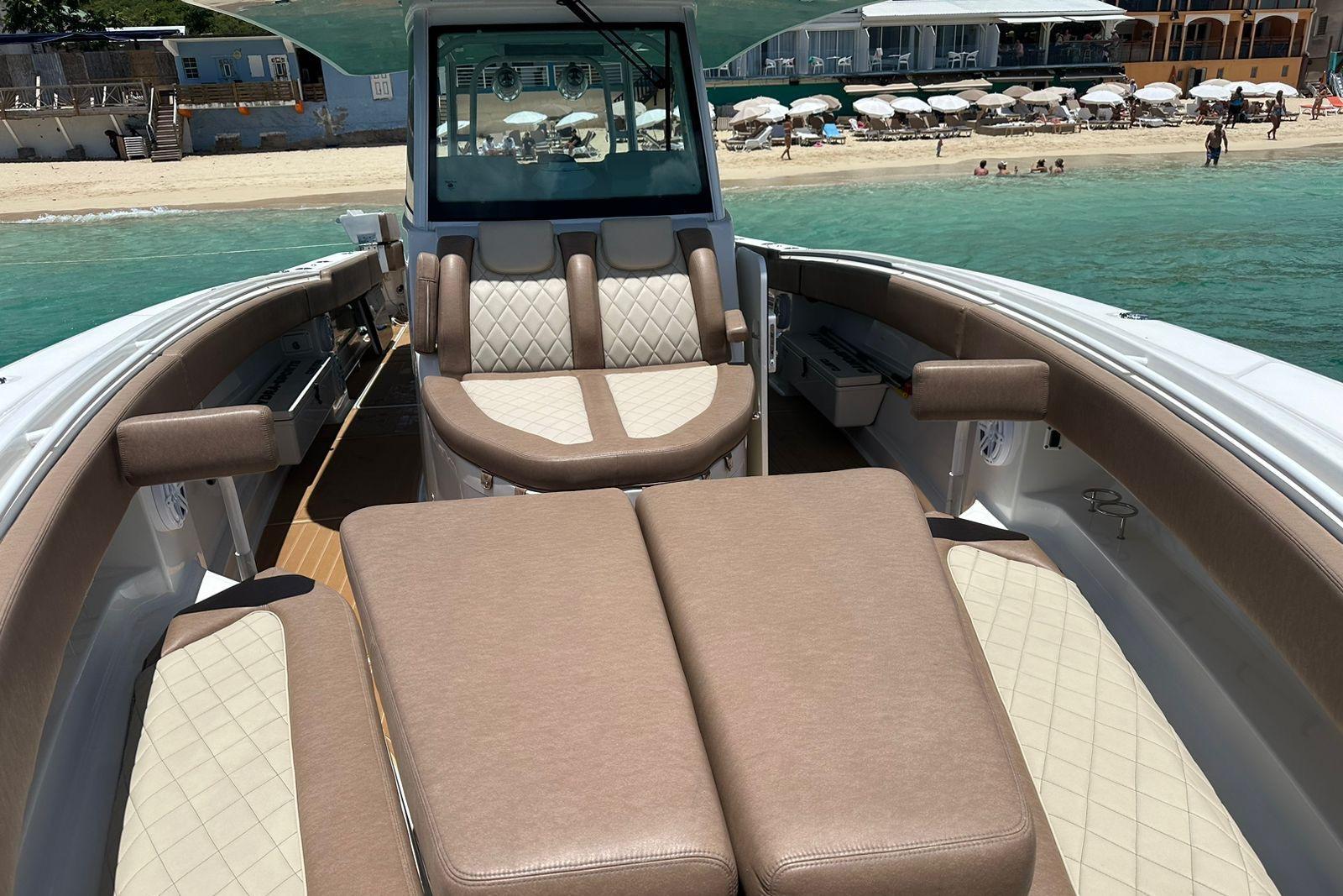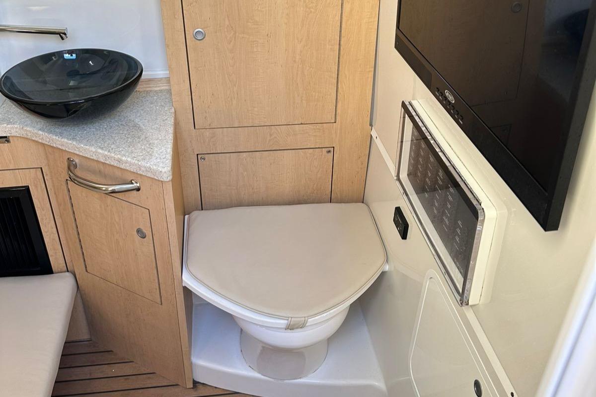 Additional InformationHCB 42 SIESTA Year 2018 Hull color: Navy Blue Hard top Roof ENGINES YAMAHA QUAD F350 – only approx..450 hours Joystick control LAYOUT 1 x cabin Airconditioning INTERIOR VINYL and maple TV Electric toilet UPGRADE STEREO SYSTEM : 4-7,7” & 4-8.8” SPEAKERS 4-10 SUBWOOFERS 2 -8.8” TOWER CANS UPGRADED UPHOLSTERY COCKPIT. VINYL -HARMONY ULTRA LEATHER SUMMER KITCHEN- 12V REFRIGERATOR ,SINK ,GRILL AND STORAGE Led Underwater lights Bow table: power lift , converts into large sunbed Twin Seating bench at transom with cupholders Twin Seating bench in front of console with cupholder 3 x seatings with armrest and foot support at helm station 2 x Seating at 2nd Row with cupholders Swing door at transom Windshield with wipers ` Shore power connection Canvas protection covers for all seating Electronics Garmin navigation pack: Garmin Triple 7612-2 &7412-1 Radar Autopilot Satellite TV receiver to chart plotter Joystick control OTHERS TRAILER