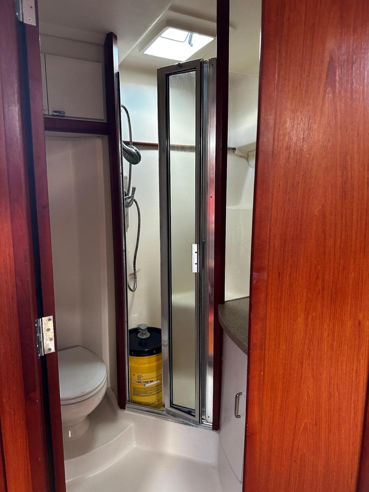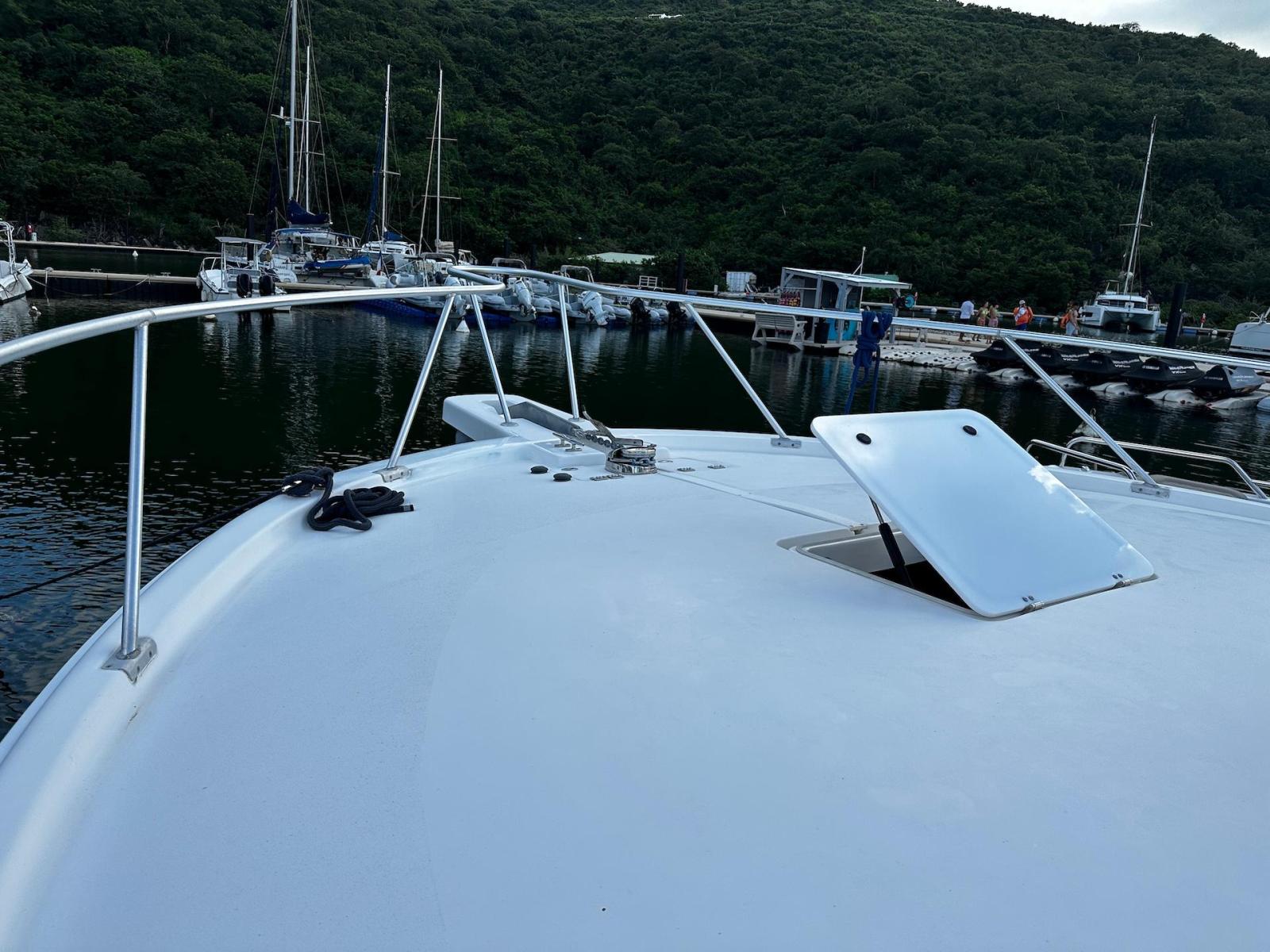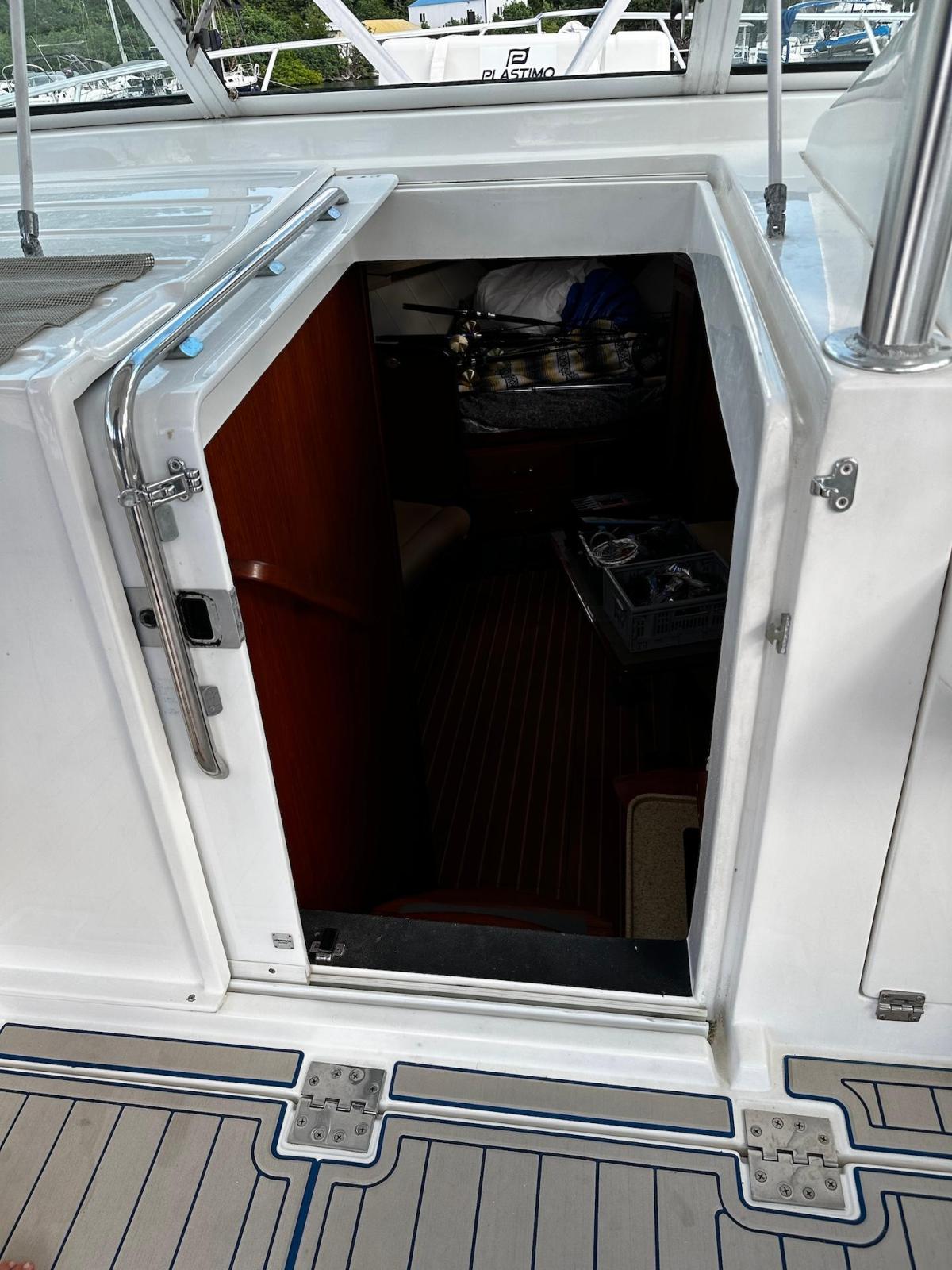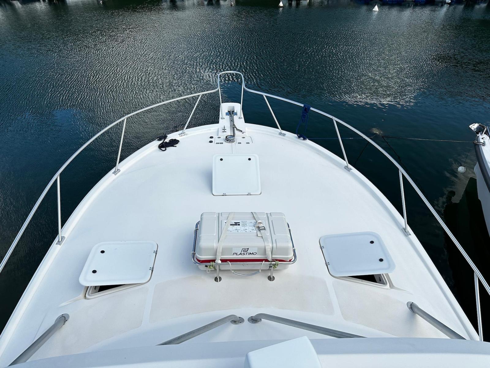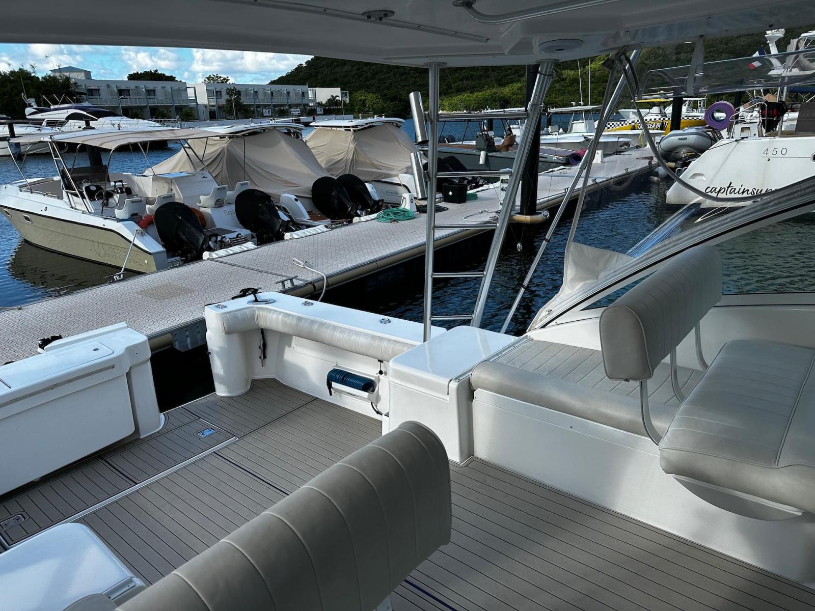 SpecificationADDITIONAL PARTICULARS:Combined estimated Brake Horse Power: 960Estimated Speed of Ship: 30MPHName & Address of Owner: N/AHull Construction:• Hand laid, moulded fibreglass reinforced fabric.• Hard chine hull with (2) lifting strakes per side in hull with moulded spray chine.• Hull is stiffened by longitudinal stringers with transverse bulkheads and floors.• A PVC and plastic stainless-steel rub rails.Superstructure:• Cored GRP• Fixed glass and stainless-steel framed windows.• There are (3) opening hatches in the superstructure.• An overhead aluminium tube structure supporting a GRP ‘Tuna tower’ structureand helm station above.Decks:• Cored GRP• A non-skid deck tread pattern.• Anchor chain locker at the bow drains through hull topsides.• There are (4) deck hatches opening into the accommodation below.Cockpit:• The cockpit floor is cored with local reinforcement. • An athwartships hatch for access into the engine. The power operated hatchoperated without fault TANKS:Fuel: Total capacity: 400 US gallons.No. of tanks: 1 x 400 gals.Location: Beneath the aft cockpit floor.Construction: Aluminium.Filling, venting monitoring: Fuel level gauges are located at the helm station in theconsole display. Fuel tank vent is aft below the fuel fill in the hull topsides. Fuel fillingstation is on the side deck. Fuel fill hose is approved USCG B1 grade and doubledclamped.Fuel system: Fuel fill and fuel line connection clamps to engines and generator areapproved USCG grade A1. The main engines are supplied via individual ‘Cpar’water/fuel separators. Manually operated valves are on top of the tanks.Fresh Water Tanks & System:Total capacity: 94 US gallons.No. of tanks: 2 x 47 galsTank construction: Polyethylene, located port and starboard outboard of the engineroom.Filling, venting & monitoring: A water level gauge is located aft in the cabin. Water fillstations are port and starboard on the cockpit side decks. Venting is below the decks inthe hull topsides. Fresh water system: A ‘Jabsco’ Par Max 12-volt DC freshwater pressure pump andaccumulator. An ‘Attwood’ 120volt AC 6gal hot water boiler is located forward on thestarboard side of the engine room. The pump and boiler were test operated withoutfaults.Plumbing piping and faucets: Red and blue press fit plastic non-toxic, well run andsupported.Grey Water System:Type: Gravity drains from the shower and the air -conditioning condensate into an‘Attwood’ plastic collection box beneath the floor in the cabin bilge under the companionway steps. The pump out system has a ‘Rule’ submersible 12volt DC pump andautomatic float switch. The system was test operated without faults.Holding Tank & System:No of tanks: 1Construction: Plastic/NylonCapacity: 30 US gallonsLocation: Center bilge in the engine room.Venting: Vents through the hull topsides.Head type: ‘Sealand’ 12-volt electric vacuum flush system, test operated without faults.Number of Heads: (1) The vacuum tank is located port side in the engine room abovethe engine and operated without faults.Discharge: A 12 -volt ‘Pentair’ macerator pump discharges the holding tank directlyover board from a 3-way valve. (Closed, overboard or to waste tank) The pump was testoperated from a switch on the main switch board (MSB) without faults.Bilge Arrangement & pumps:The yacht has (3) bilge compartments, all protected by ‘Rule’ 12-volt DC submersiblepumps with automatic float switches.Locations: Aft of the engine room on centreline. Forward of the engine room behind thebulkhead and beneath the companionway stairs. All pumps were test operated fromtheir automatic float switches and from the helm console manual switches.Bilge alarms: An audible high bilge water level alarm installed aft in the engine roomwas test operated. MAIN ENGINES &EXHAUSTS:Engine manufacturer:YanmarHours: Port: 1850Starboard: 1850Model: Both enginesare 6LY3-ETPSerial Nos: PortM60820 and M60827starboardPower: Both enginesare rated at 480HP@3800 rpmThe engines are 4-point resilient mounted forward and aft and connected directly to thegear boxes.Main Engine Exhausts: 5” reinforced rubber hoses connected to the water-cooledengine turbo elbows run aft and exit port and starboard in the transom. The system wasseen without any signs of deterioration, restrictions or leaks.Engine cooling system: Bronze Sea strainers with baskets connected to through hullvalves, supply the raw water through 2” reinforced rubber hoses that were seen withoutany signs of deterioration, restrictions or leaks.Main Engine Controls: Yanmar electronic throttle, twin lever combined throttle andshift units located at both of the helm stations that were seen operating without faults.Engine appearance and operation: The engines were seen in a maintained condition.They started easily, idled smoothly without interruption and at maximum revolutionsboth were without faults. See Sea Trial.GEAR BOXES:Manufacturer: ZF Hurth MarineType: Direct drive model: 85A -2.5Serial numbers: Port:29015R Starboard:29017RGear shift: Yanmarelectronic. Gearbox appearance and operation: Both boxes were seen in a maintained condition.They operated without faults during the sea trial.RUNNING GEARPropeller shafts: 2 1/4” stainless steel that did not hold a magnet.Shaft seals. Water cooled dripless seals that both displayed 890 F when underway anddid not show any signs of leaking.Steering: Hydraulic ‘Sea Star’ with wheels at both lower and upper stations.Rudder shaft seals: Packed seals on 2” stainless steel shafts that were seen withoutany signs of leaking.Tillers and connecting bars: The rudder tillers and connecting bar are stainless steeloperated by a bronze hydraulic ram. Ther connections were seen secure, withoutrestrictions or excessive wear and operated without fault.TRIM TABSManufacturer: ‘Bennett’Type: Electro hydraulicOperation: The tabs were seen operating correctly during the sea trial.AUXILIARY MACHINERYGenerators & Exha