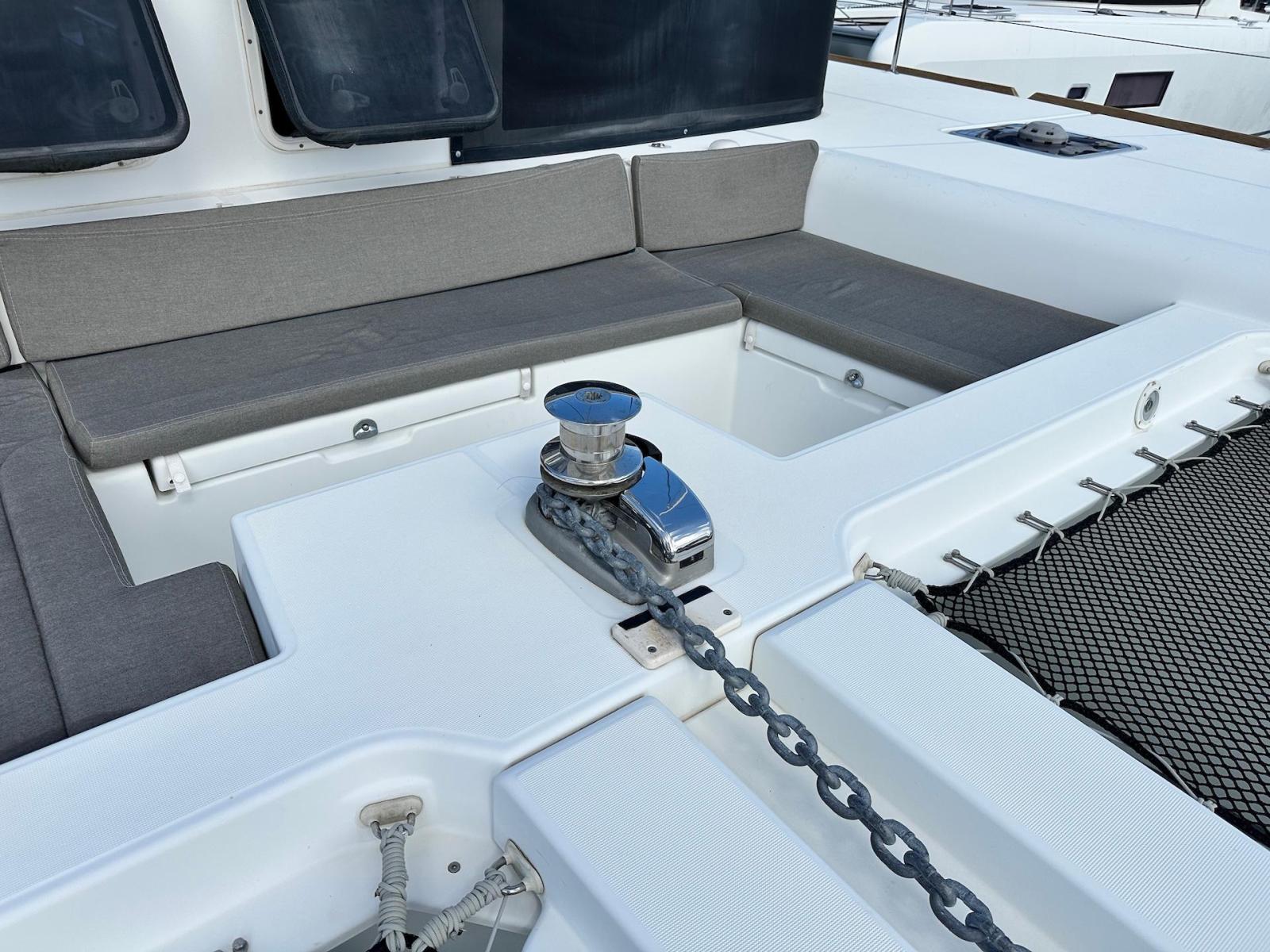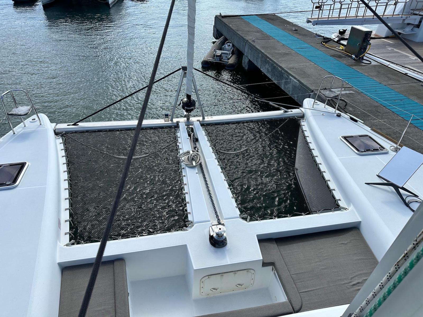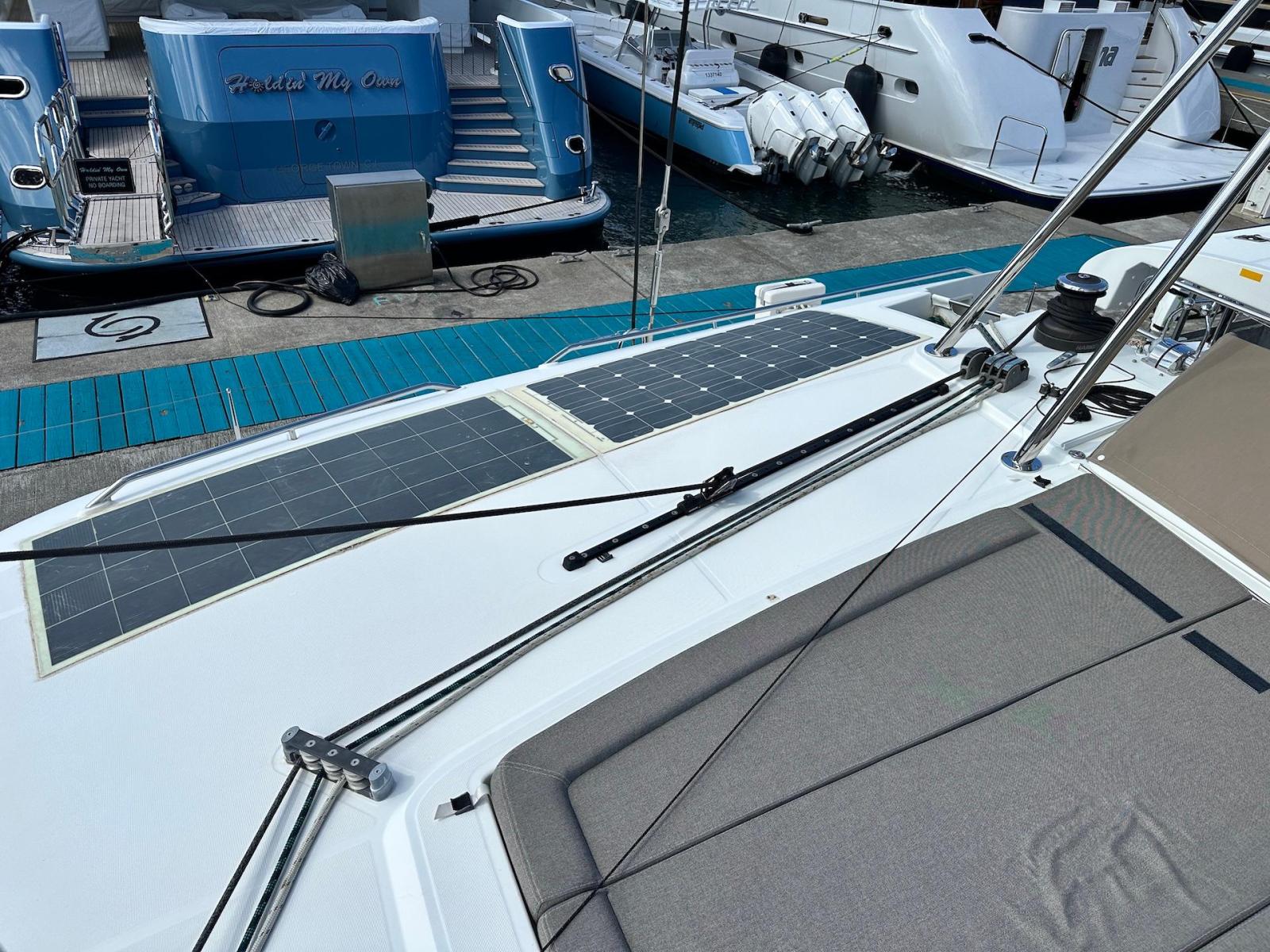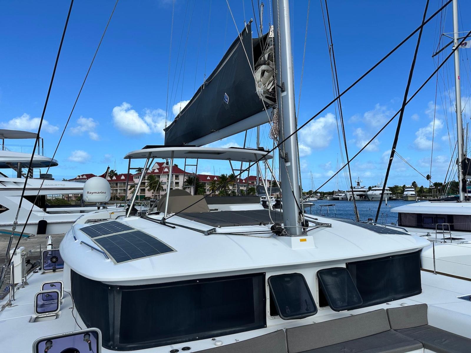 SpecificationInterior Equipment:• 4 x A/C Units (Cruisair 48,000 BTU) – Factory Installed• 6 x 2-speed fans• Watermaker AQUA-BASE• 6-filter + remineralizer drinking water filtration system (2023)• Washing Machine (BEKO, 5kg)• 2 x TVs with Raymarine Antenna• Fusion MS-RA 70 Sound System with 6 built-in speakers• Safe (Installed 2023)• New Carpet (2023)• New Mattress in Owner’s Cabin (2023) Galley:• Propane Oven & Stove (ENO) + 6 propane bottles• Refrigerator & Freezer (Frigonautica)• Microwave (Samsung)• Dishwasher (Electrolux)• Saltwater tap with foot pump• Blender & Coffee Grinder• Full set of dishes and glasses Bathrooms:• 3 x Electric toilets (saltwater flush with macerators)• 3 x Holding tanks• Shower in each bathroom• Teak floors Engines & Propulsion:• 2 x Yanmar 54HP (2,600 hrs)• 3-bladed folding props (Flex-O-Fold, 2021) Electrical & Power:• Cummins Onan Generator (11 KVA, 2,200 hrs)• 4 x Lithium Batteries (2023)• Solar Array (3,000 watts total, 2023):• 4 x 150W flexible solar panels (cabin top)• 4 x solar panels on stainless steel arch (2023)• Victron 5000W Inverter/Charger (2024) – Can power all A/C units Exterior Equipment:• Complete cushion set (cockpit, flybridge, forward sunbathing area)• Teak cockpit• Hardtop Bimini (2023)• Cockpit refrigerator (Waeco)• Passerelle• 48Kg ULTRA stainless steel anchor• 300-foot galvanized steel anchor chain (2023)• Windlass (QUICK) with chain counter + spare Delta anchor, chain & rode• Black trampoline replacement (2023)• Davits Sails & Rigging:• Square Top Mainsail• Roller Furling Genoa• Code 0 on roller furling (2016)• Asymmetrical Spinnaker w/ sock (1.5 oz, 2019)• Storm Jib (2019)• Headstay replaced (2021)• Dyneema Reefing Lines (12mm)• Jib Drum (2023)• 1 x Electric Harken Winch Electronics & Navigation (Raymarine):• Plotter, Depth Sounder, Wind Speed/Direction, Radar, AIS• Autopilot• VHF Radio at Helm & Nav StationExtras & Safety:• 10ft VIPER Dinghy with 15HP Mercury Outboard (electric start, 2019)• Full safety equipment, including liferaft